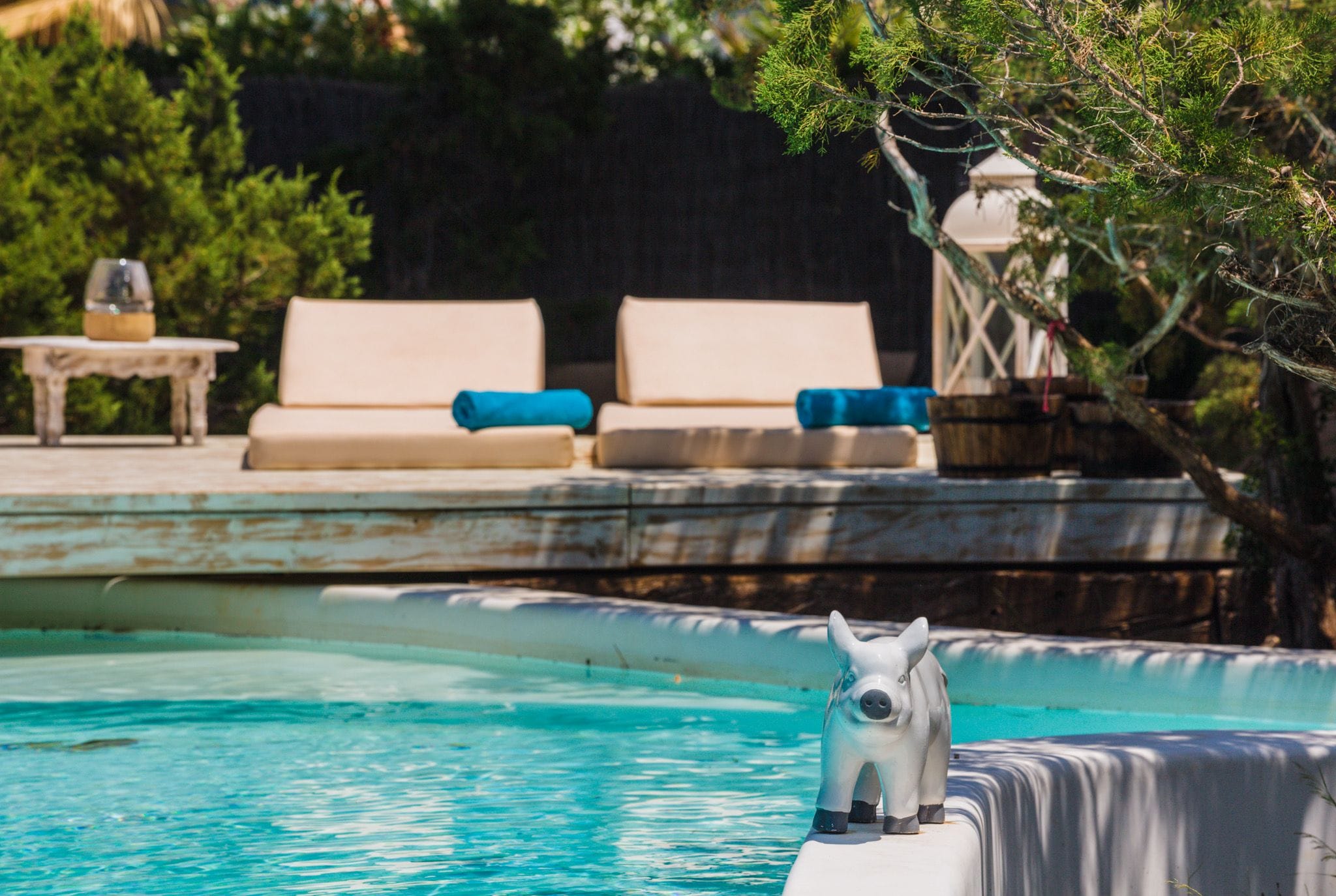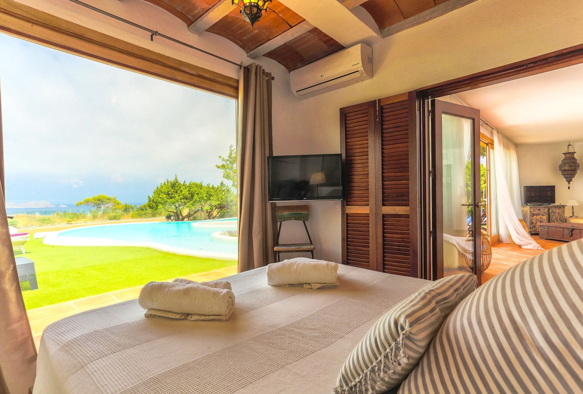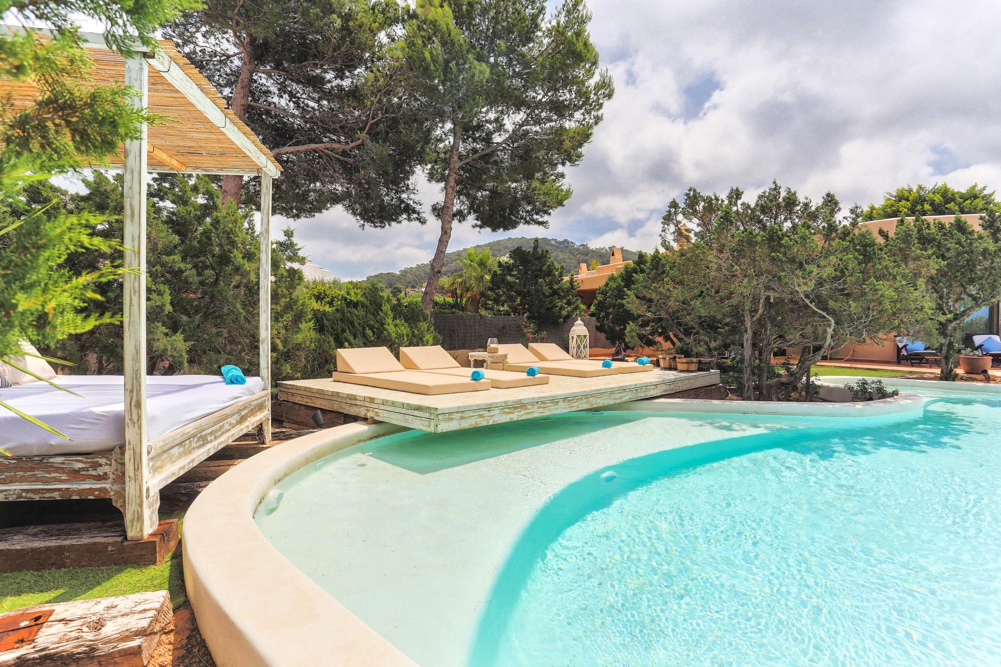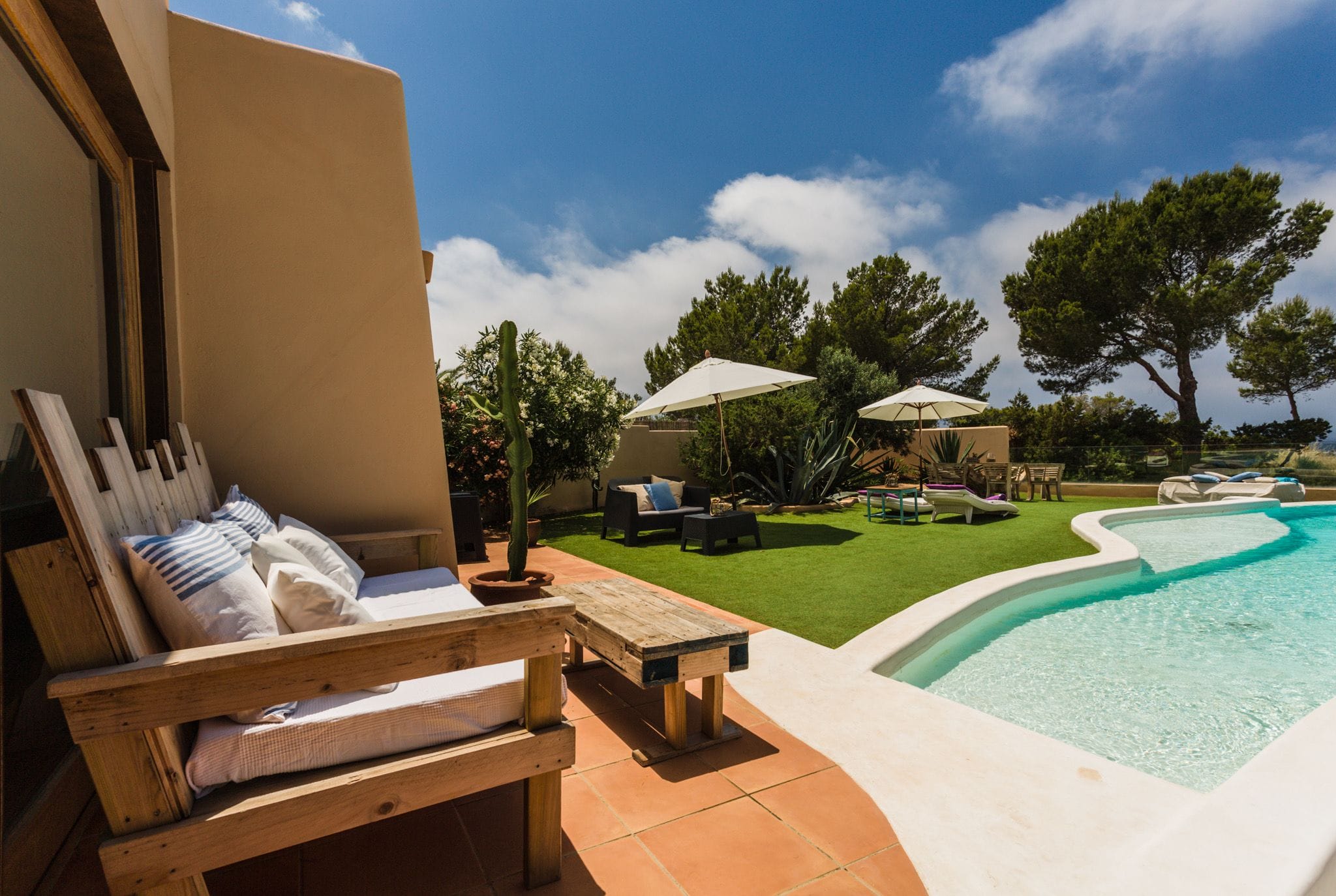 The rooms have beds of 1.80 by two meters. The master suite exemptaq bathtub with views of the sea and the pool, and also a shower. All bedrooms have built in wardrobes. the second suite has a large window overlooking the Mediterranean water and the large swimming pool that dominates the garden. In addition, the outdoor area also has a Moorish oven, and barbecue. They preside over the pool of isas, a Balinese bed and a wooden platform with beds and outdoor mattresses for 8 people.