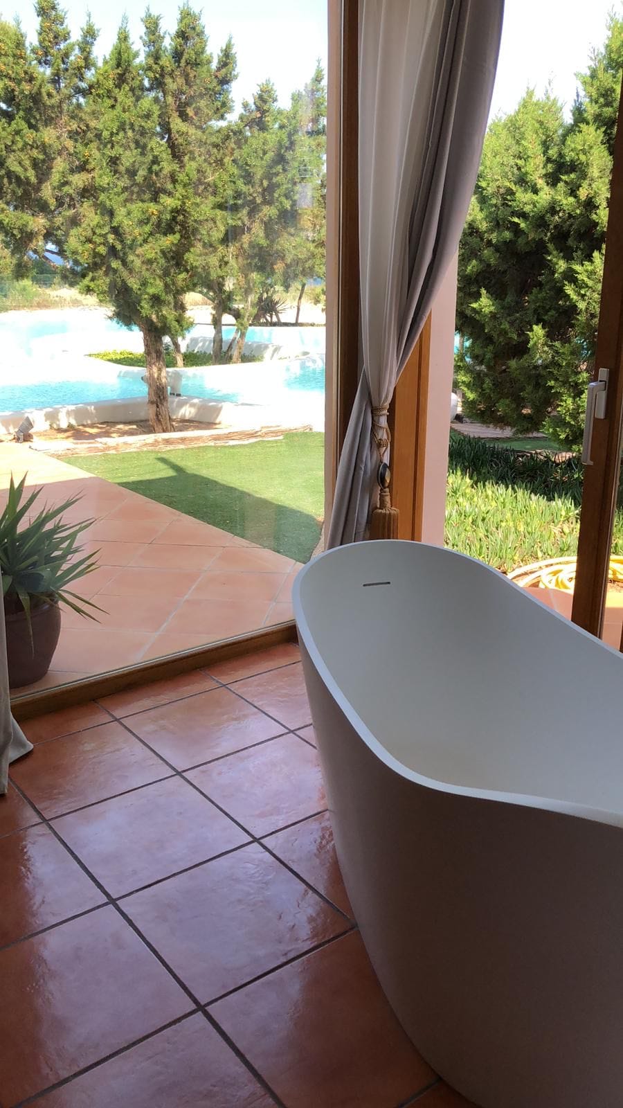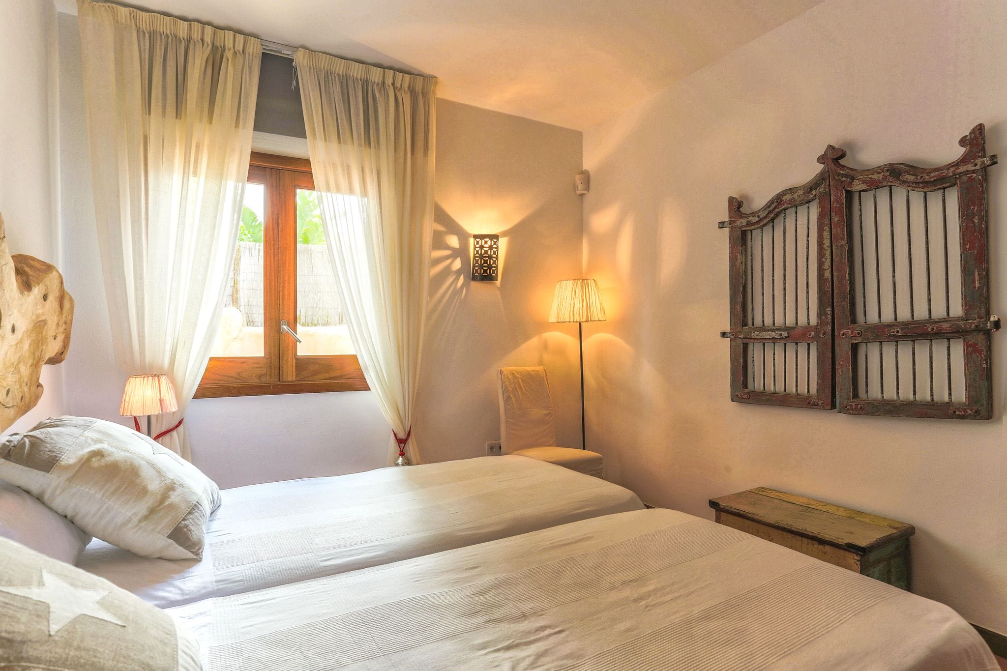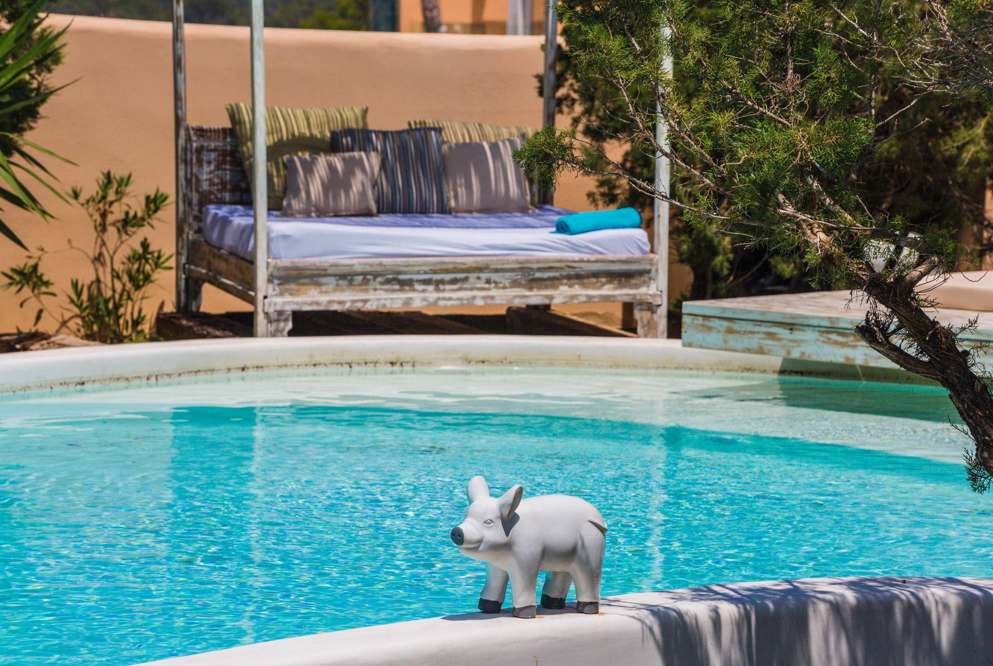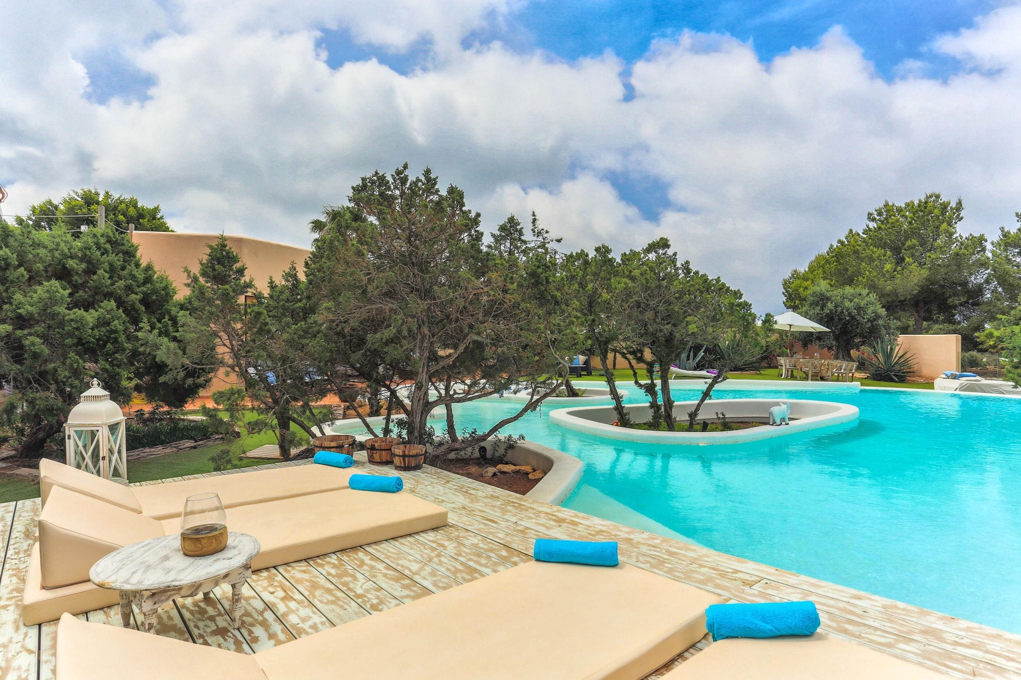 The rooms have beds of 1.80 by two meters. The master suite exemptaq bathtub with views of the sea and the pool, and also a shower. All bedrooms have built in wardrobes. the second suite has a large window overlooking the Mediterranean water and the large swimming pool that dominates the garden. In addition, the outdoor area also has a Moorish oven, and barbecue. They preside over the pool of isas, a Balinese bed and a wooden platform with beds and outdoor mattresses for 8 people.