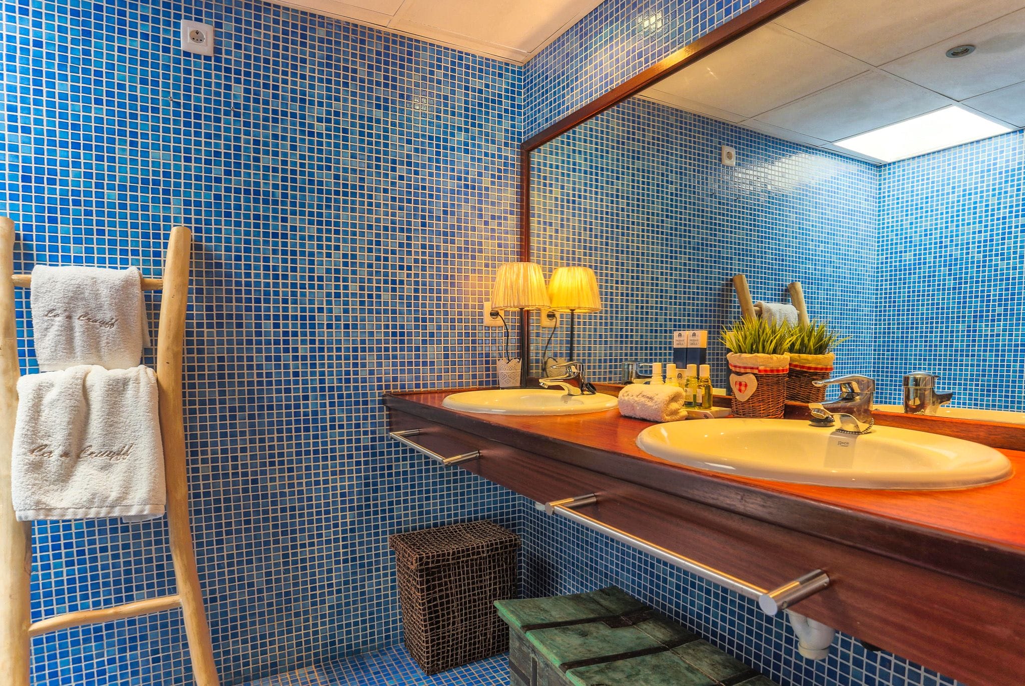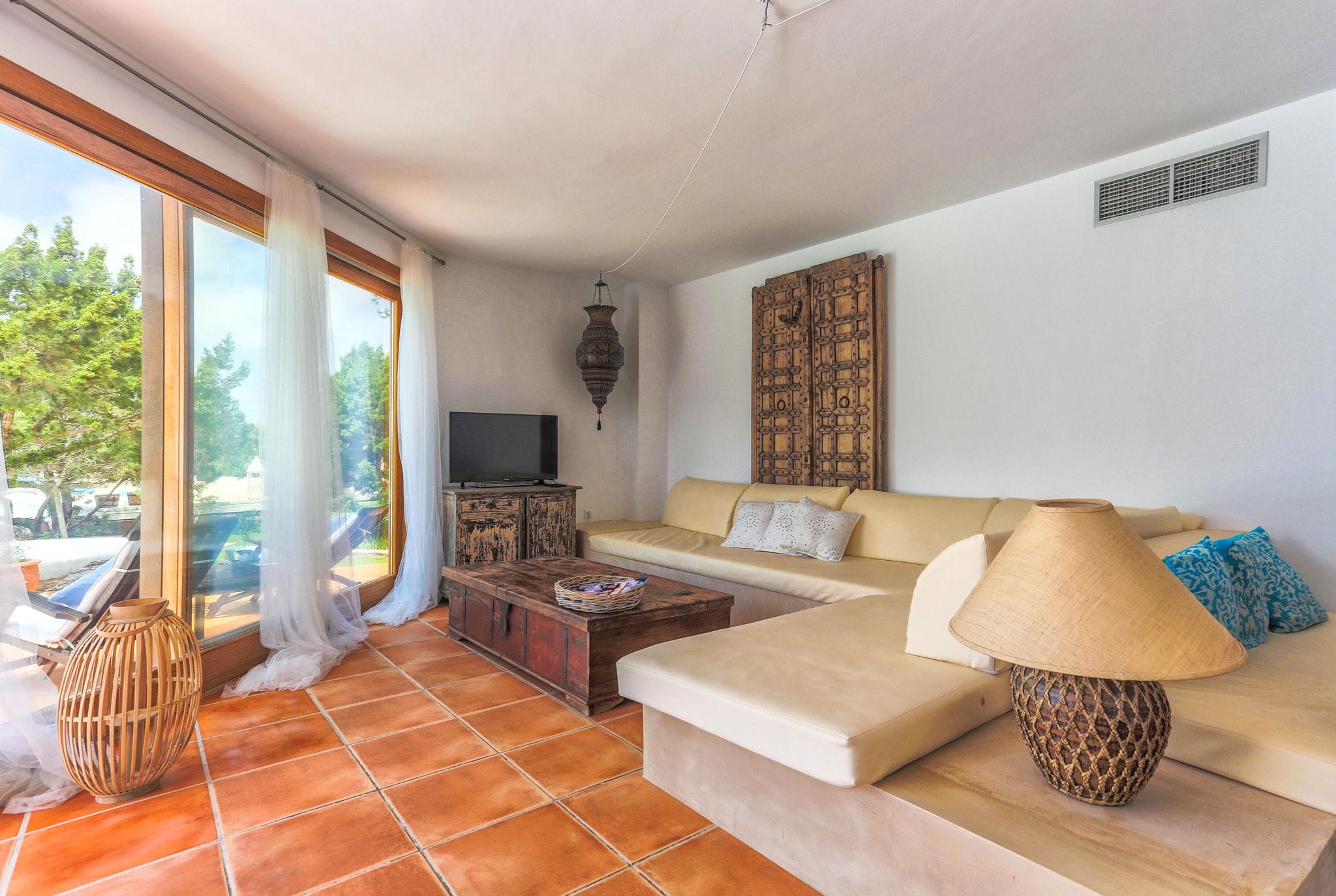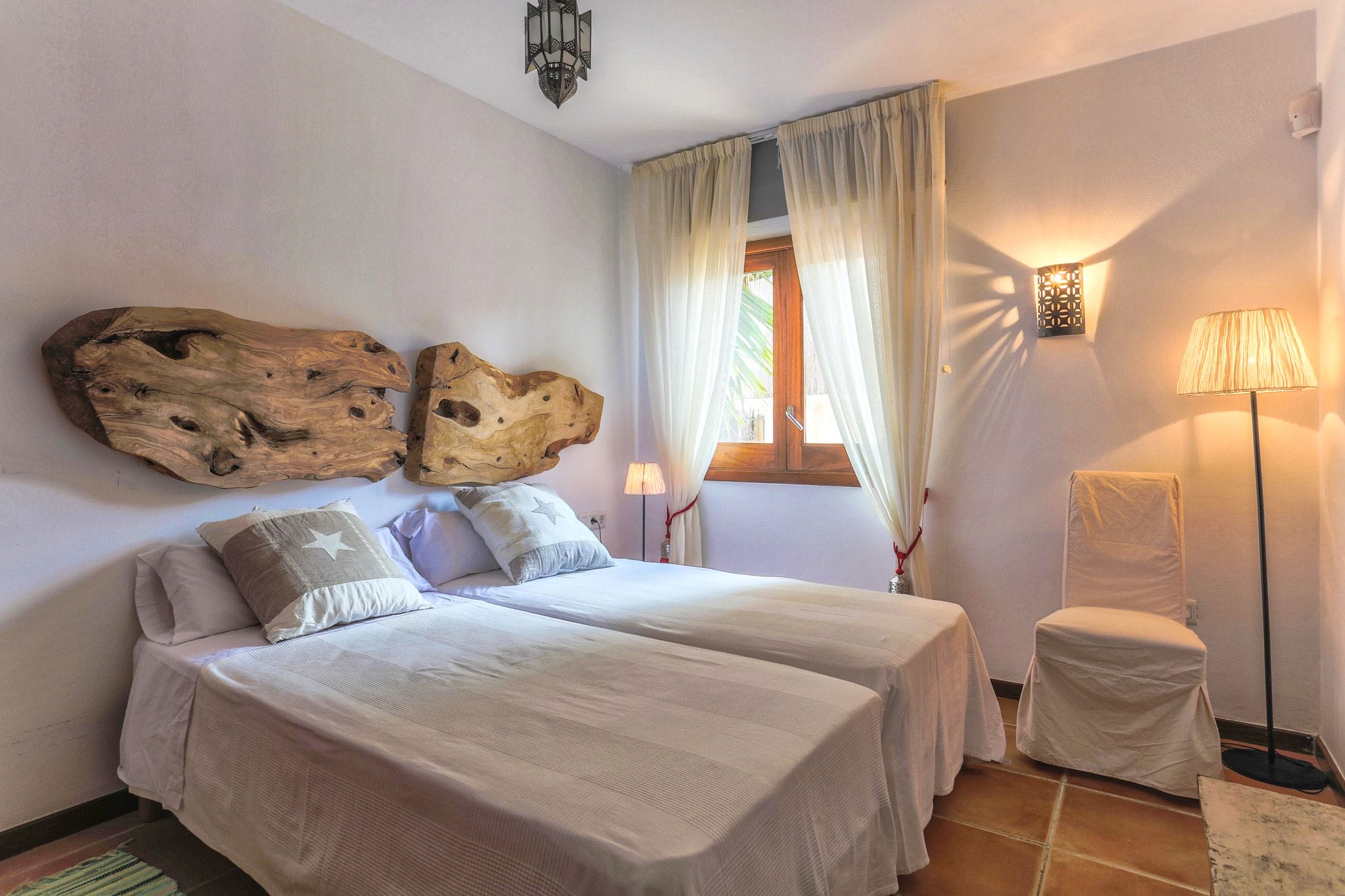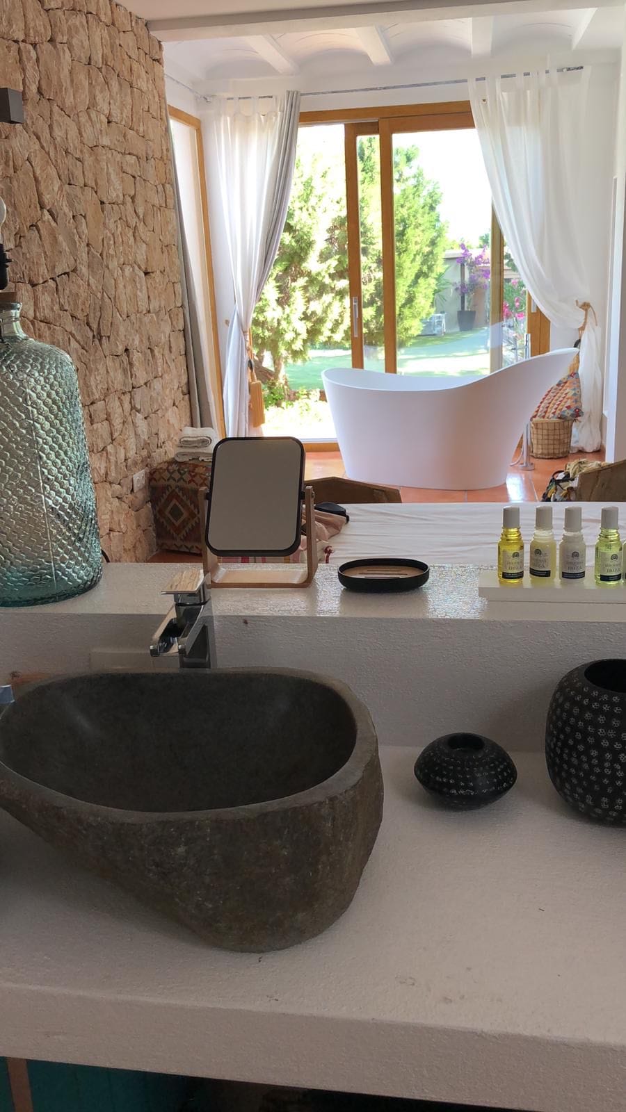 The rooms have beds of 1.80 by two meters. The master suite exemptaq bathtub with views of the sea and the pool, and also a shower. All bedrooms have built in wardrobes. the second suite has a large window overlooking the Mediterranean water and the large swimming pool that dominates the garden. In addition, the outdoor area also has a Moorish oven, and barbecue. They preside over the pool of isas, a Balinese bed and a wooden platform with beds and outdoor mattresses for 8 people.