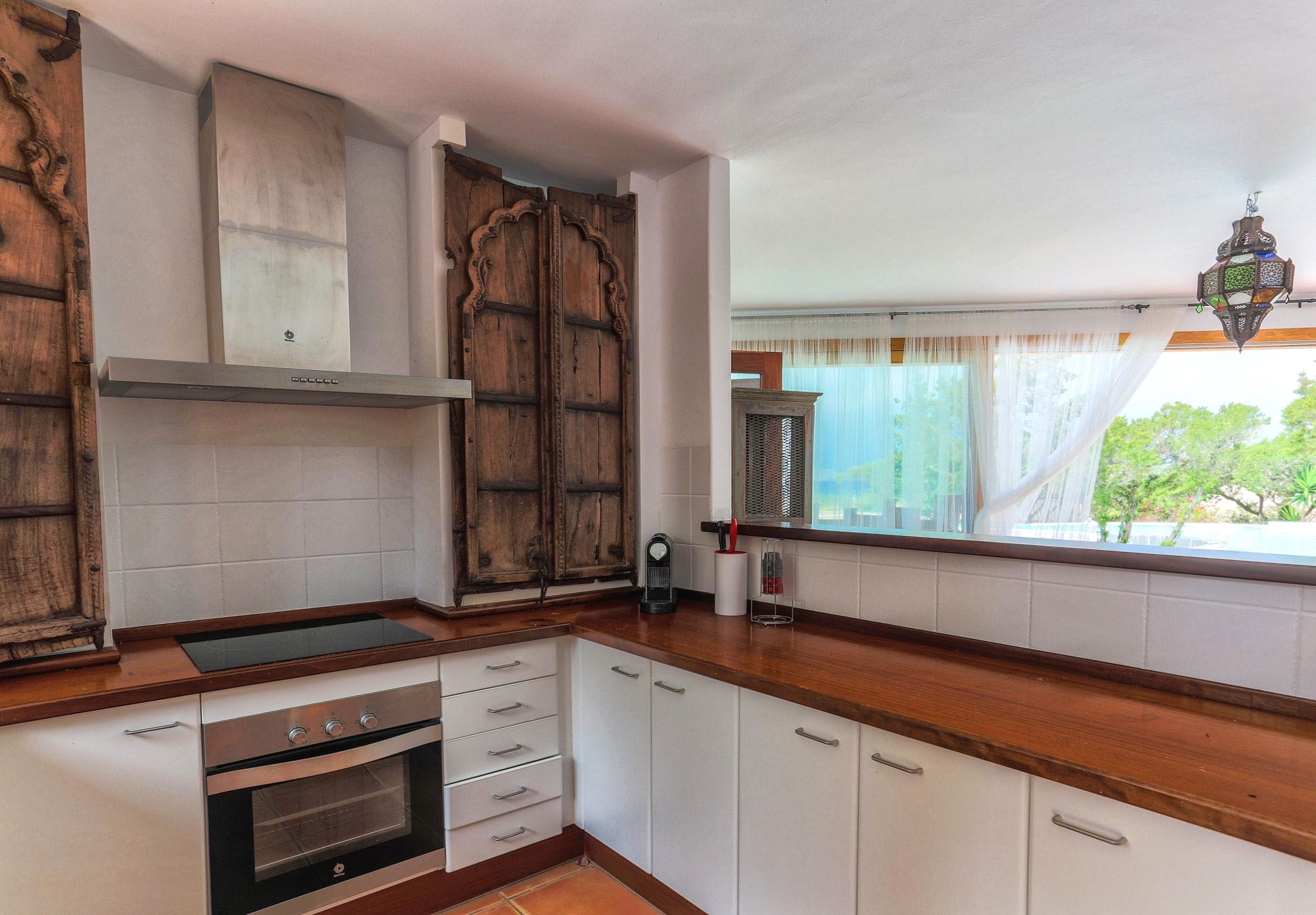 It has 4 double rooms, 2 of them ensuite type, 3 bathrooms and capacity for 8 people. Air conditioning in all rooms and wifi. The house has a beautiful 30-meter living room with dining room, and views of the sea through its large windows. The kitchen, decorated with Moroccan doors is fully equipped, and has a dishwasher and Nespresso.