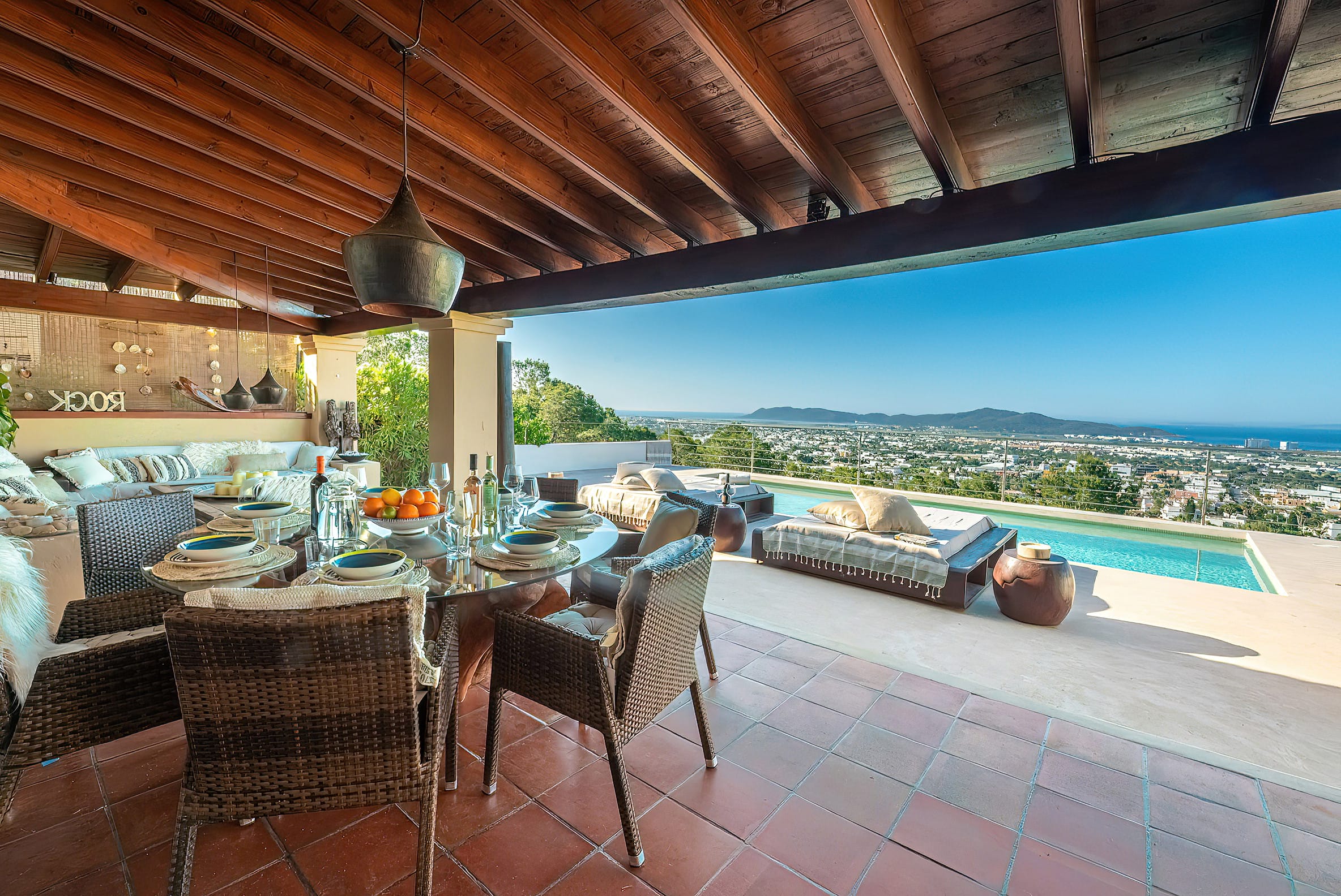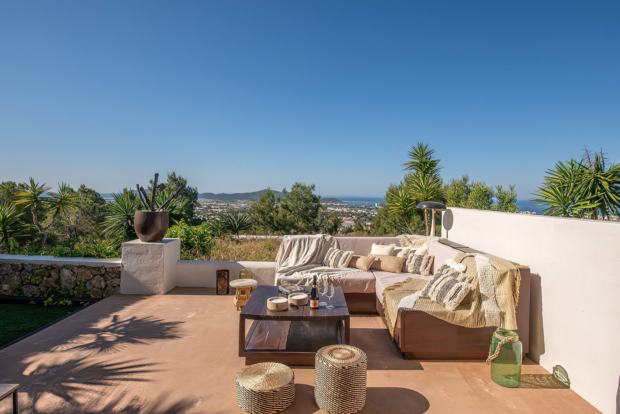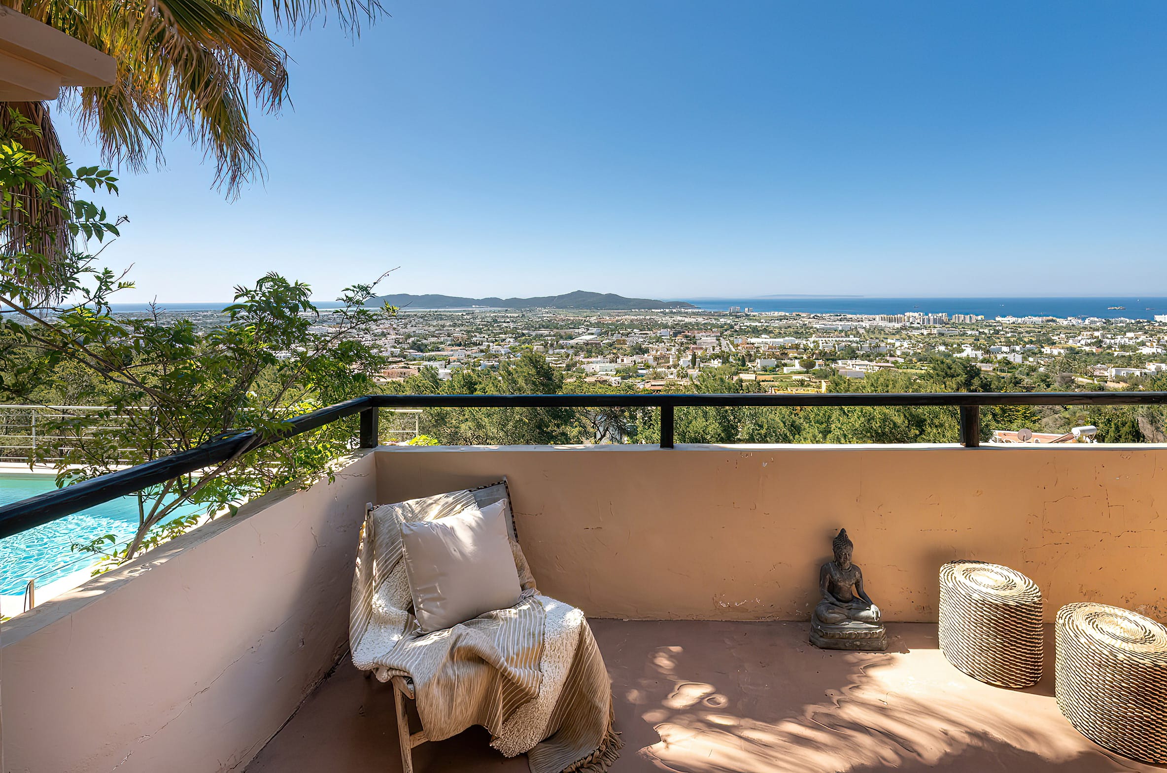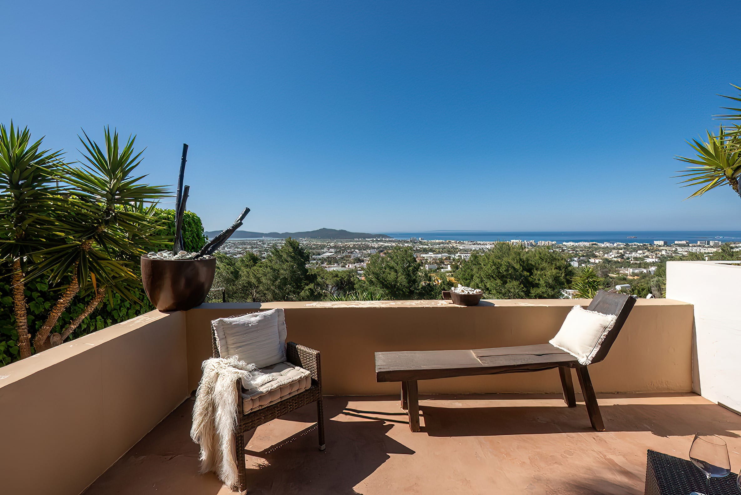 The kitchen is open to the living room and patio, where you can enjoy a 180-degree panorama from Ibiza Town to Salinas and Formentera in the distance.