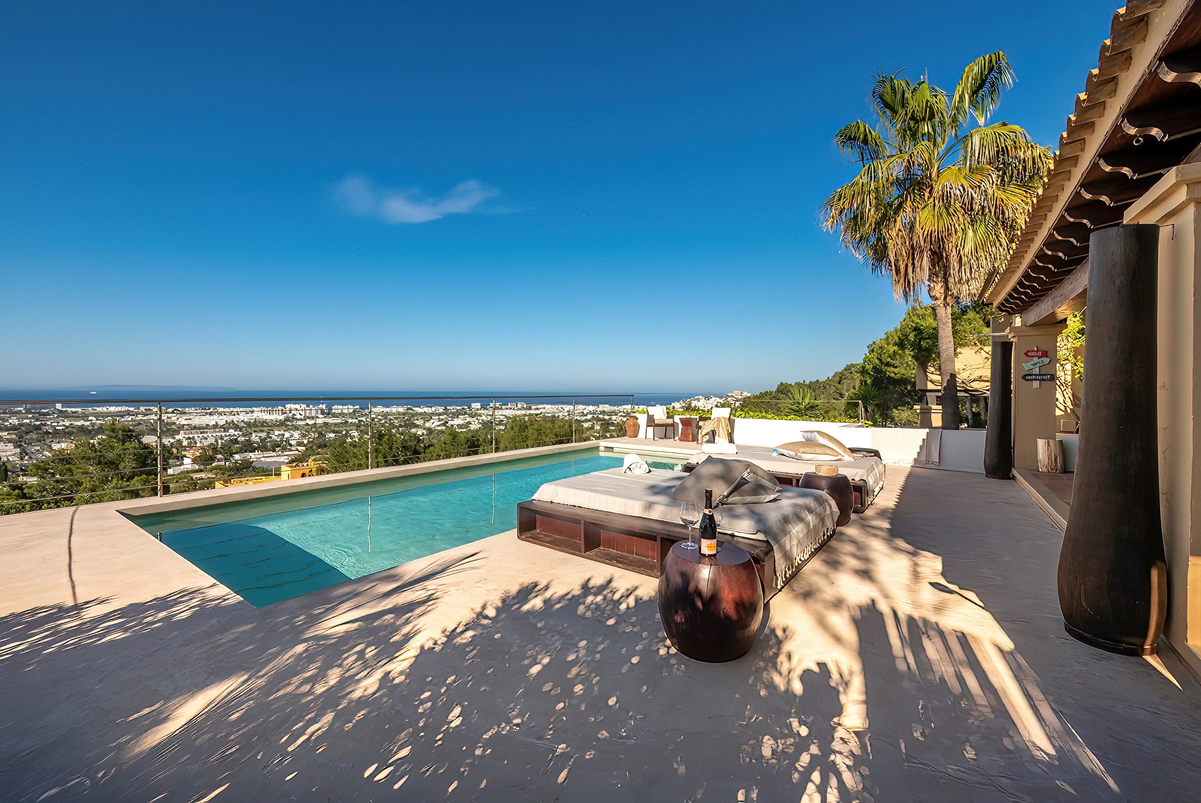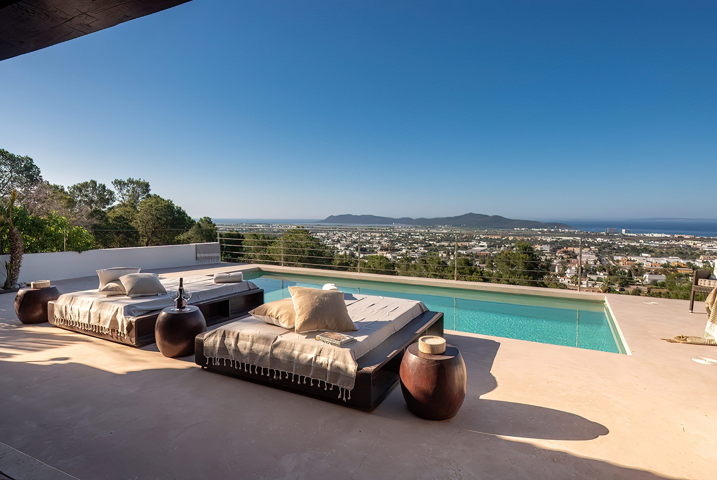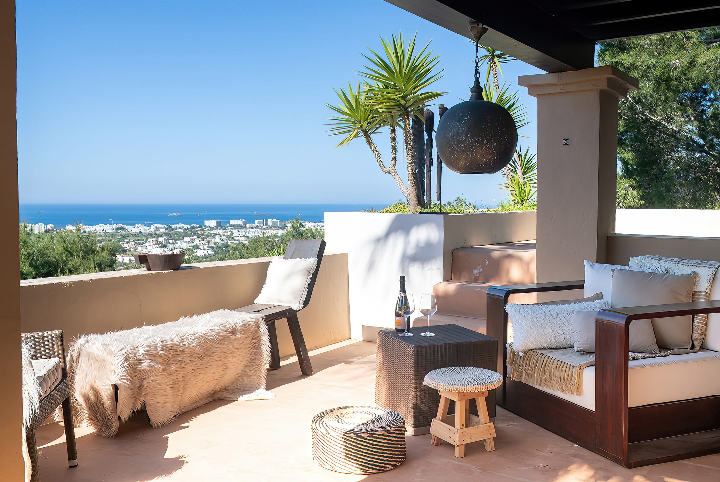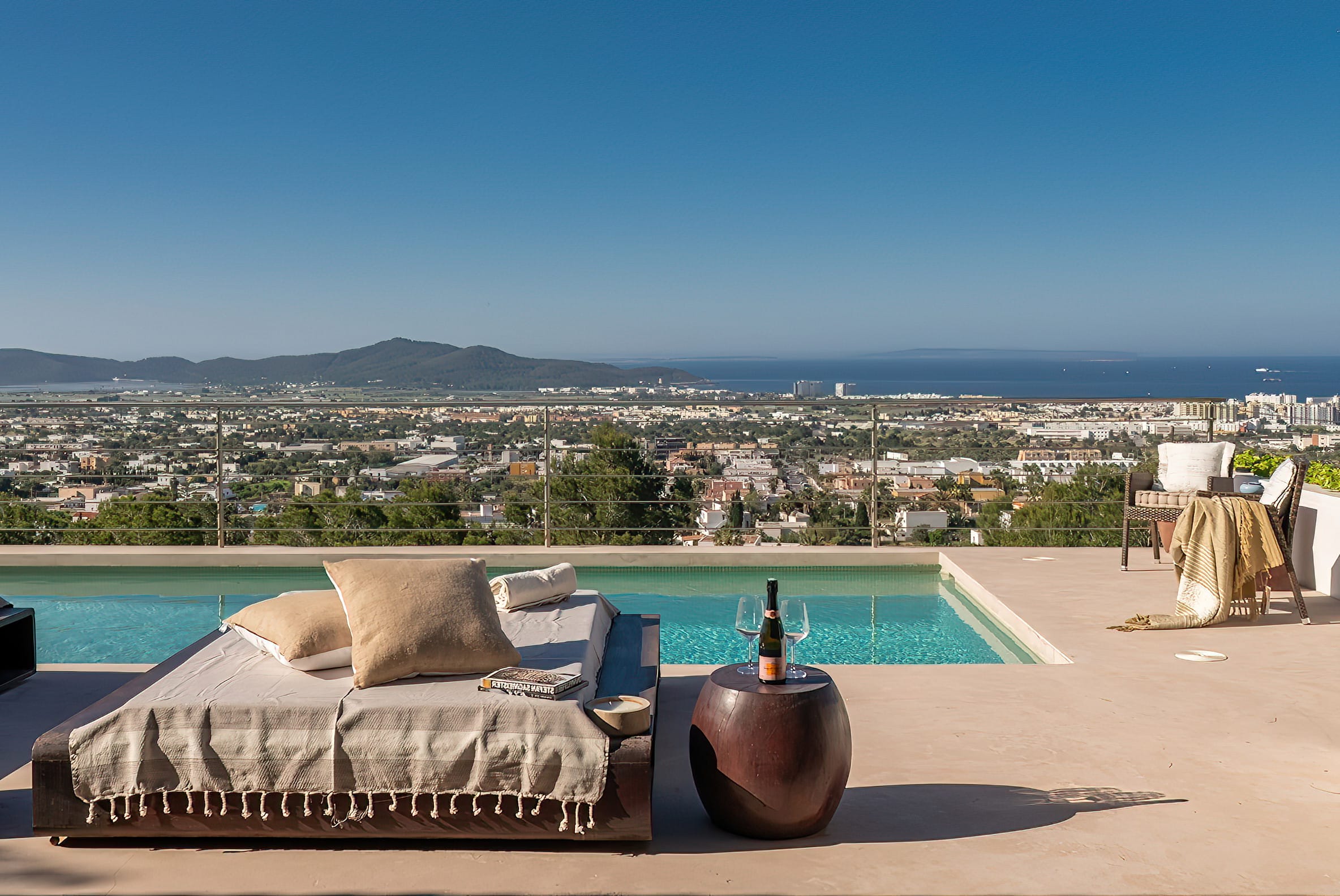 The kitchen is open to the living room and patio, where you can enjoy a 180-degree panorama from Ibiza Town to Salinas and Formentera in the distance.