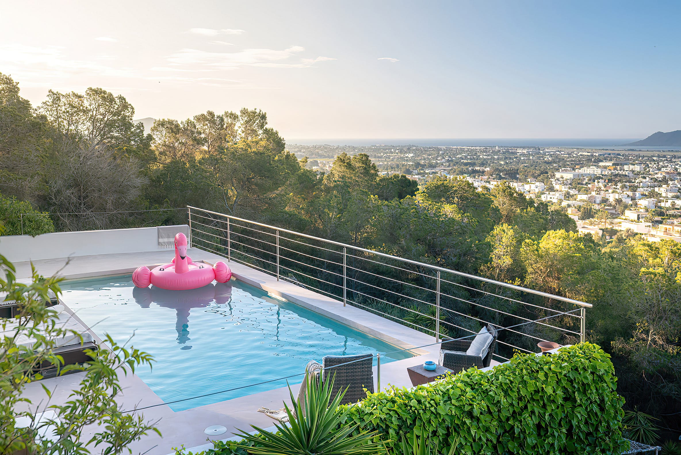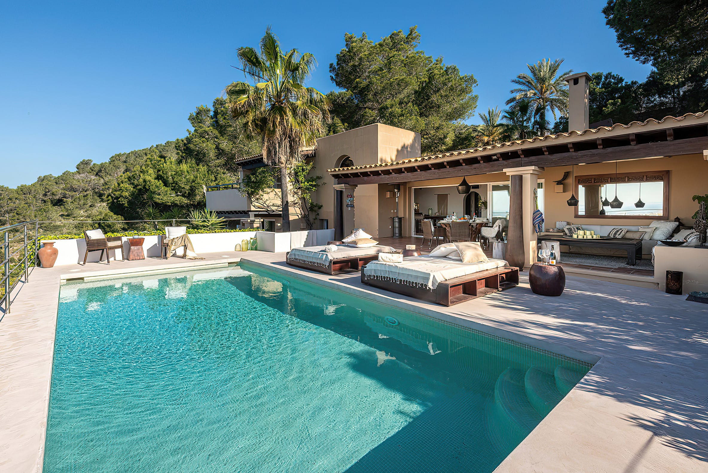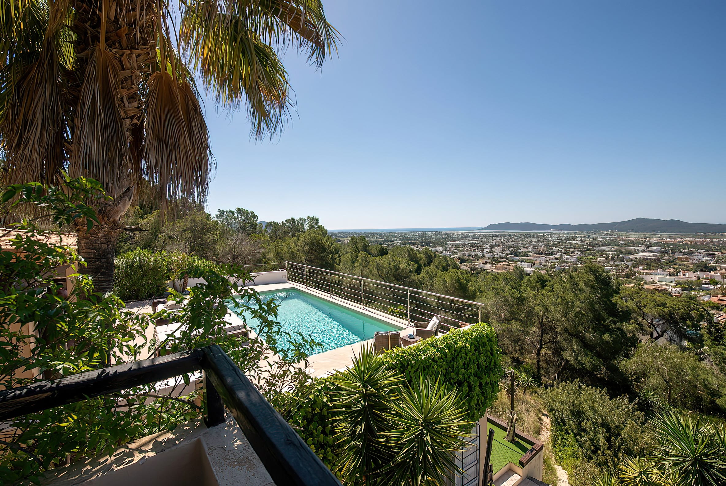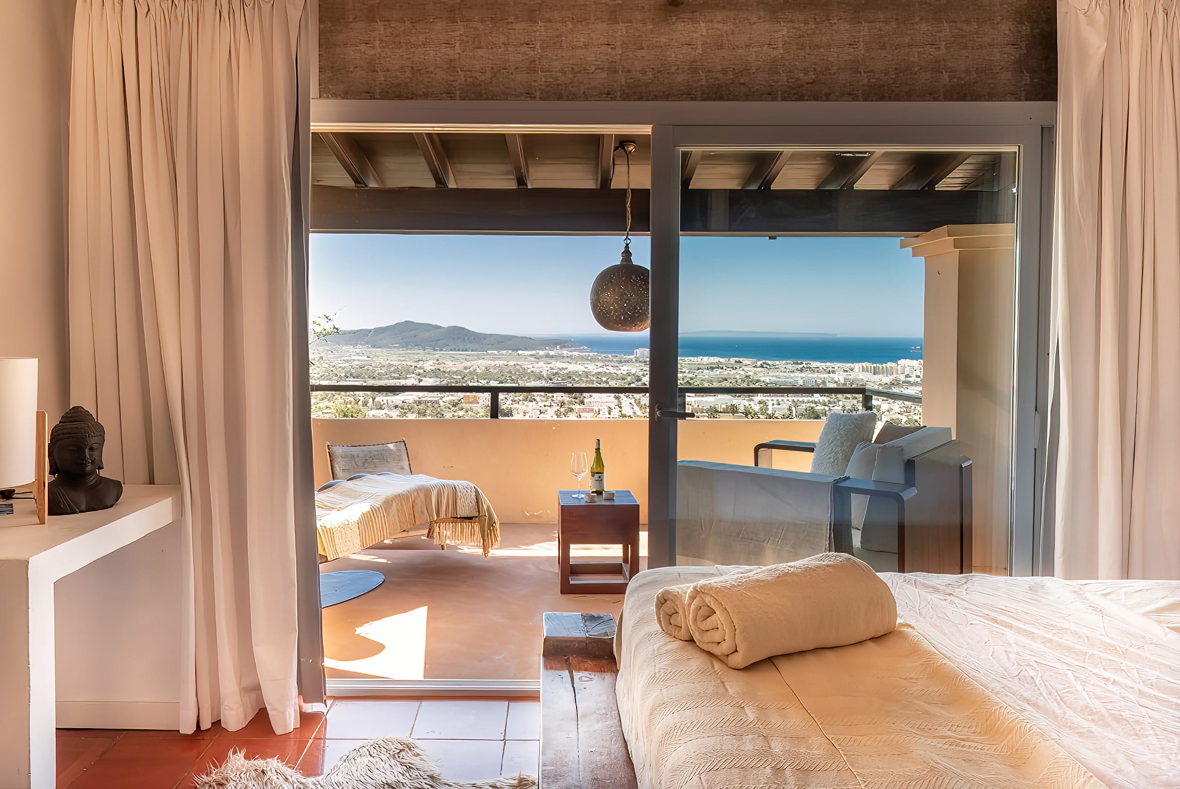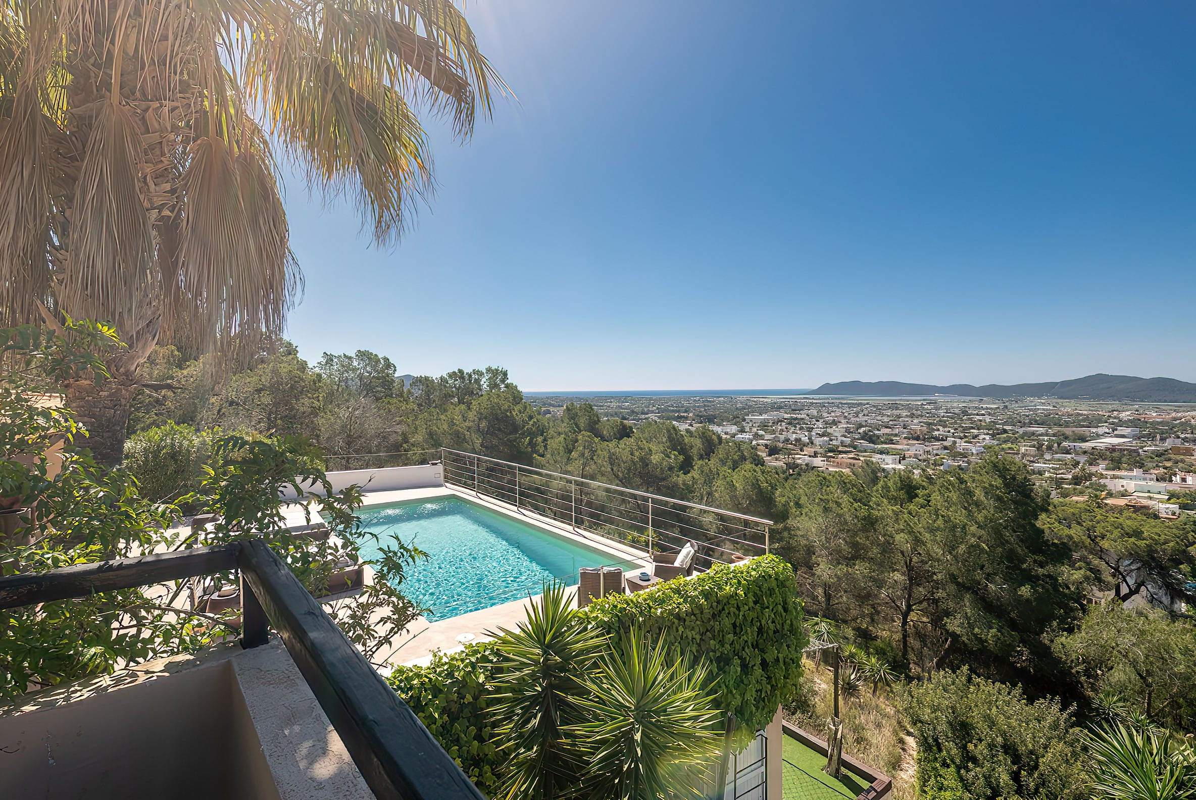 The kitchen is open to the living room and patio, where you can enjoy a 180-degree panorama from Ibiza Town to Salinas and Formentera in the distance.