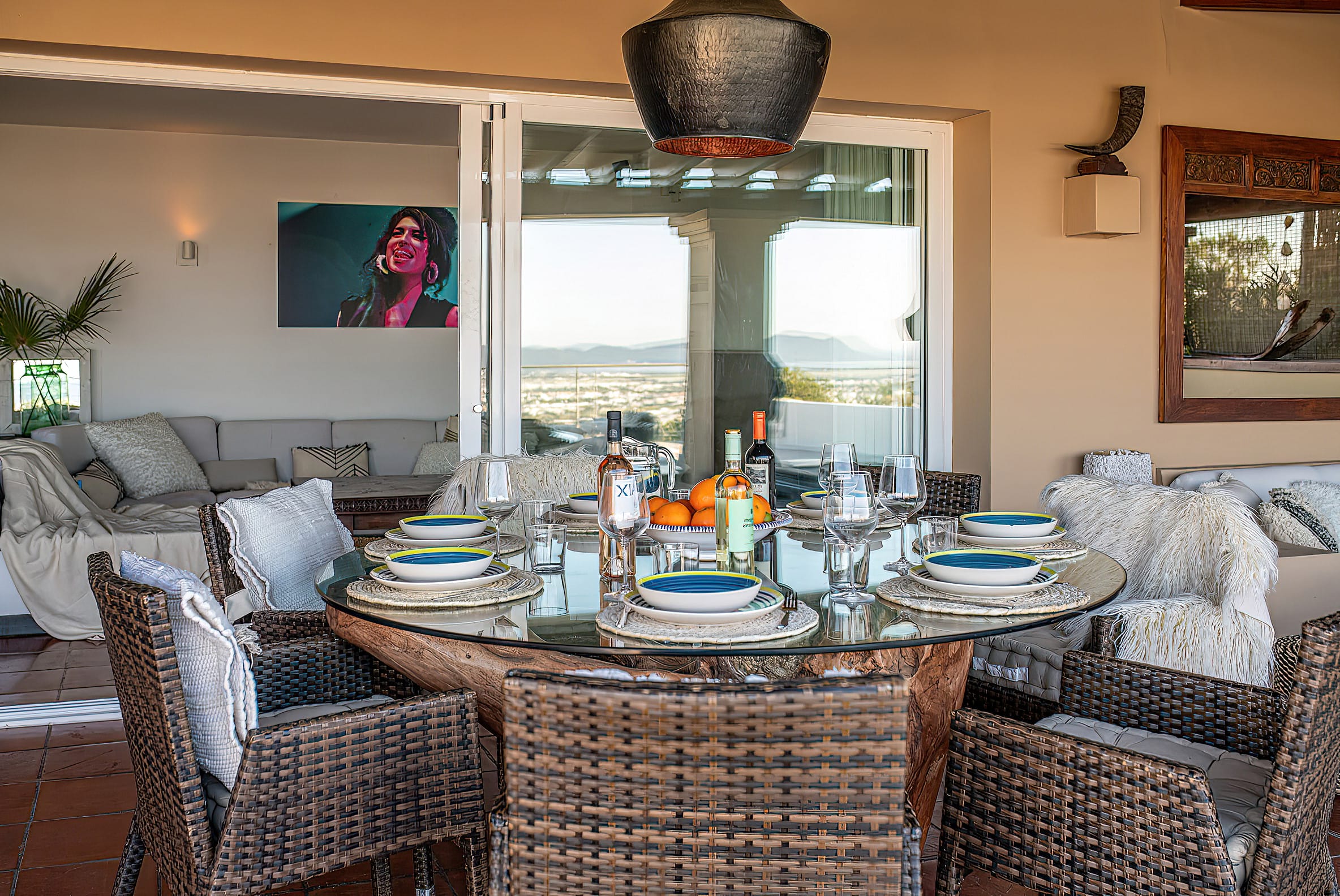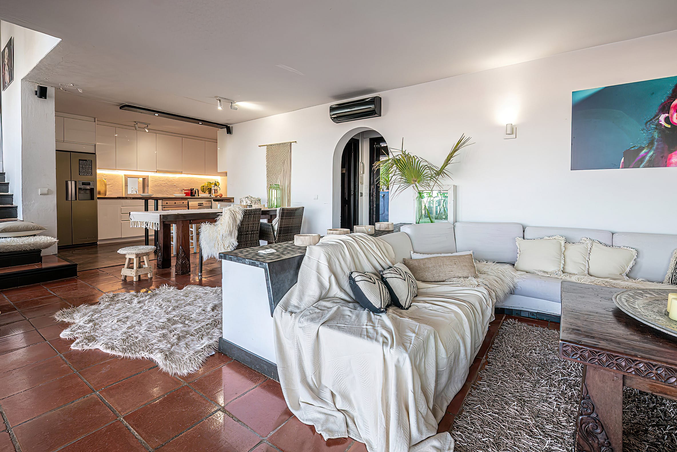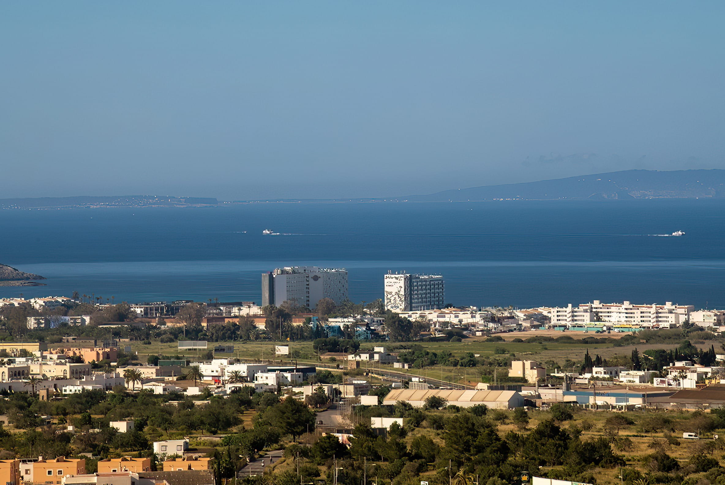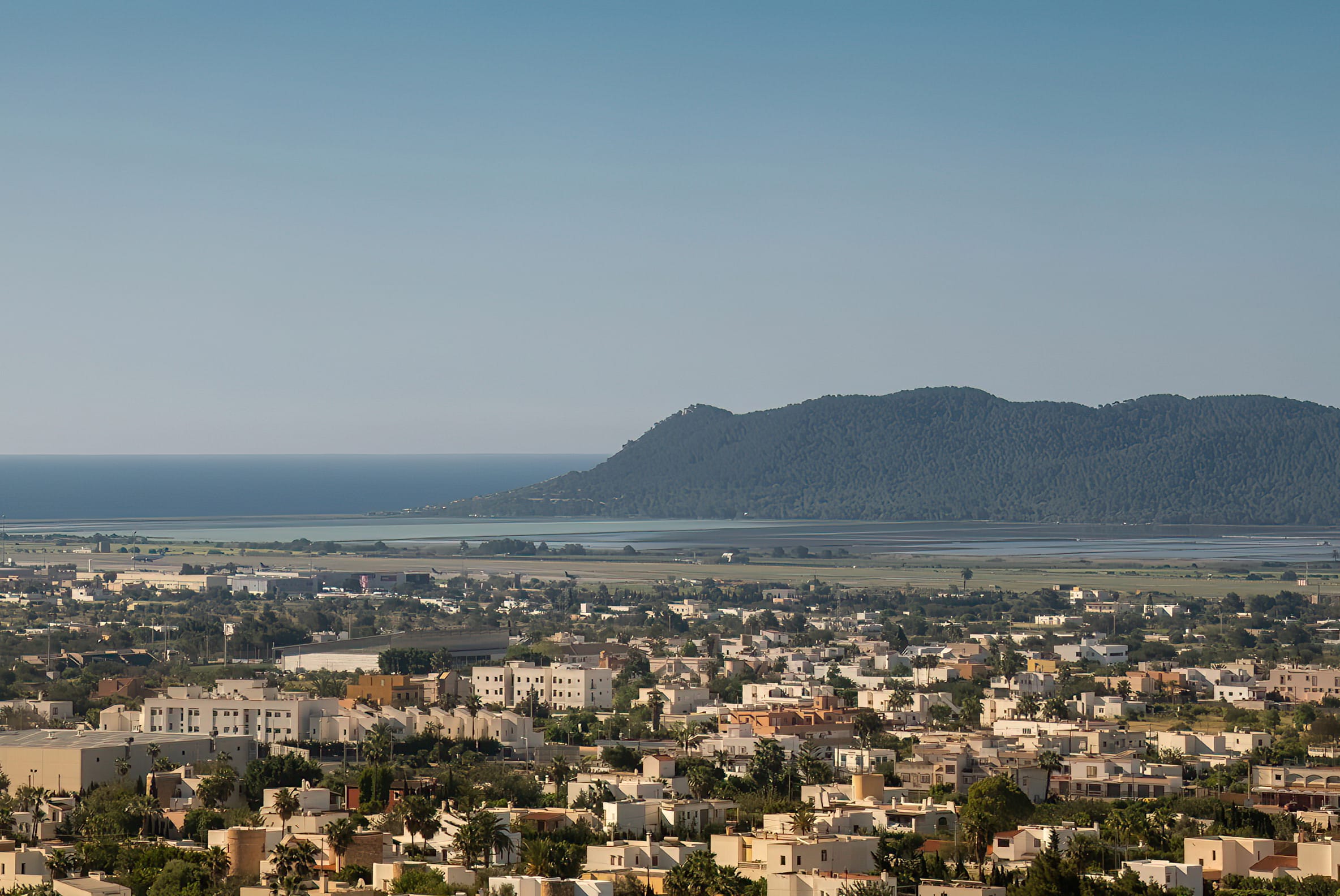 The kitchen is open to the living room and patio, where you can enjoy a 180-degree panorama from Ibiza Town to Salinas and Formentera in the distance.