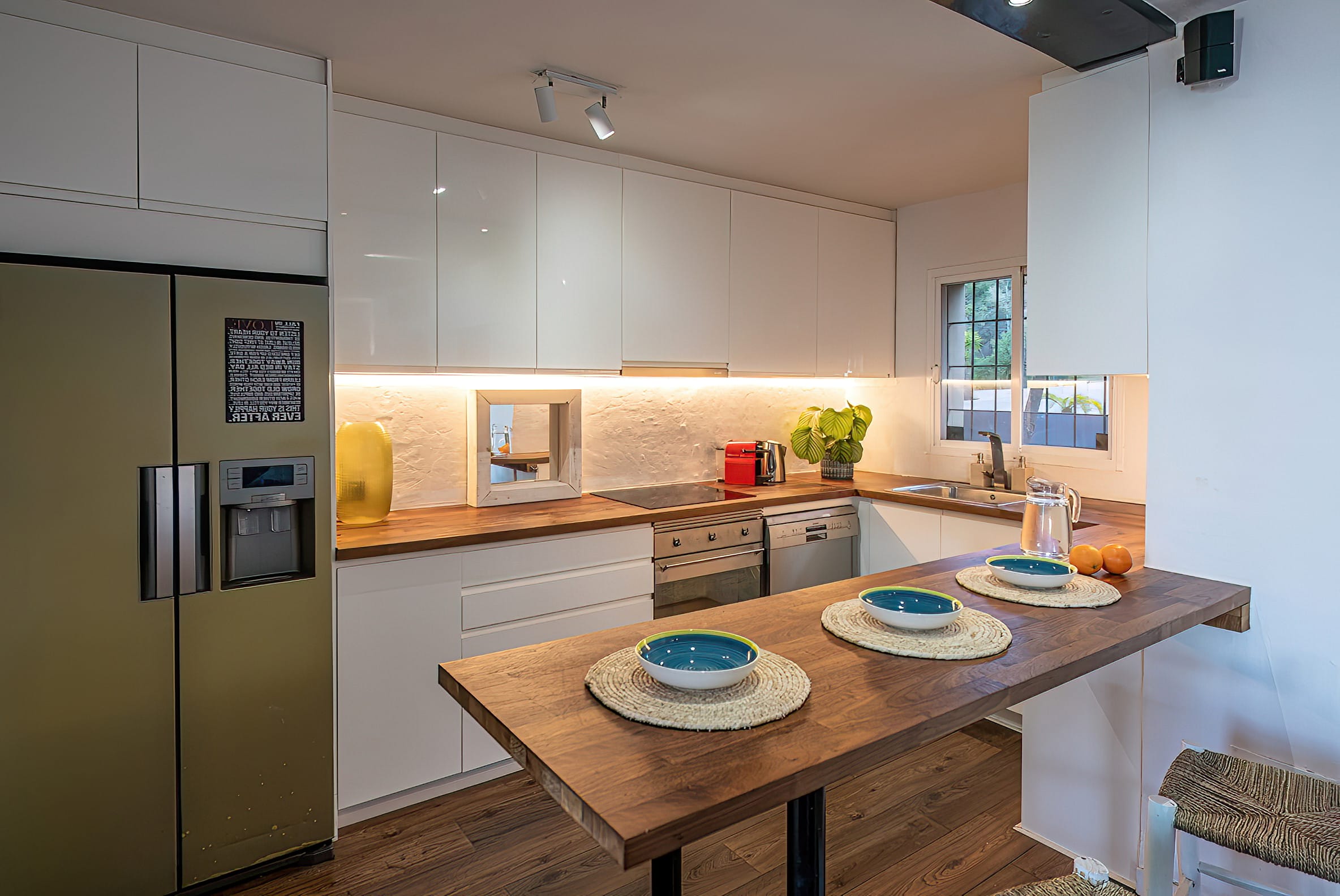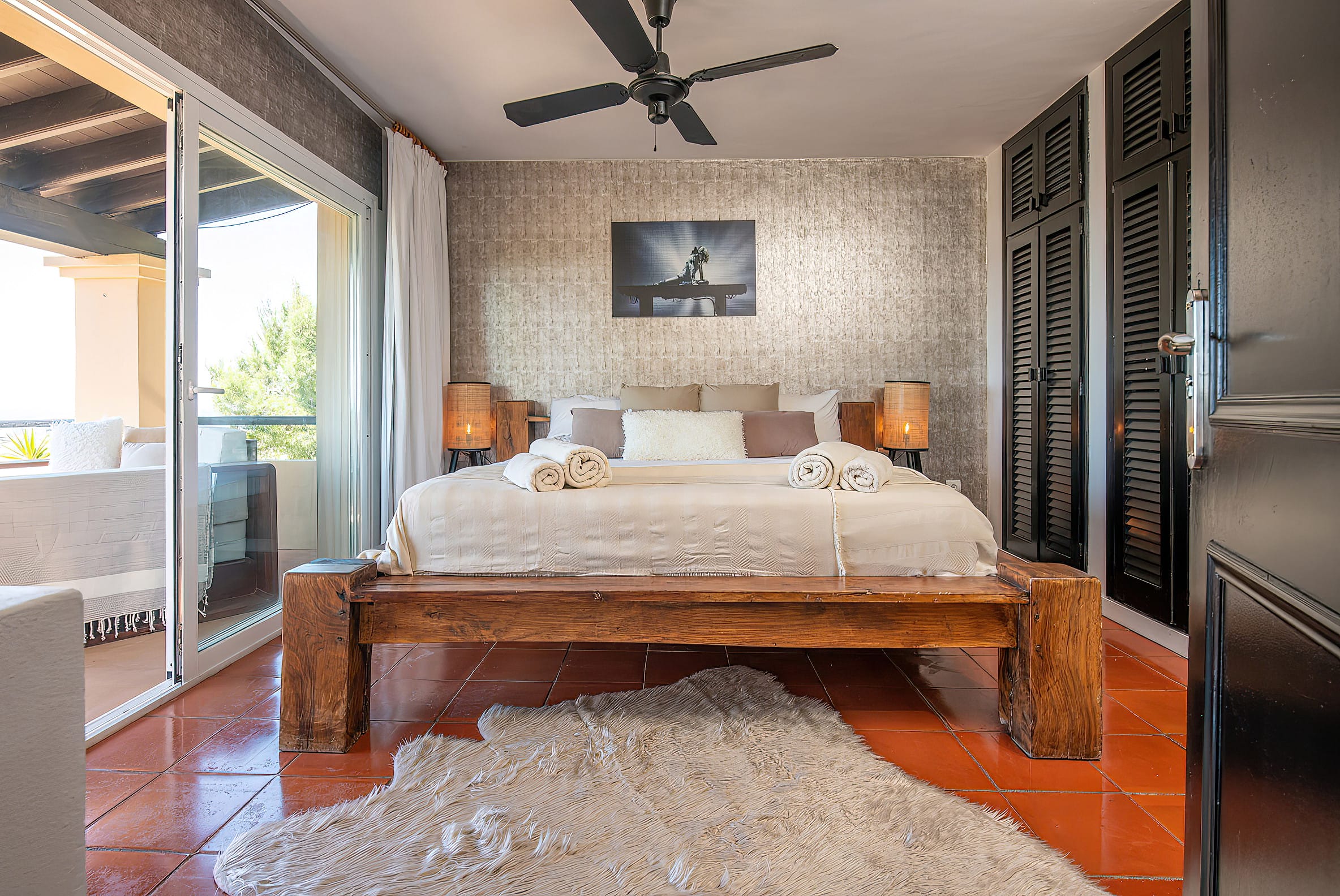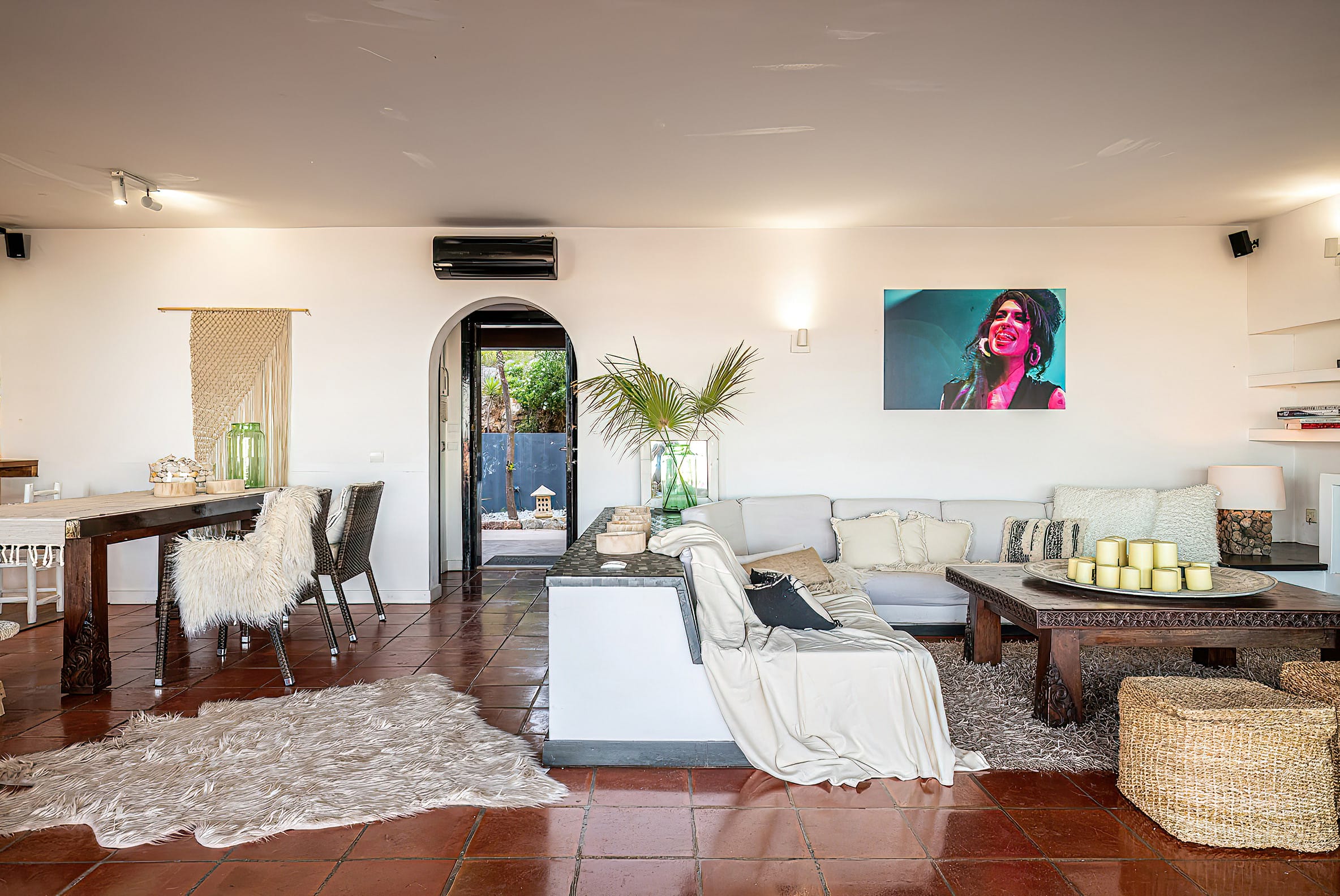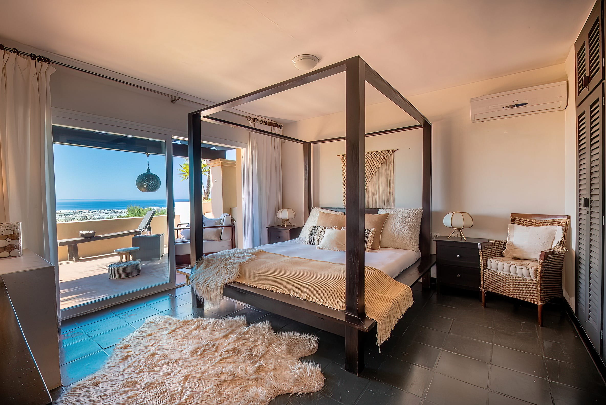 The kitchen is open to the living room and patio, where you can enjoy a 180-degree panorama from Ibiza Town to Salinas and Formentera in the distance.