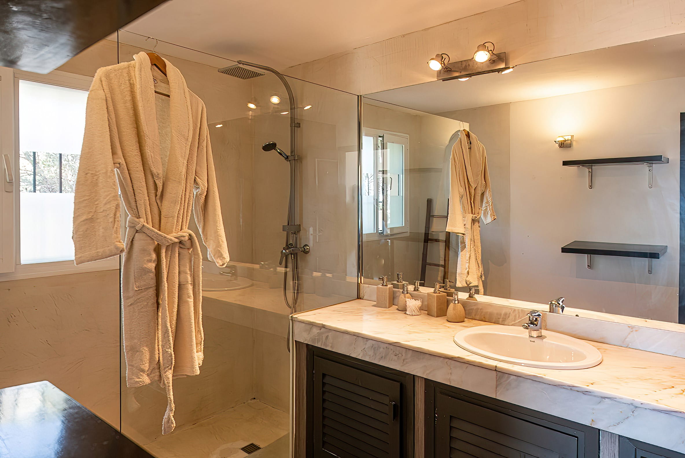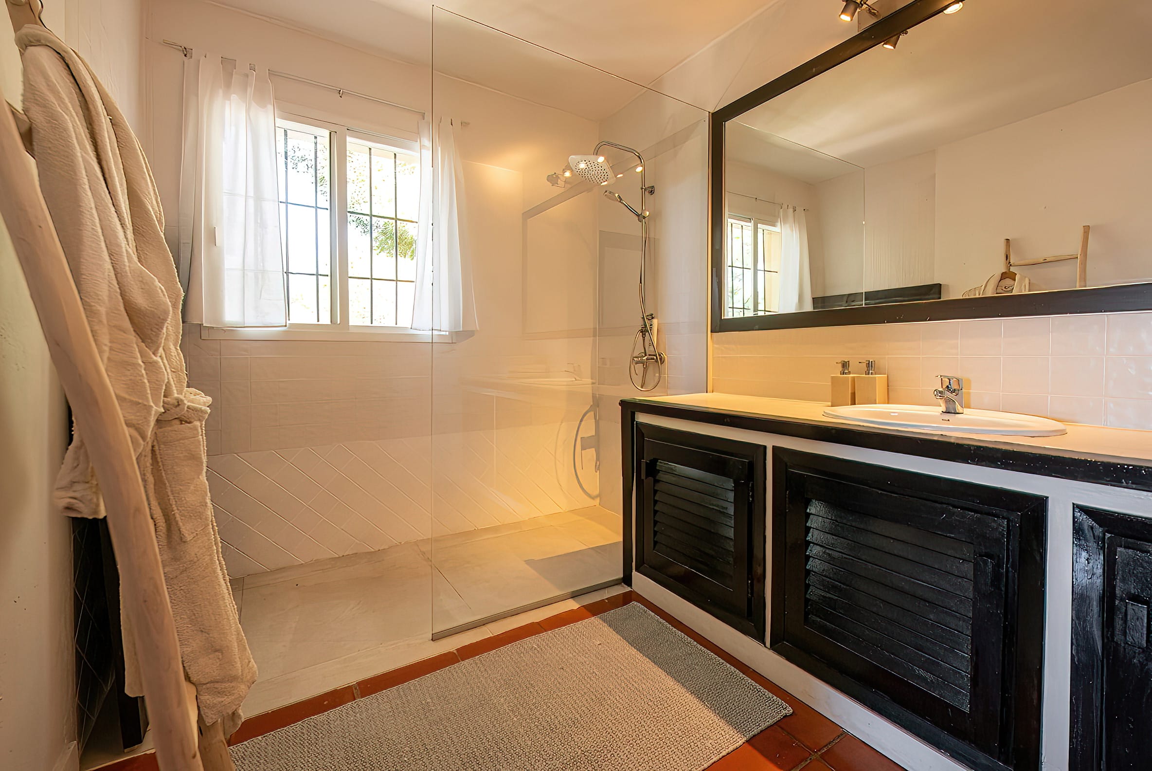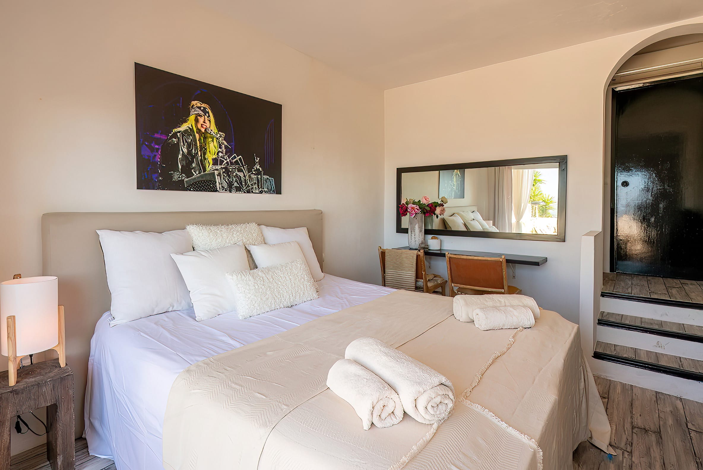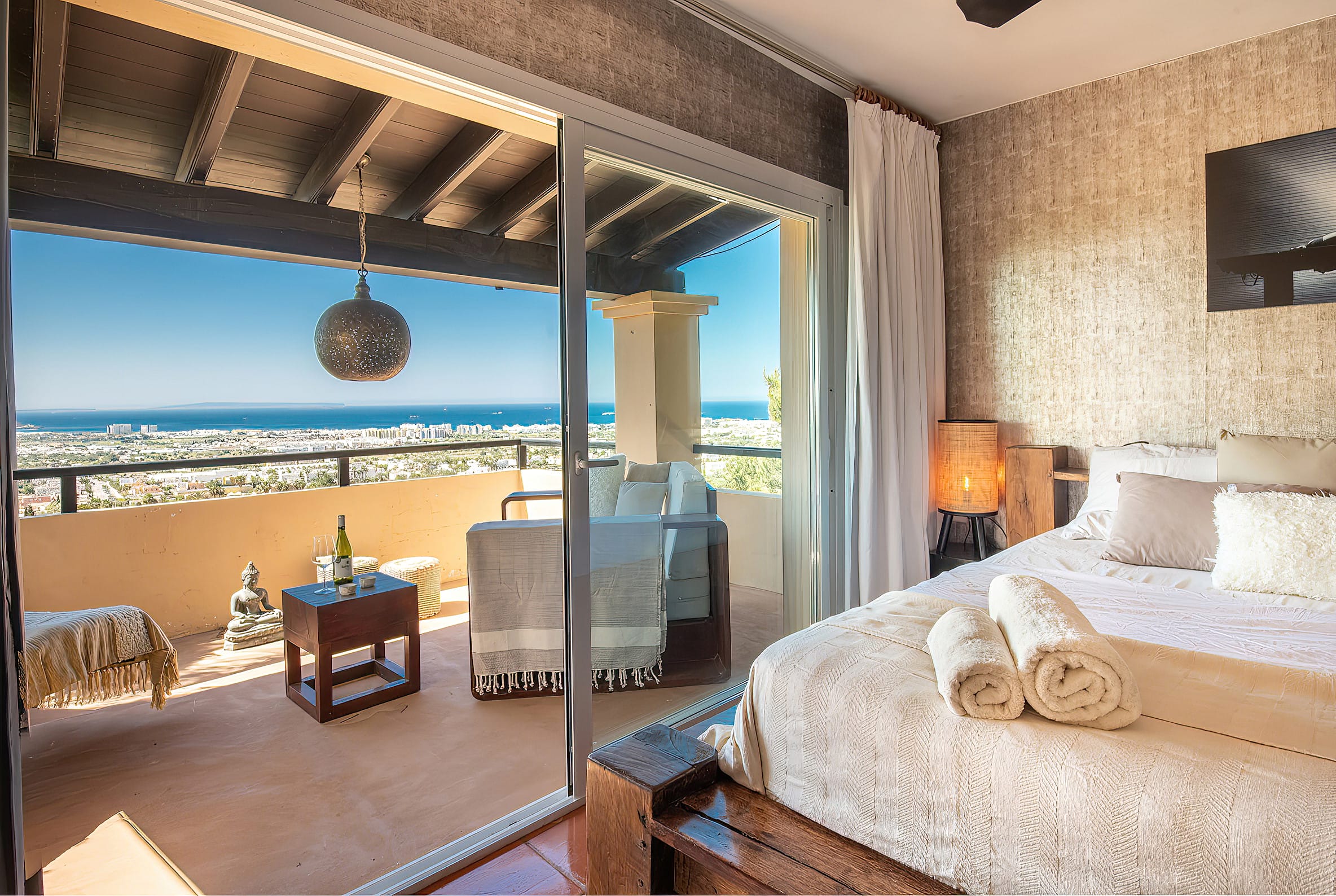 In addition to the living area, a staircase leads to the remaining rooms, each of which features a private bathroom and balcony with a breathtaking view.