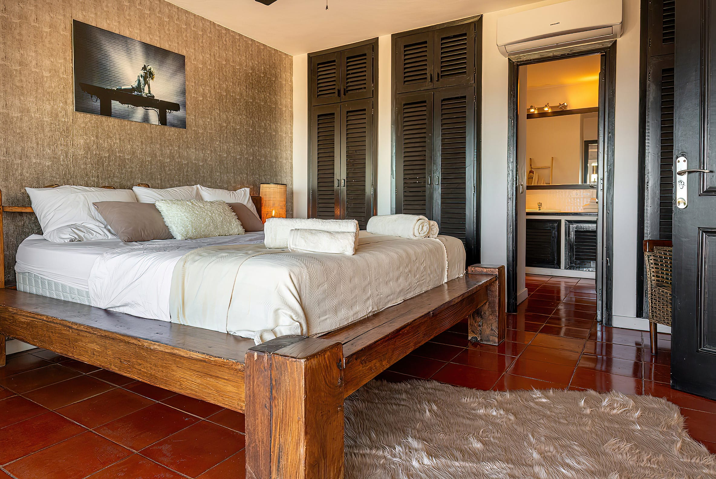 The living area connects to the master bedroom, which features an en suite bathroom and a beautiful balcony.