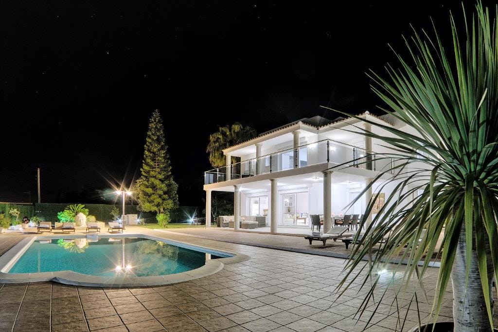 Through sliding glass doors, the bright living and dining room opens to a covered terrace with beautiful views, creating an idyllic picture frame. There are also a lounge and dining area outside, a large terrace surrounding the pool, and a second terrace on the first floor. Private parking.