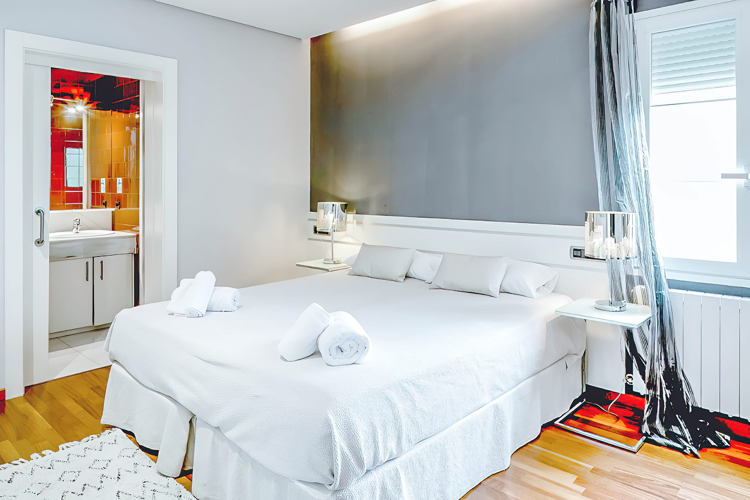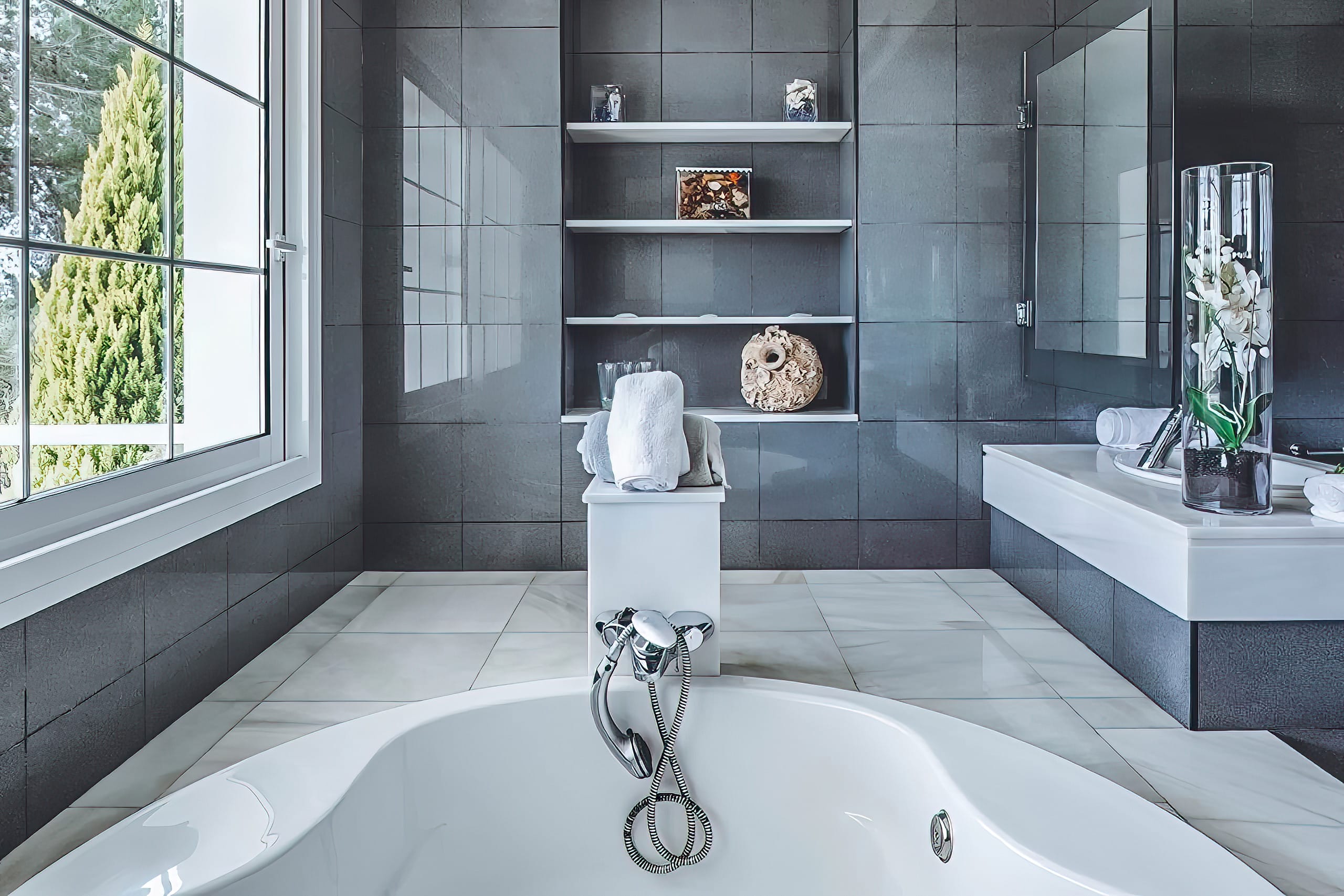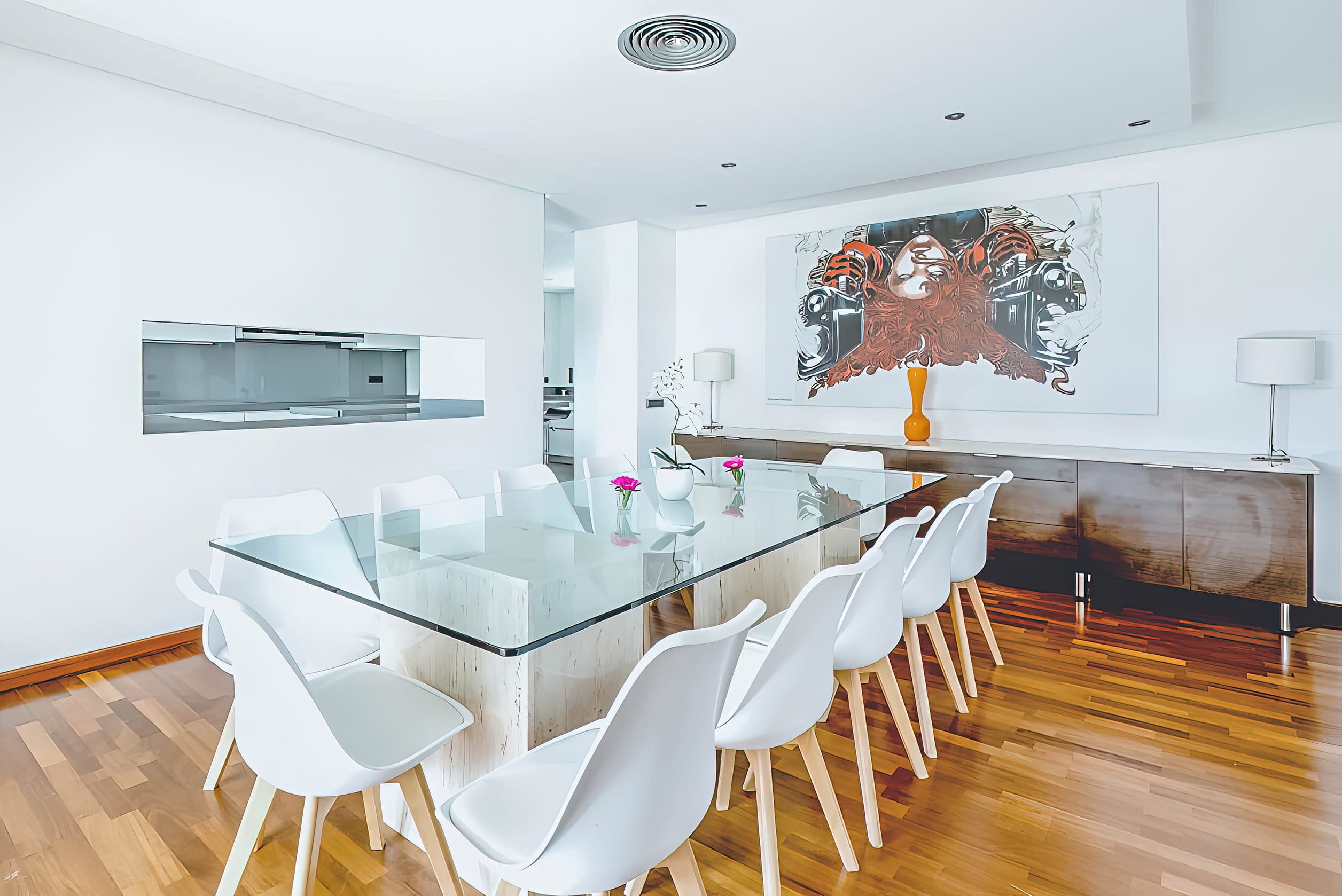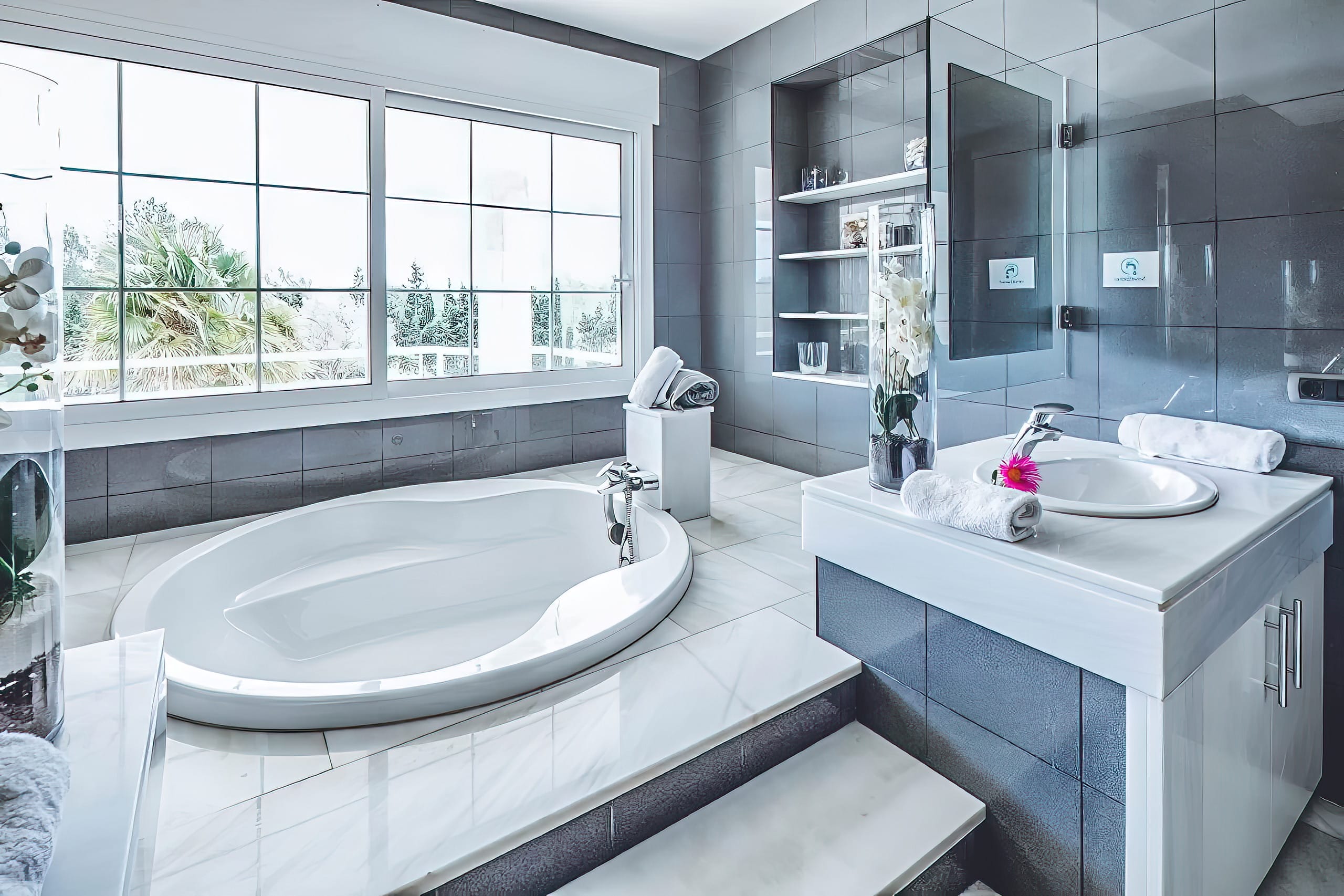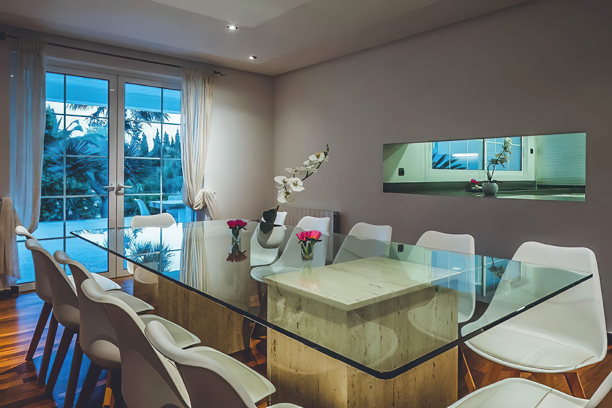 Upon entering Villa Tedi, you cannot help but be awed by the magnificent staircases that lead up to either side of the upper level, where you are greeted by a spacious, open-plan reception area with opulent chill-out and entertaining areas, as well as a dining room.