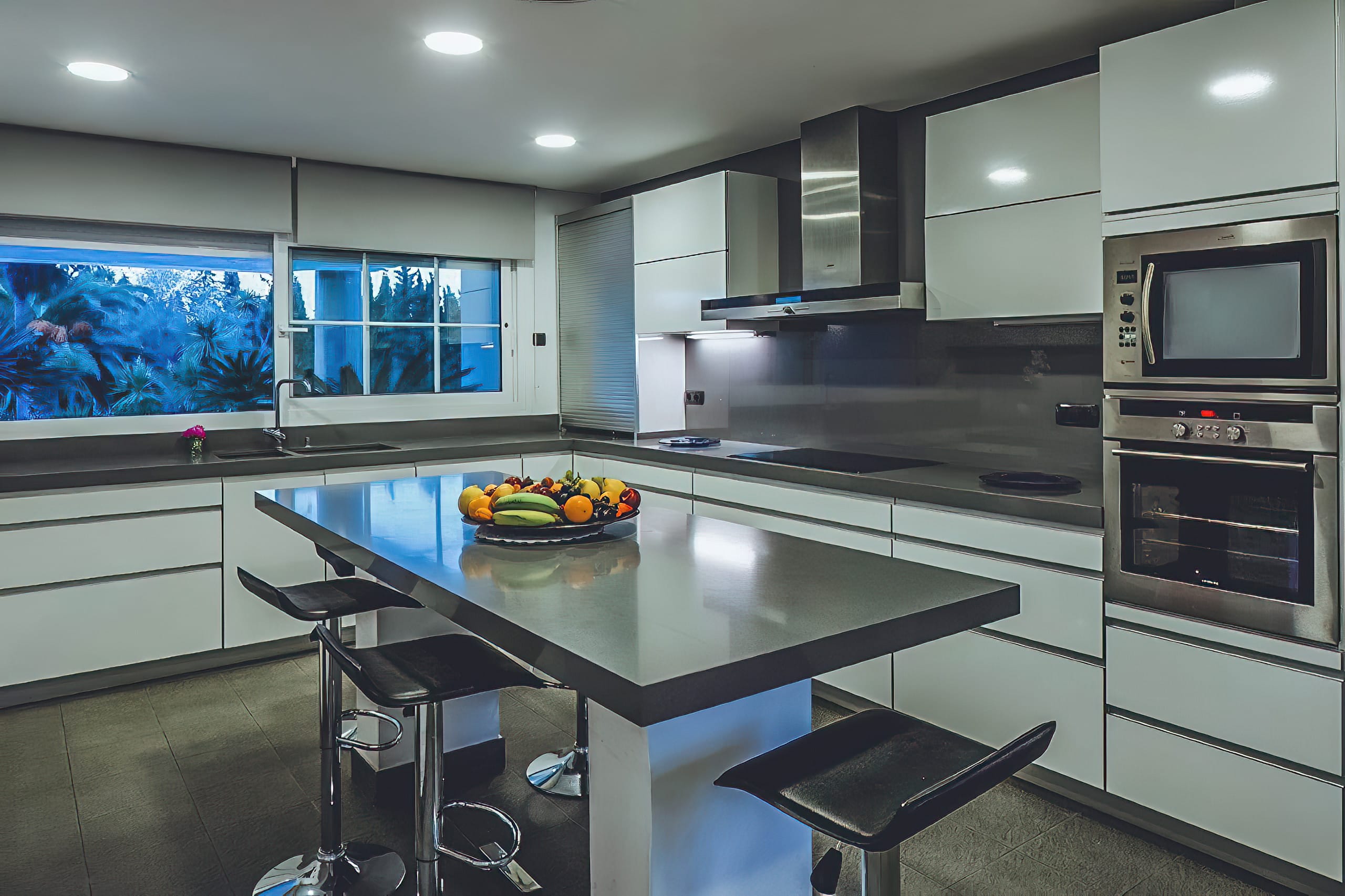 Set over a vast expanse of private gardens with surrounding opulent palm trees, this home features exceptional exteriors with a variety of fully furnished and spacious chill-out areas, an alfresco dining terrace, a beautiful swimming pool surrounded by sun loungers and daybeds, and a fully integrated outdoor kitchen and BBQ. In addition, there is a stylish cocktail bar for entertaining guests in the evenings under the stars.