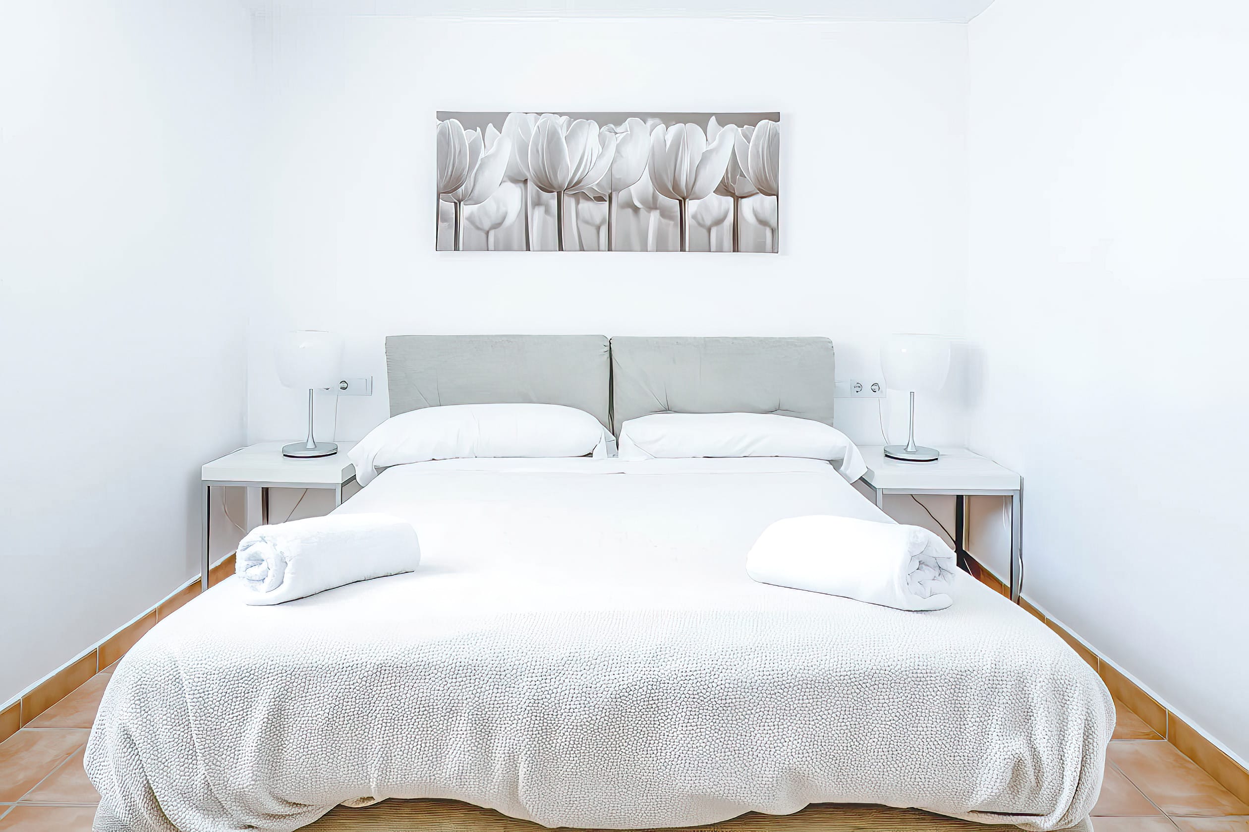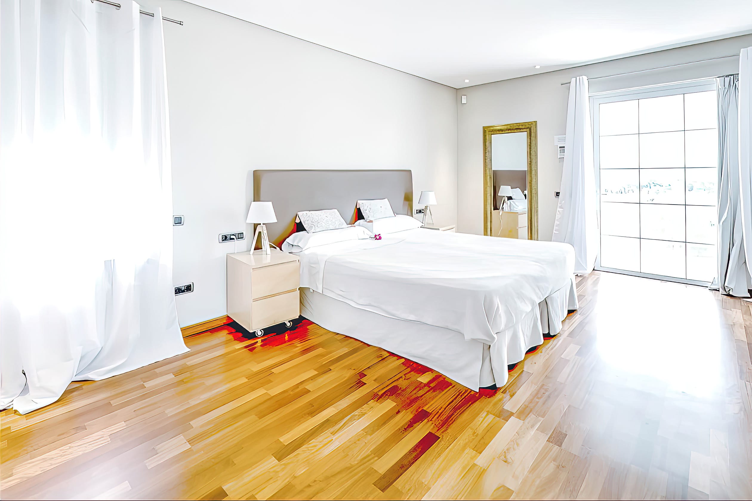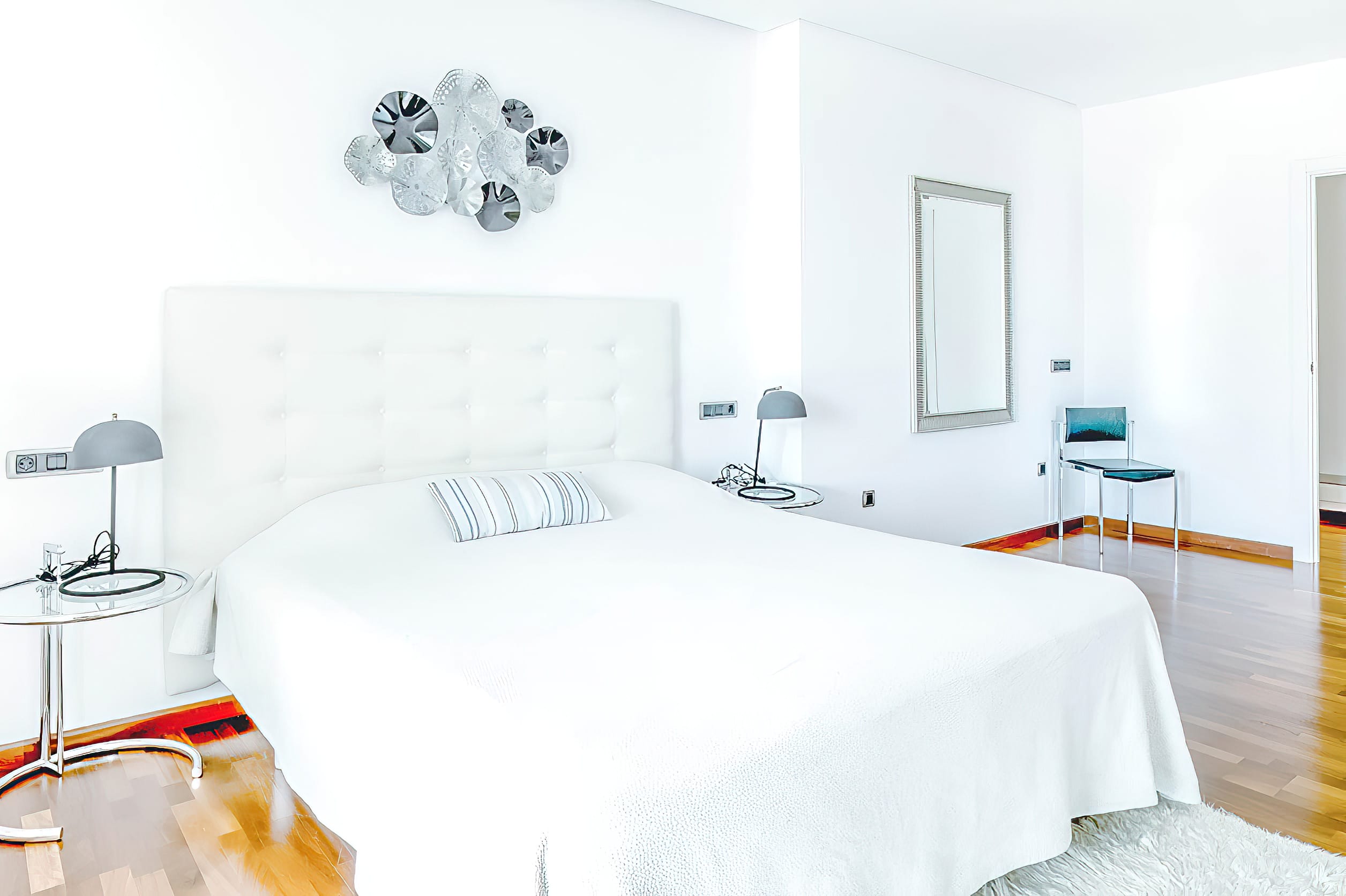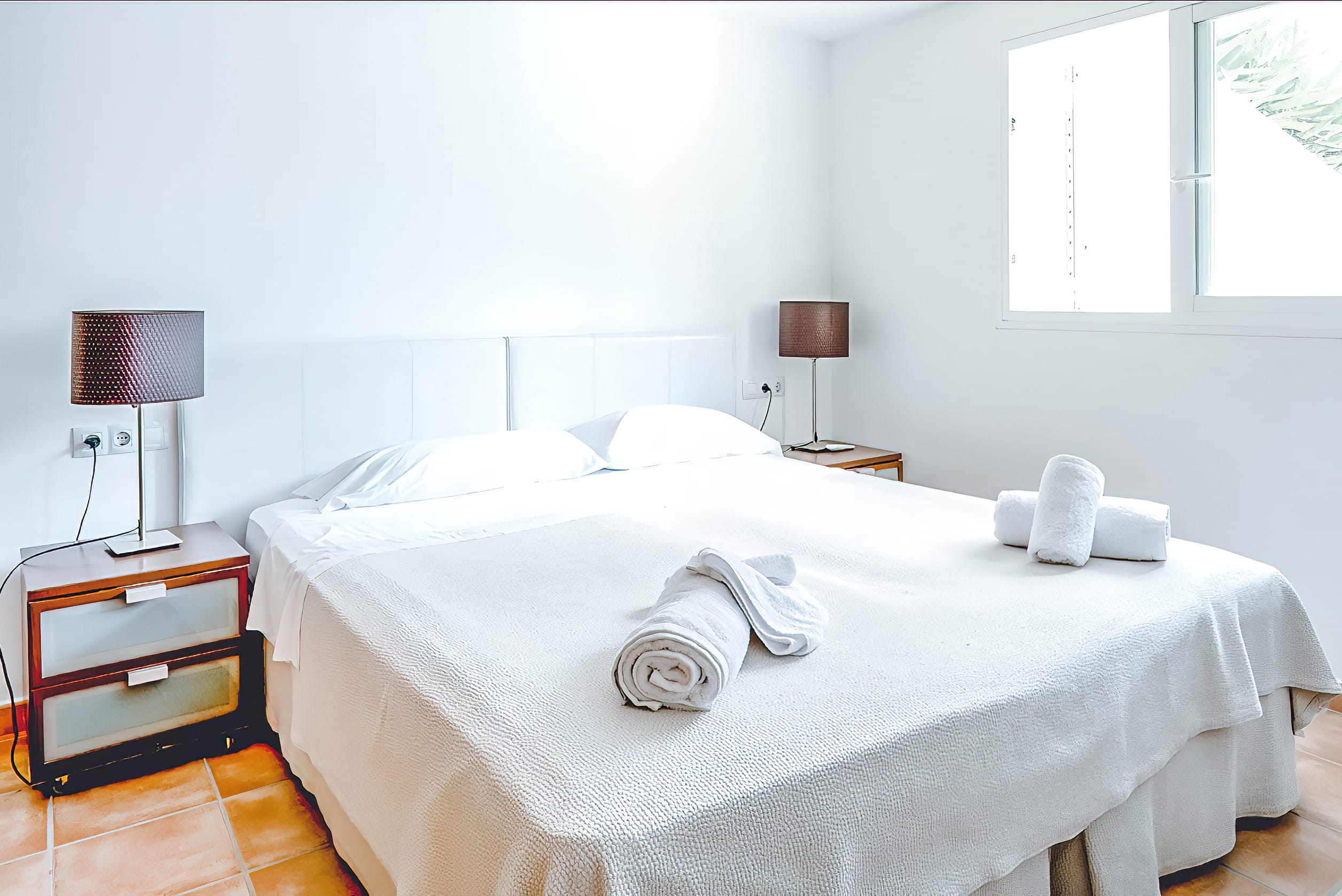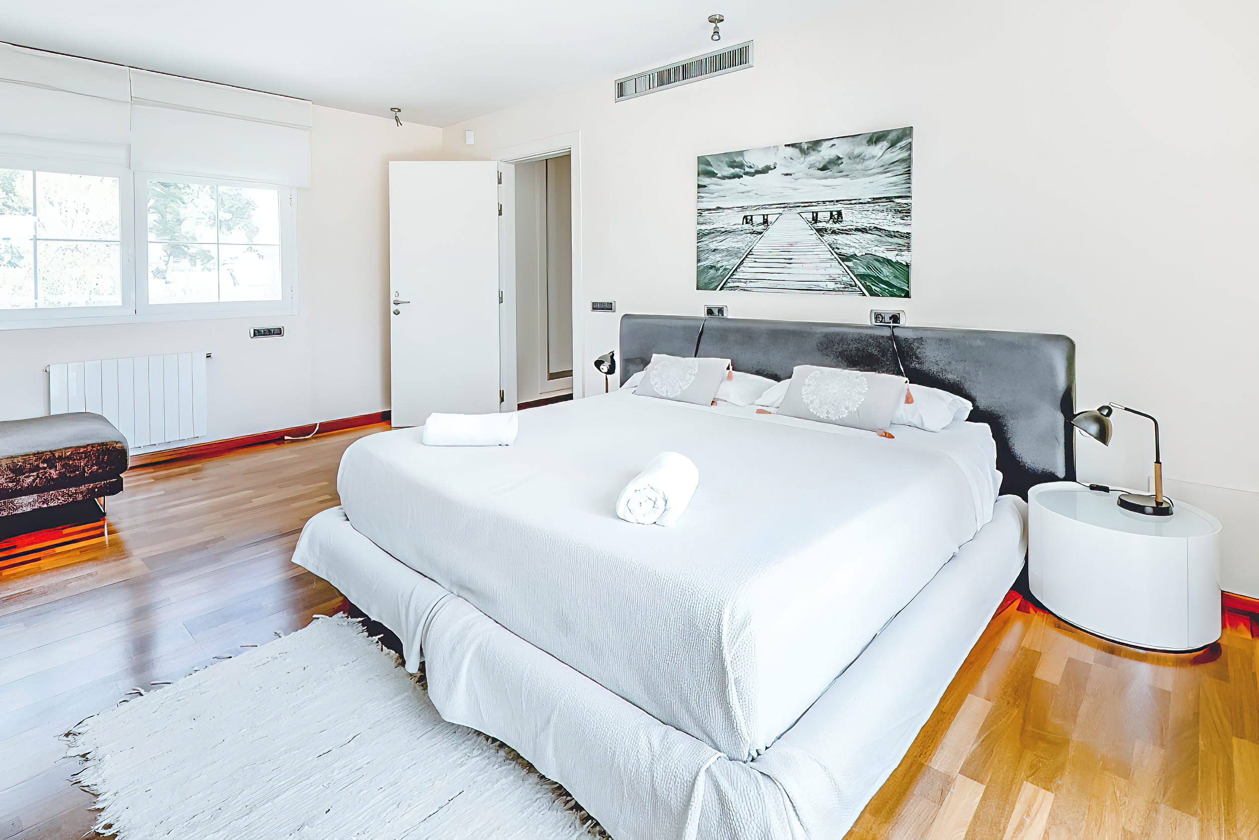 The fully equipped modern kitchen features a functional center island and direct access to the front terrace, where an additional outdoor dining table is situated. The modern decor and interior design are bright and airy, with stylish and sophisticated furnishings and fixtures throughout. Each bedroom features a king-size bed and an en-suite bathroom, with the two master suites sharing a luxurious bathroom and boasting private terraces. There are also four additional rooms for staff members.