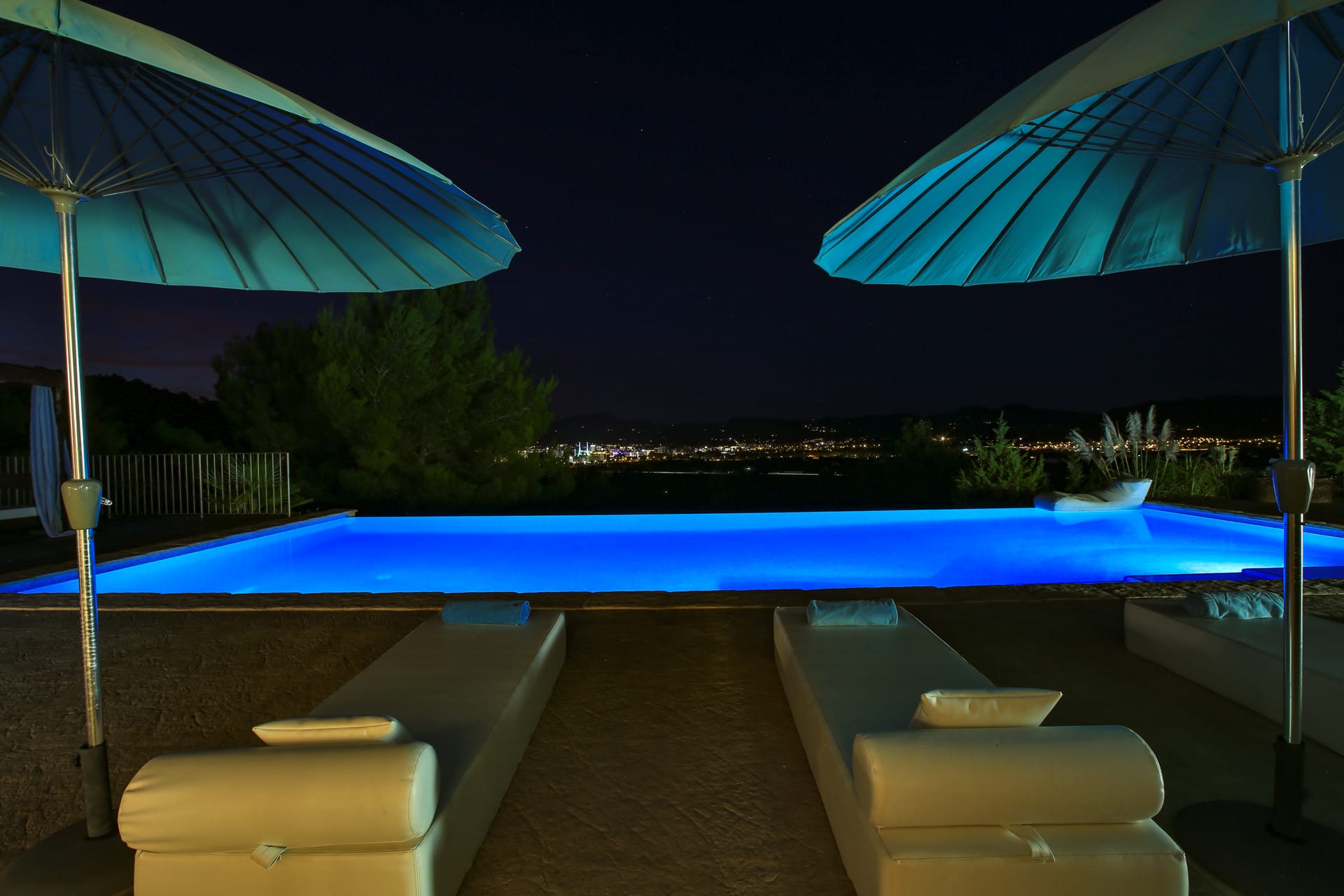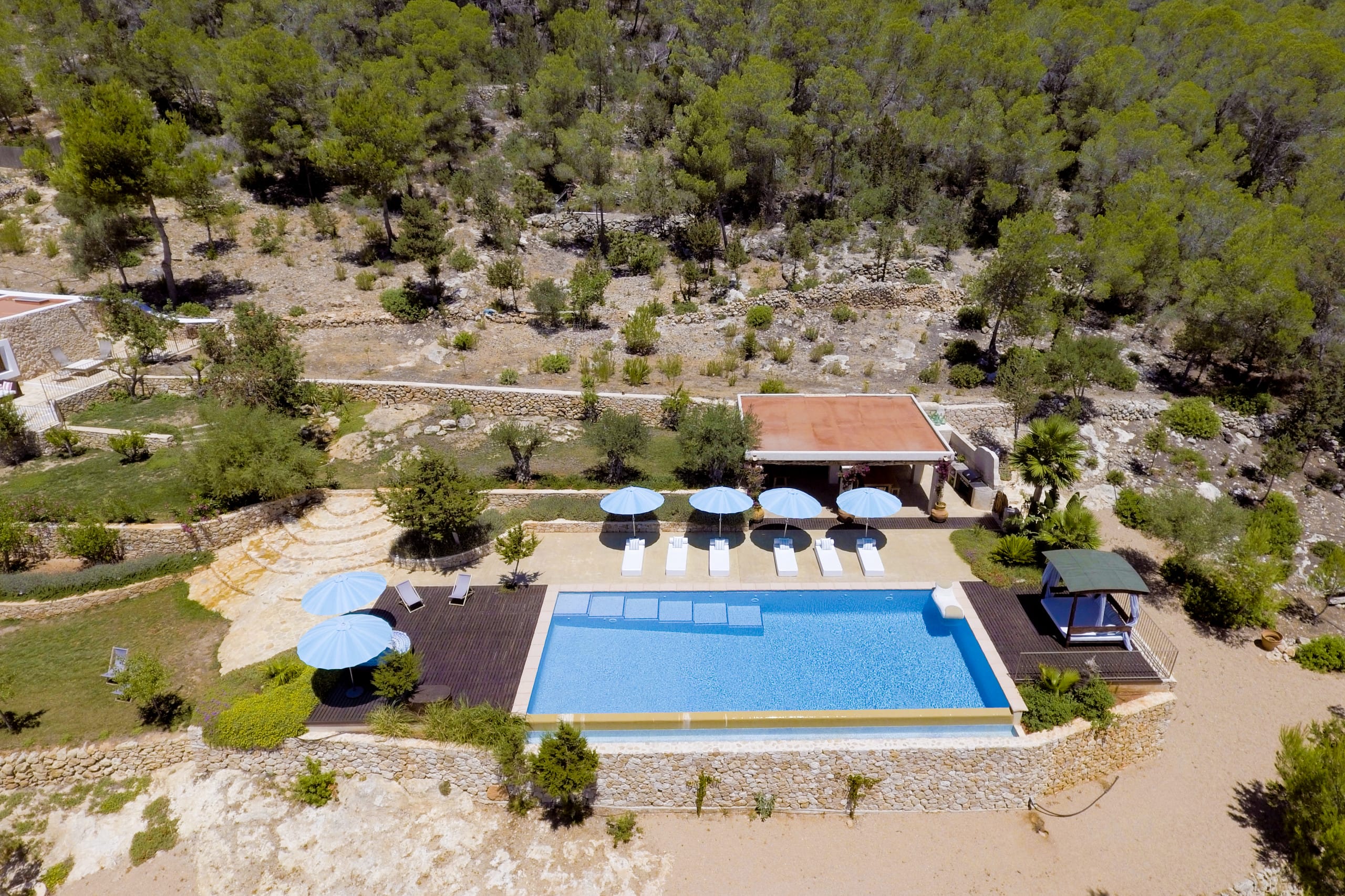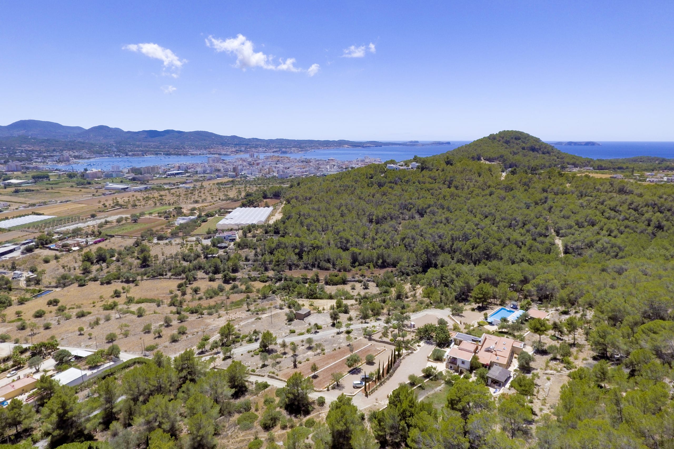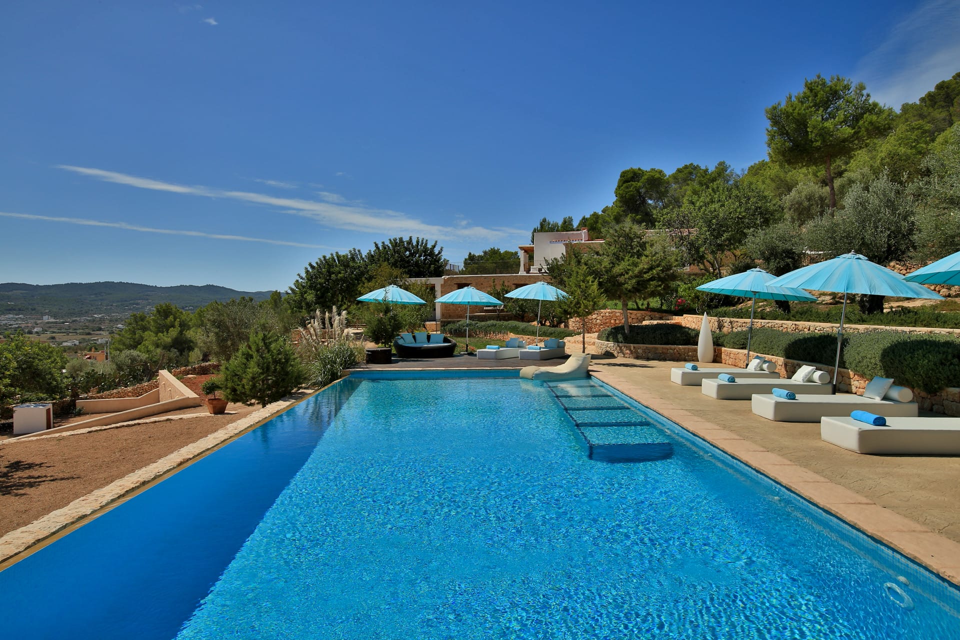 This villa, perched on a hill, is completely private and unobserved. The mansion is tranquil, surrounded on three sides by pine forest and boasting 120,000m2 of its own farmland. There is a distant sea view of San Antonio Bay and the Sant Josep hills, as well as a view of the town below.