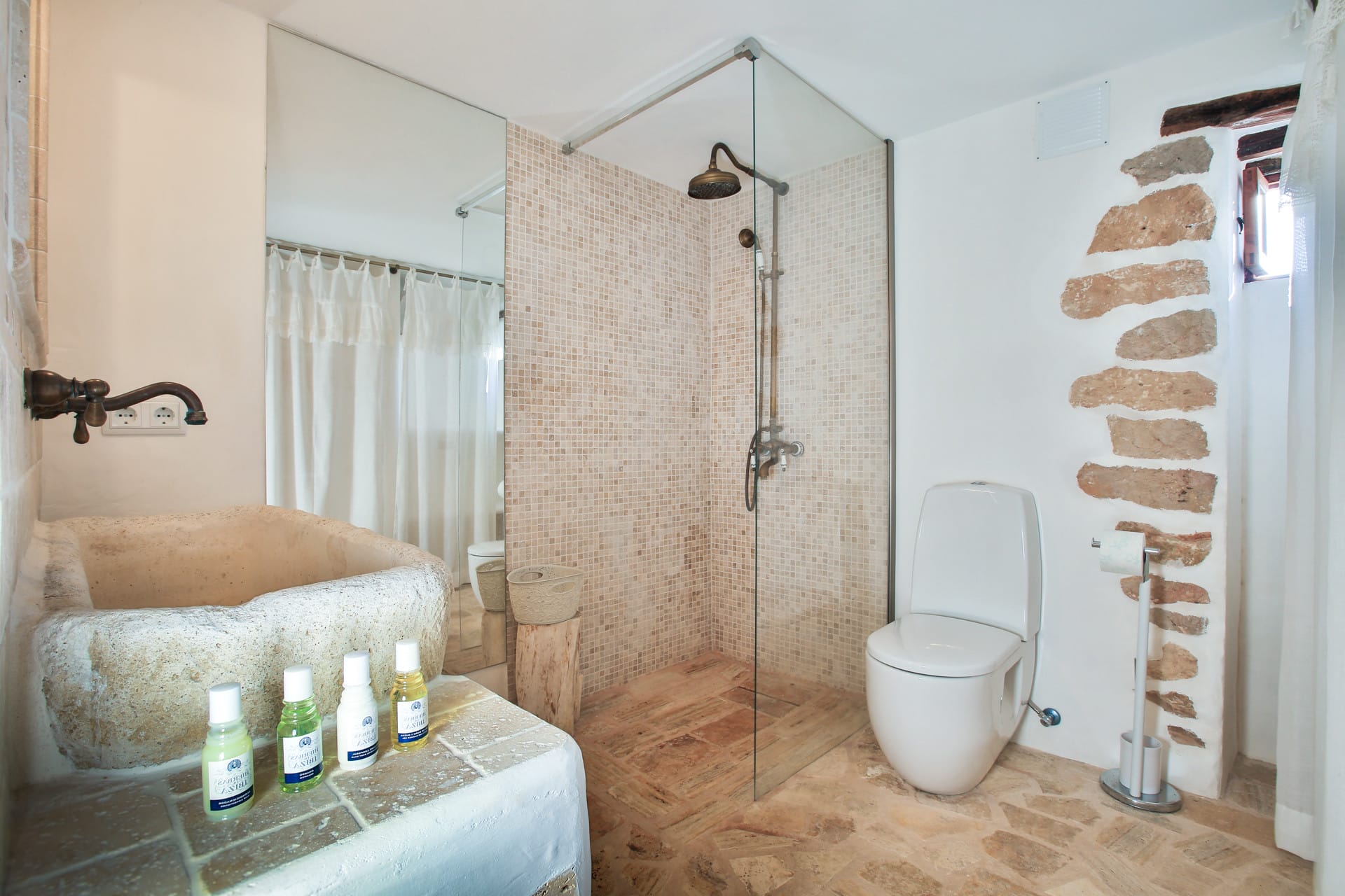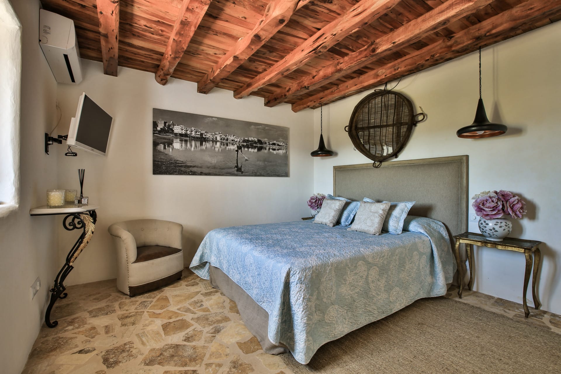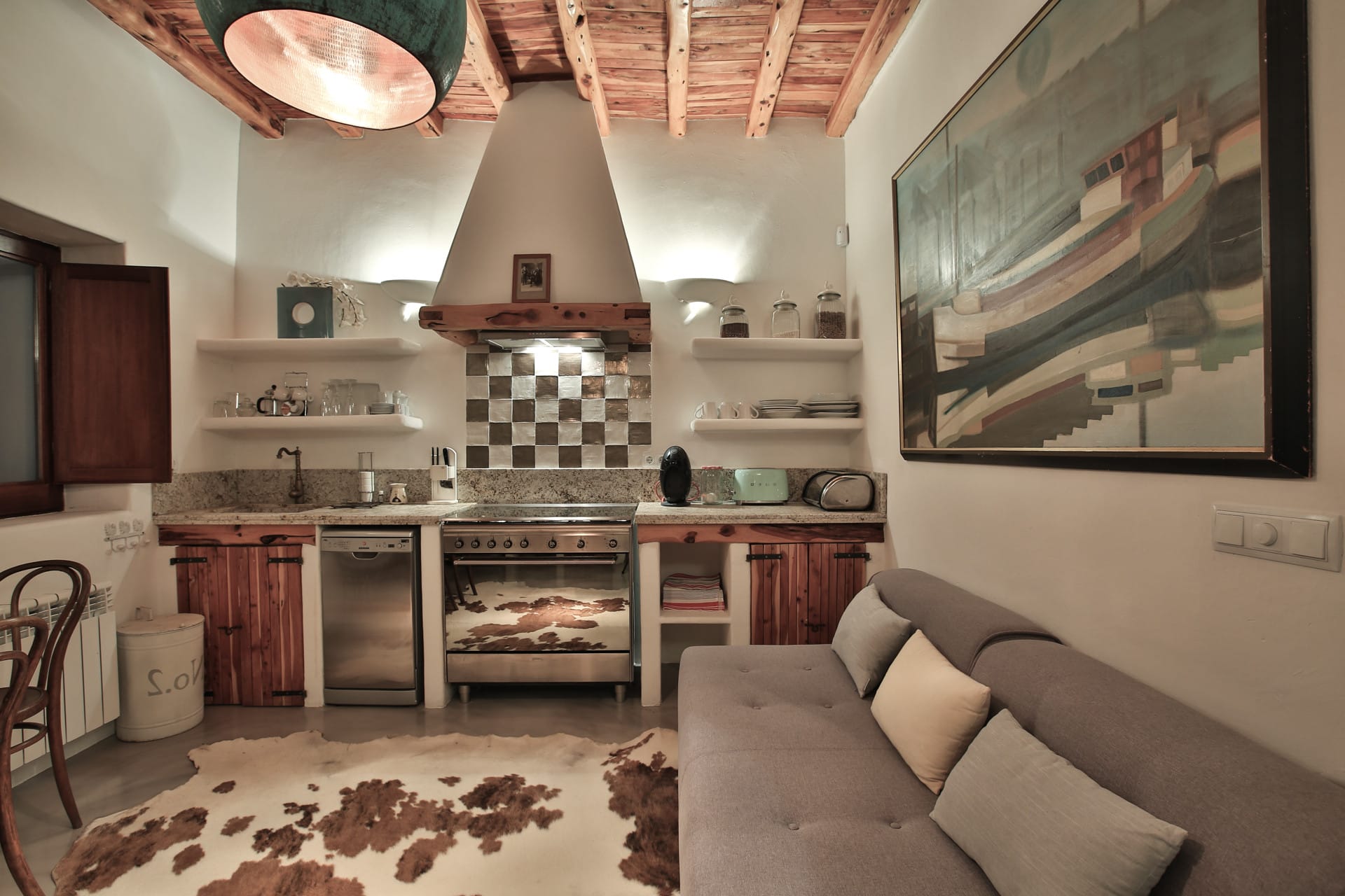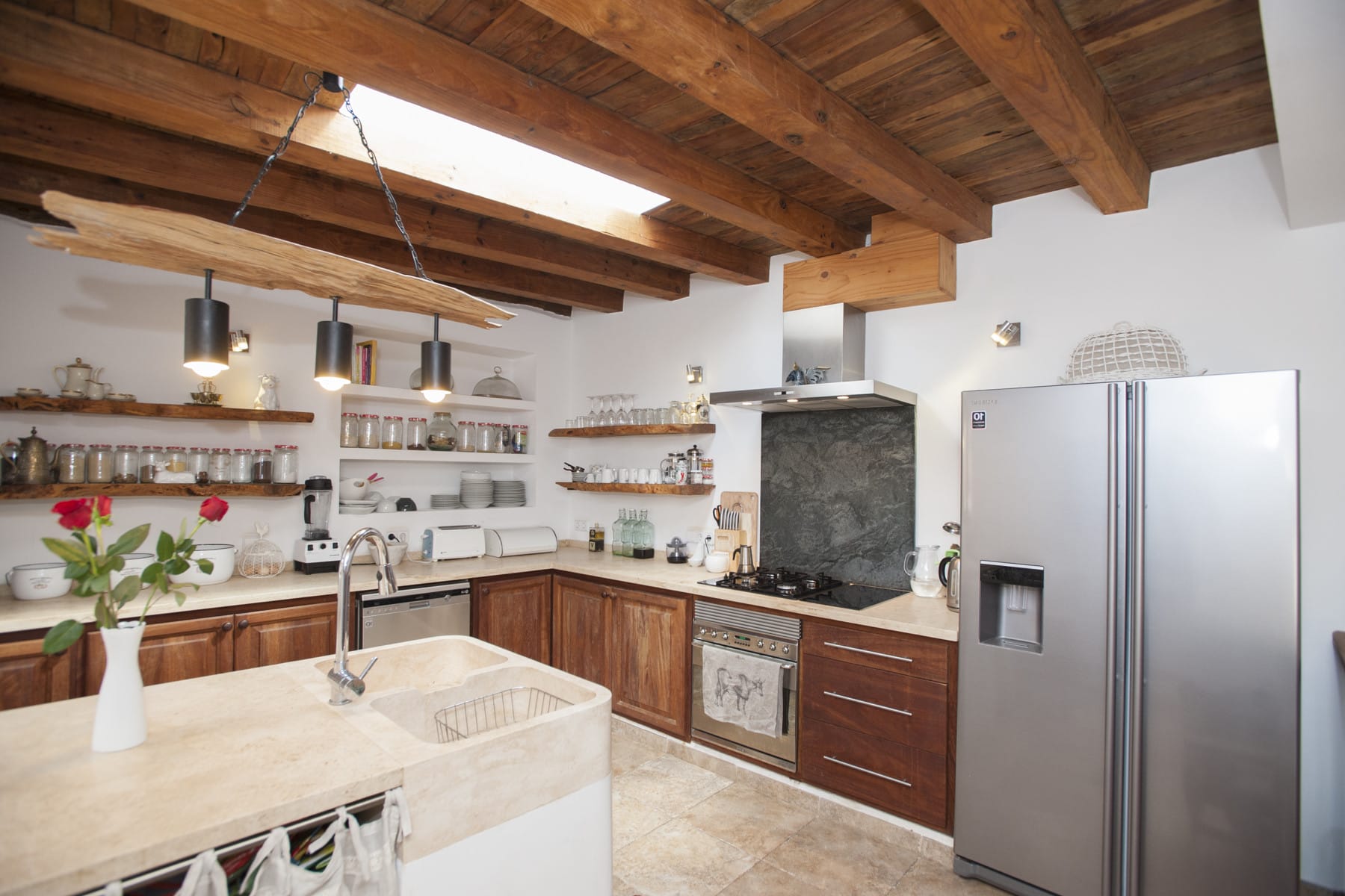 The house is a House of Architectural Merit and was constructed using traditional materials such as sabina wood and massive stone walls that have been bleached with cal. Its 20-metre-long living area features a 5-metre-high ceiling, which helps keep the house cool and fresh even without air conditioning. The stone walls are many feet thick.