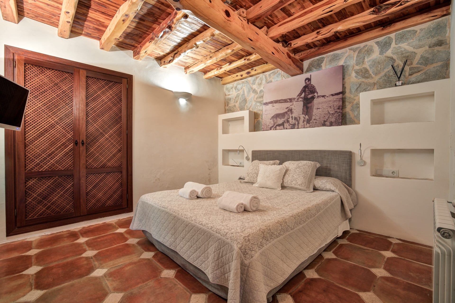 The finca includes six double bedrooms (four of which are en suite), five bathrooms, and sleeps a total of 12. It has a total internal area of around 500 square metres. Because the villa is built like a U, the bedrooms are nicely isolated from one another, offering a sense of isolation.