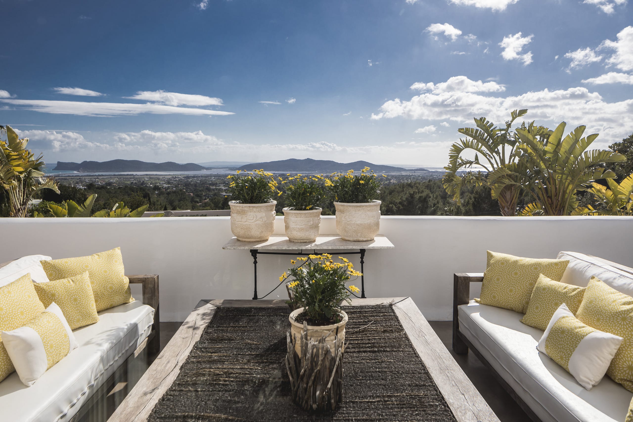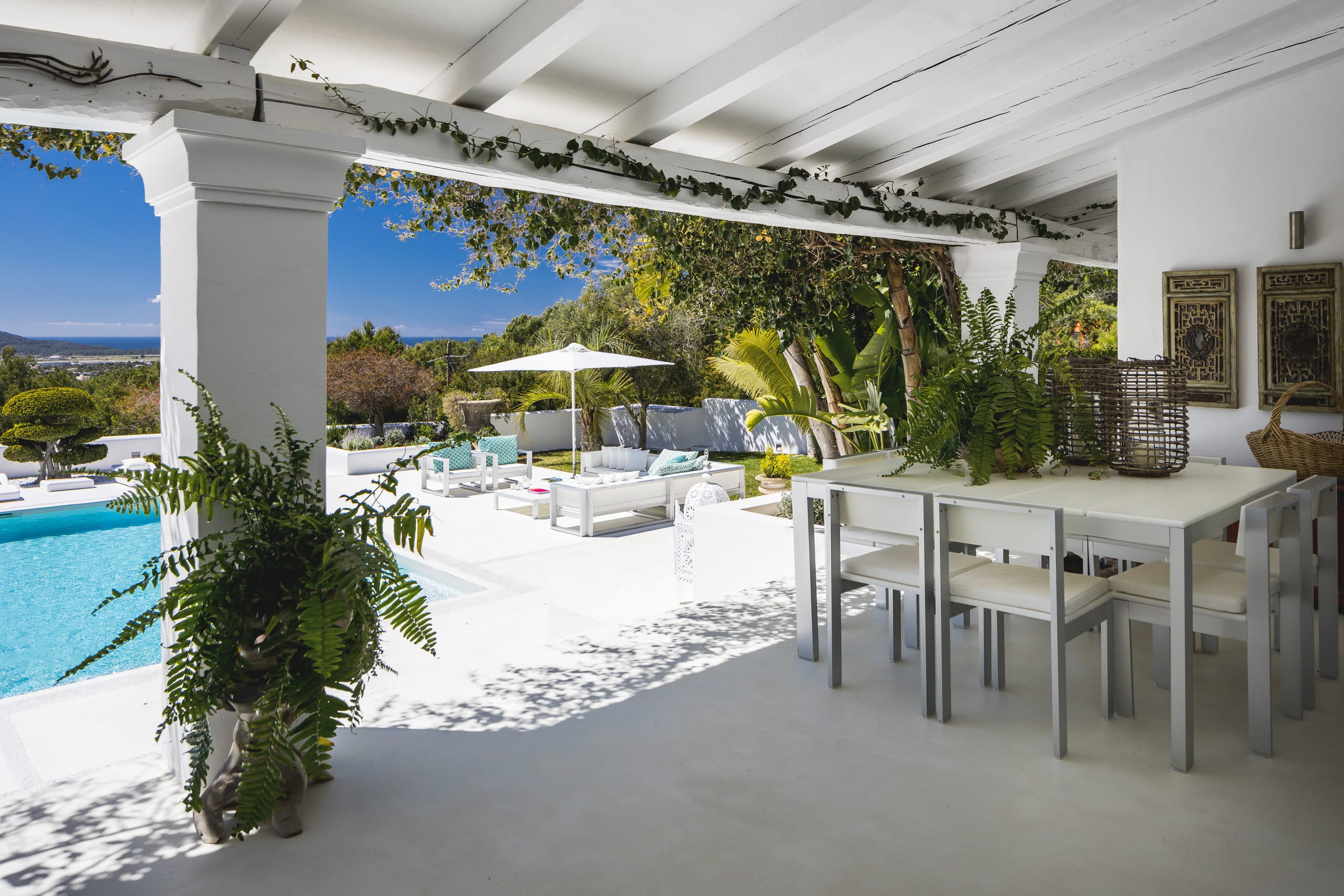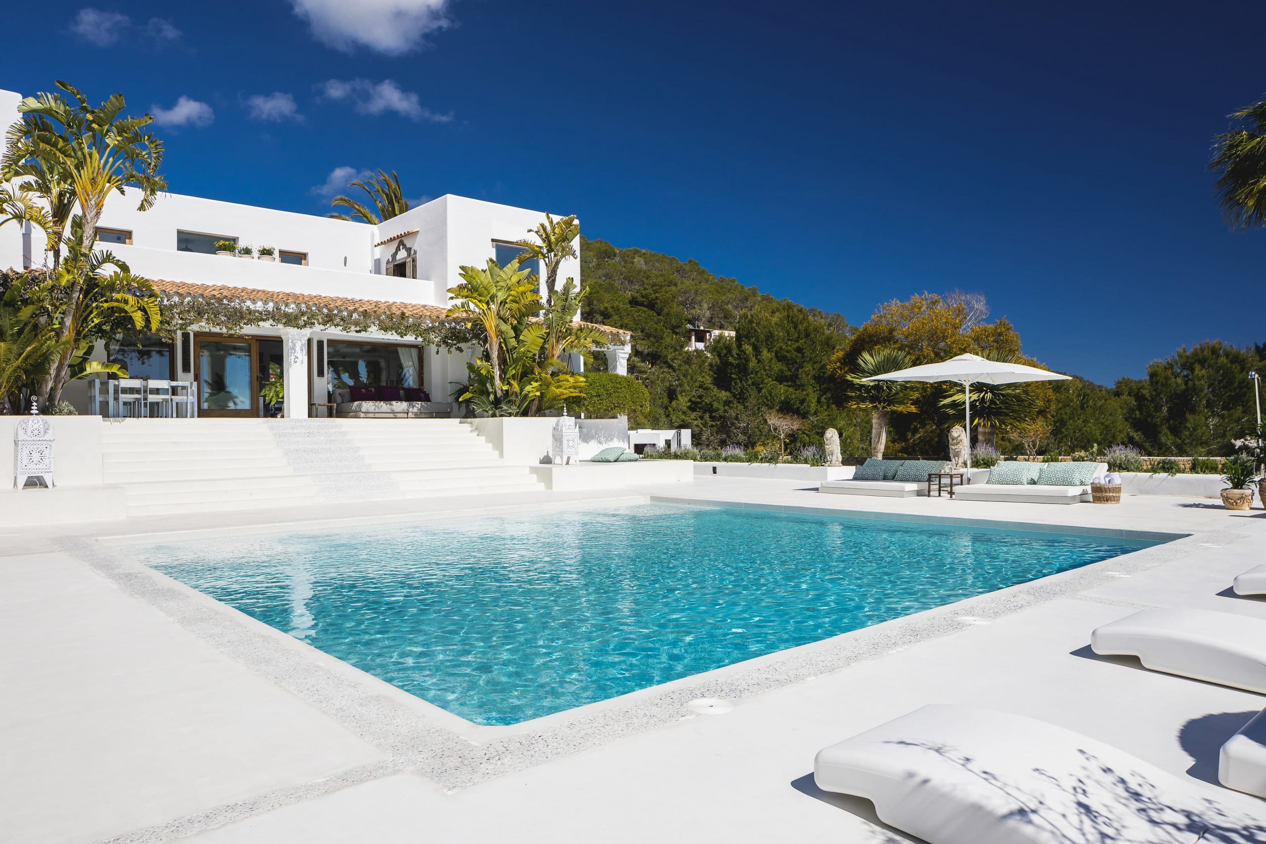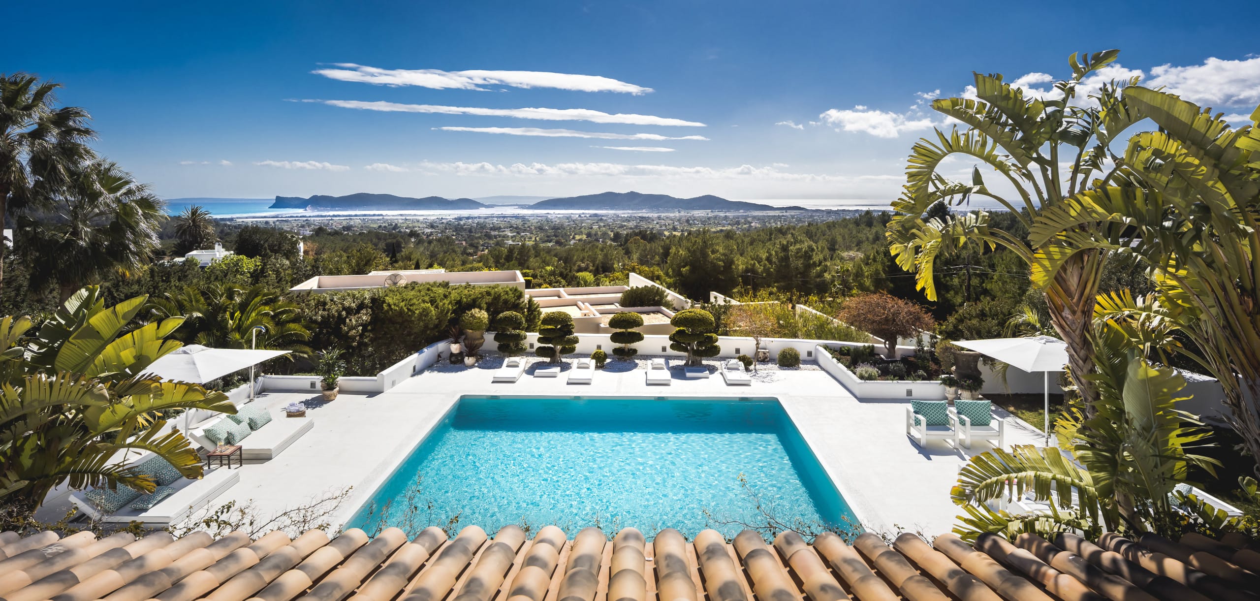 Located on top of a hill just 4 km away from Ibiza town, this beautiful villa in Ibiza with pool is orientated south and has fantastic panoramic sea views towards Formentera. It has a main house of 450 square meters plus an annex of 120 square meters. and a large panoramic Swimming pool.