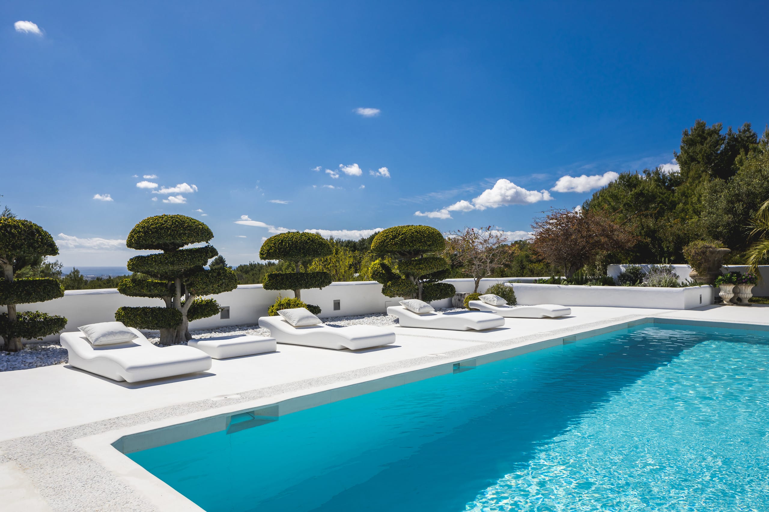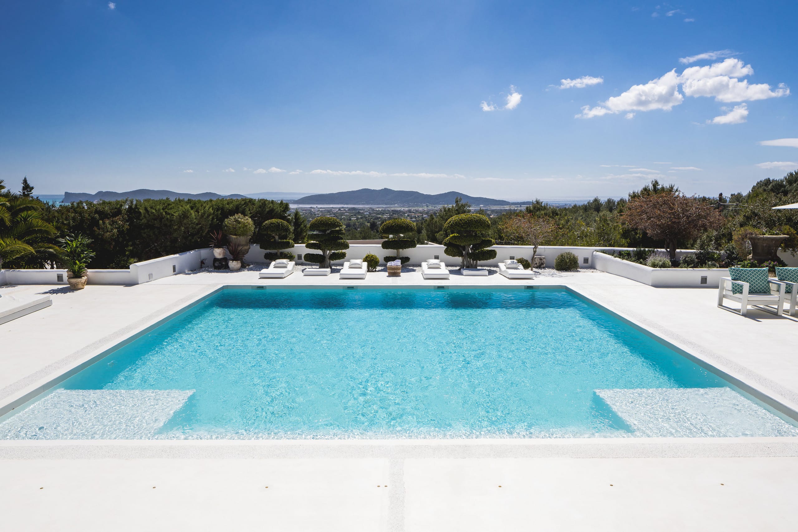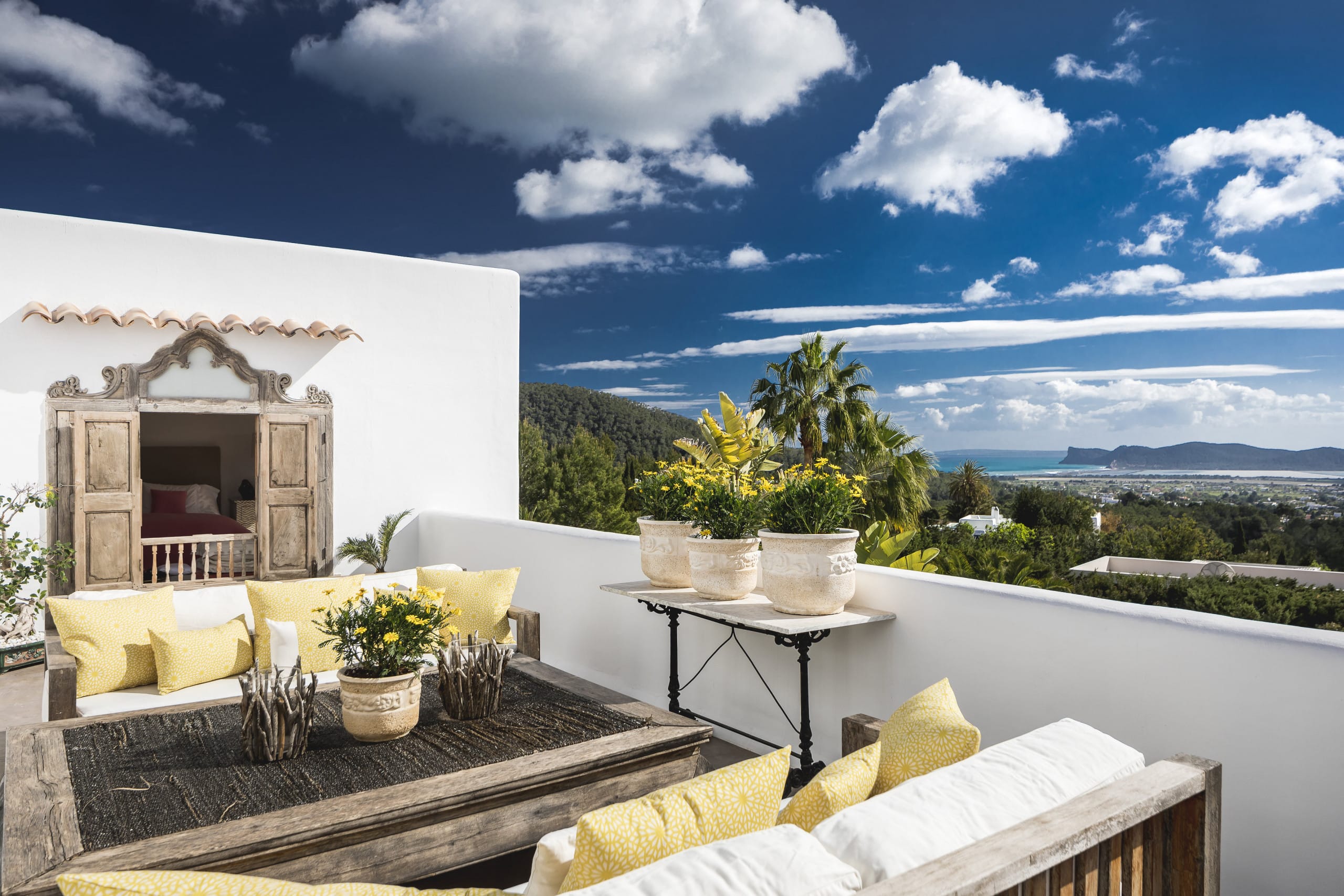 Located on top of a hill just 4 km away from Ibiza town, this beautiful villa in Ibiza with pool is orientated south and has fantastic panoramic sea views towards Formentera. It has a main house of 450 square meters plus an annex of 120 square meters. and a large panoramic Swimming pool.
