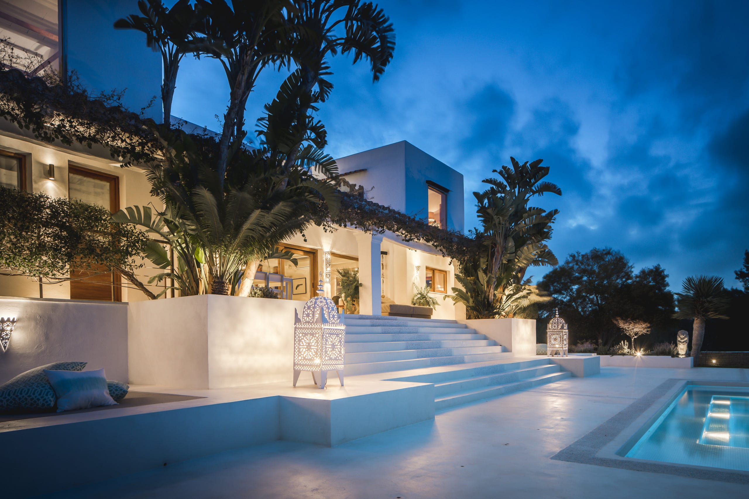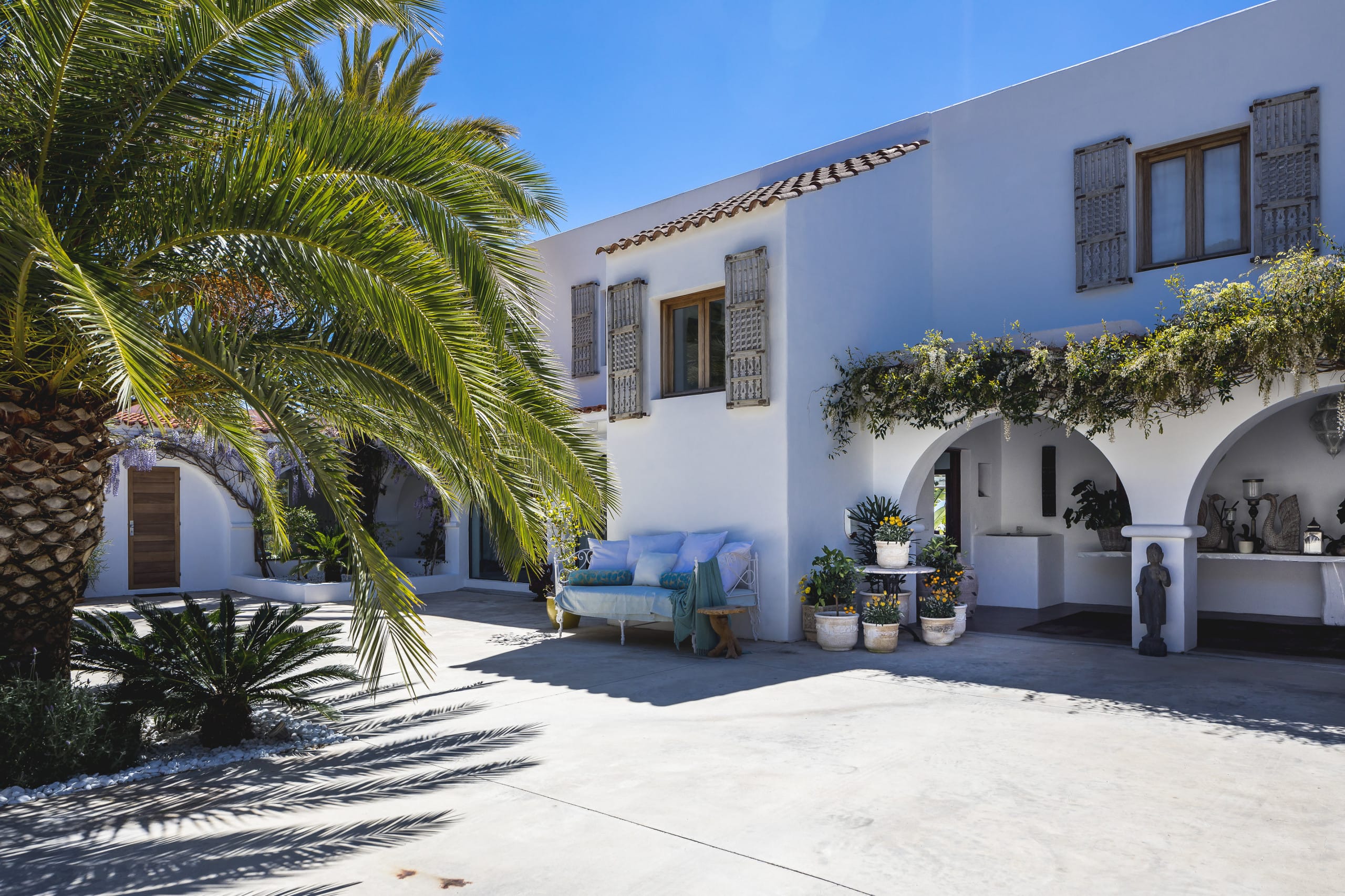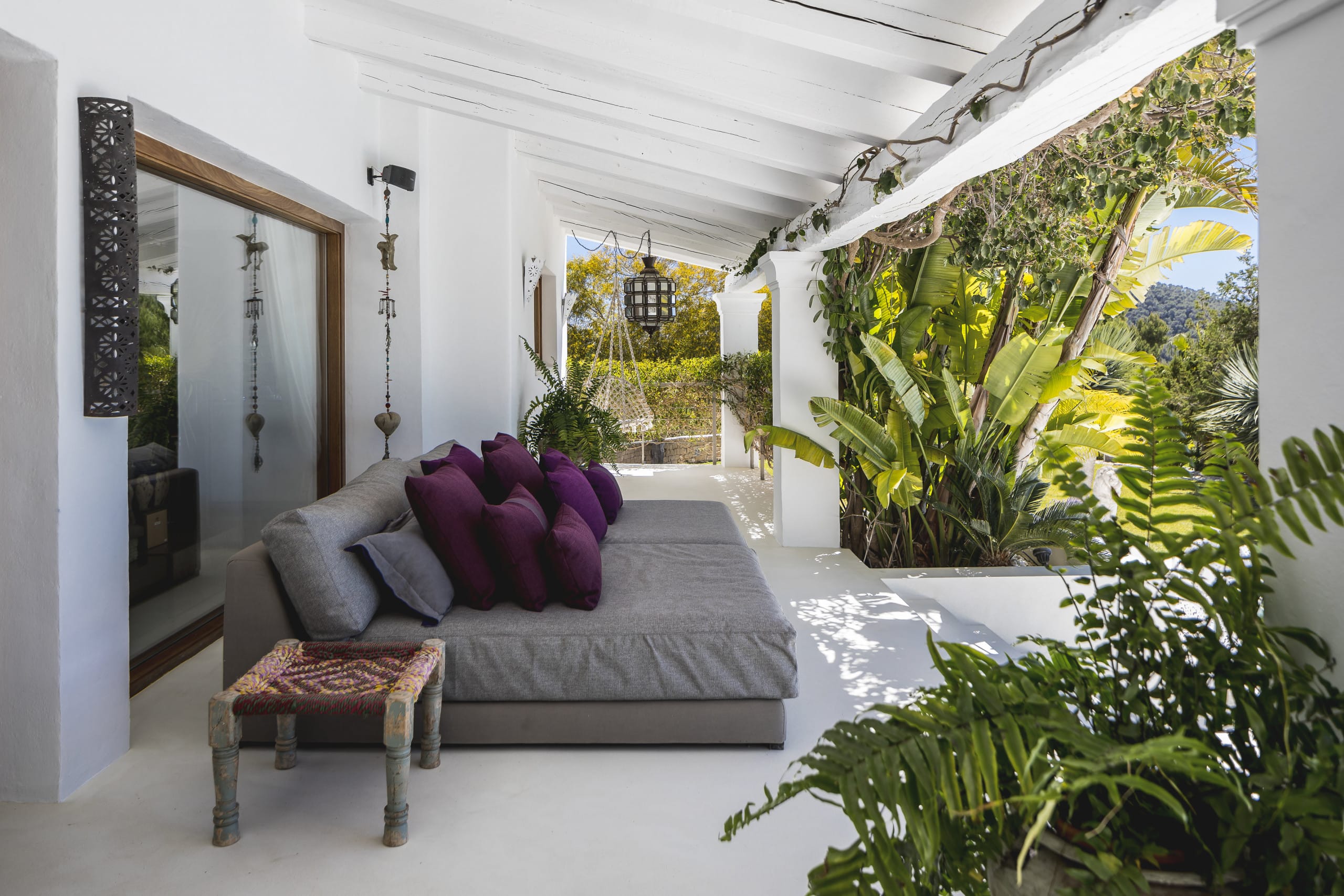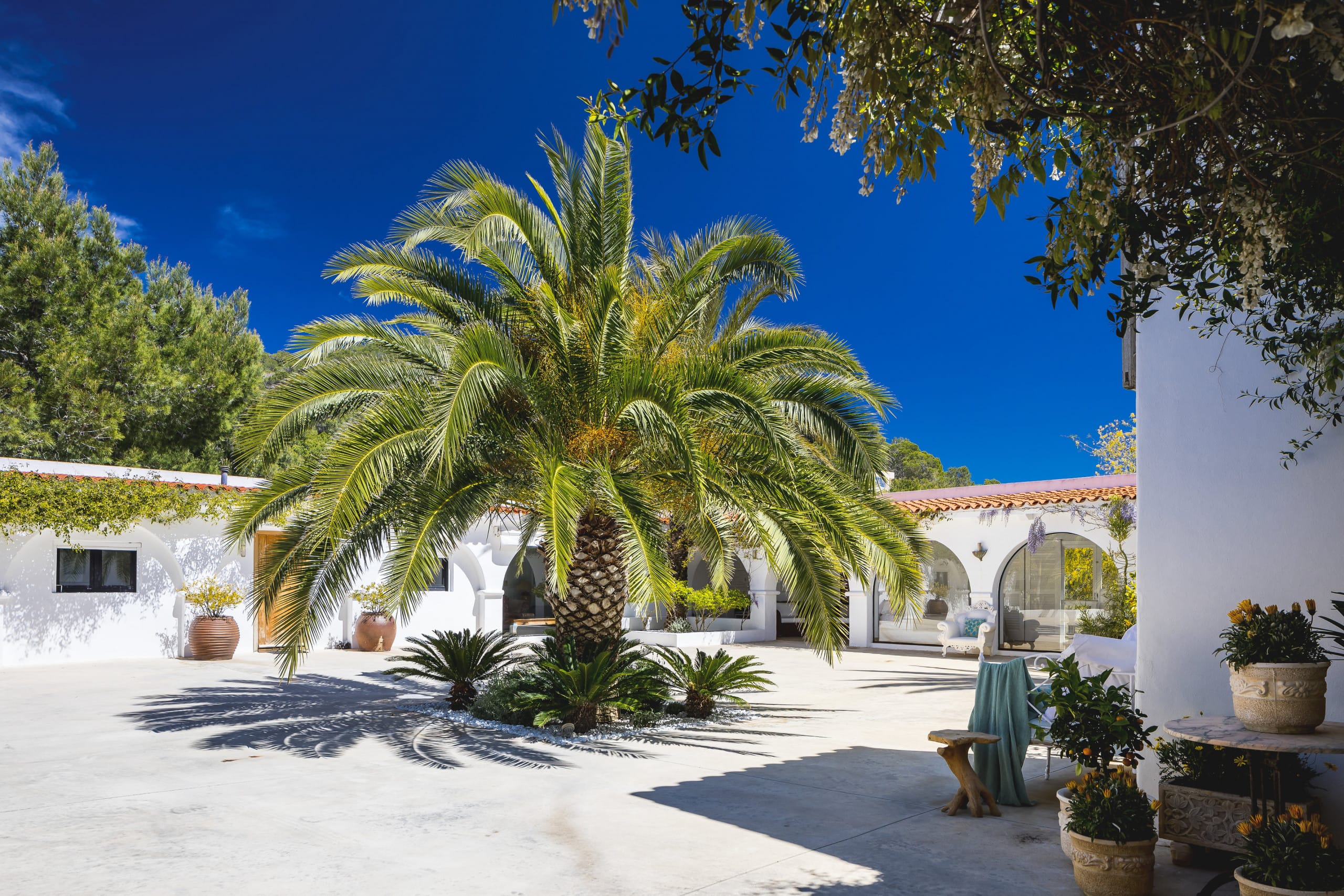 Located on top of a hill just 4 km away from Ibiza town, this beautiful villa in Ibiza with pool is orientated south and has fantastic panoramic sea views towards Formentera. It has a main house of 450 square meters plus an annex of 120 square meters. and a large panoramic Swimming pool.