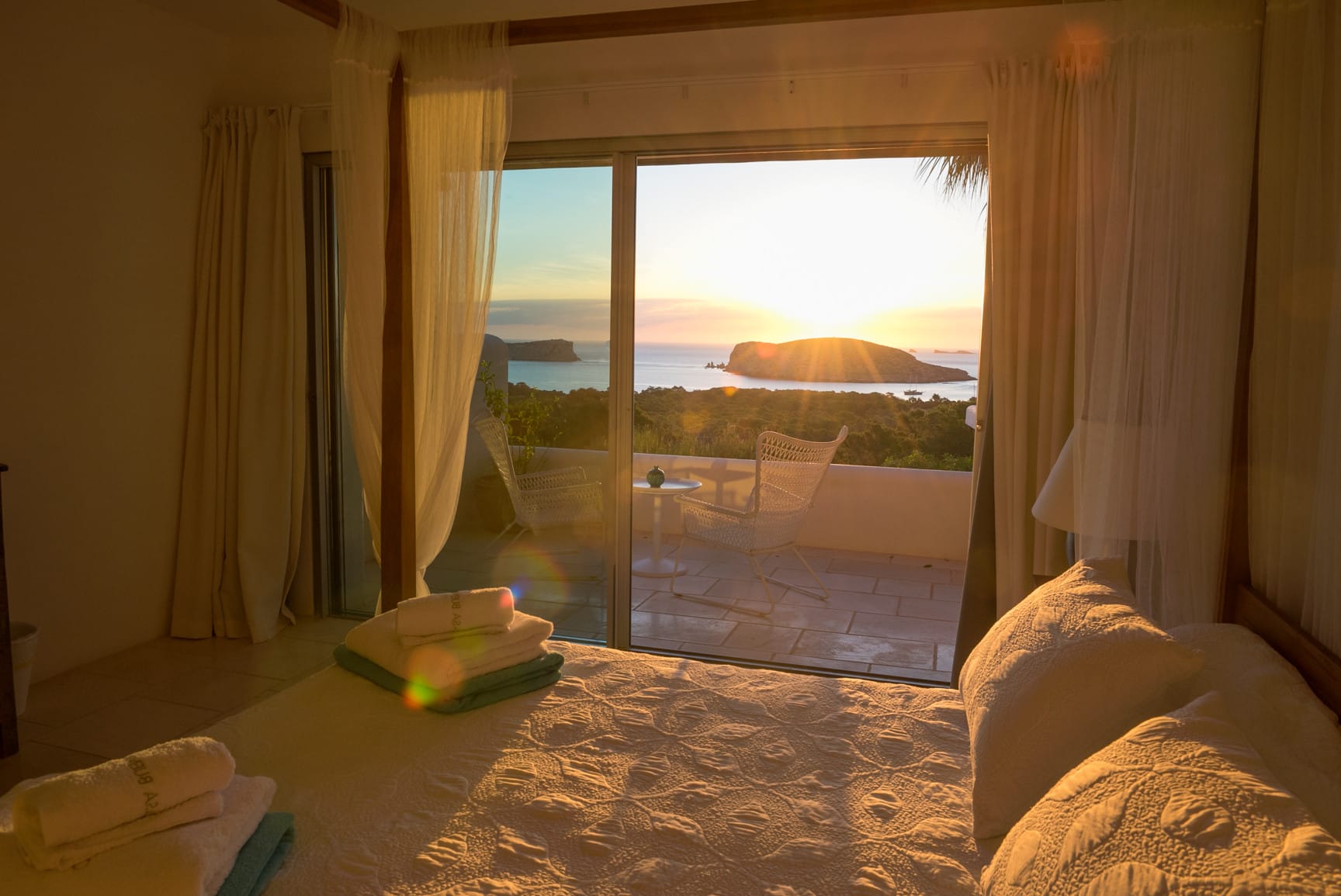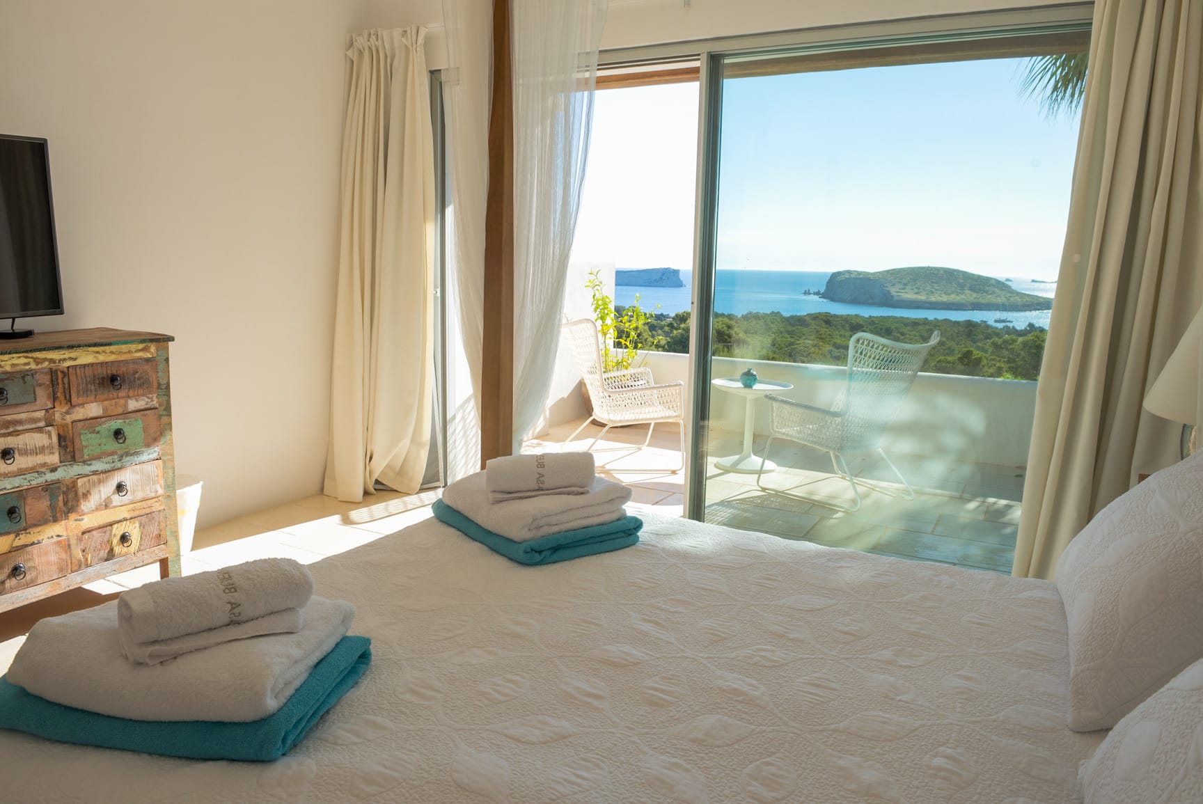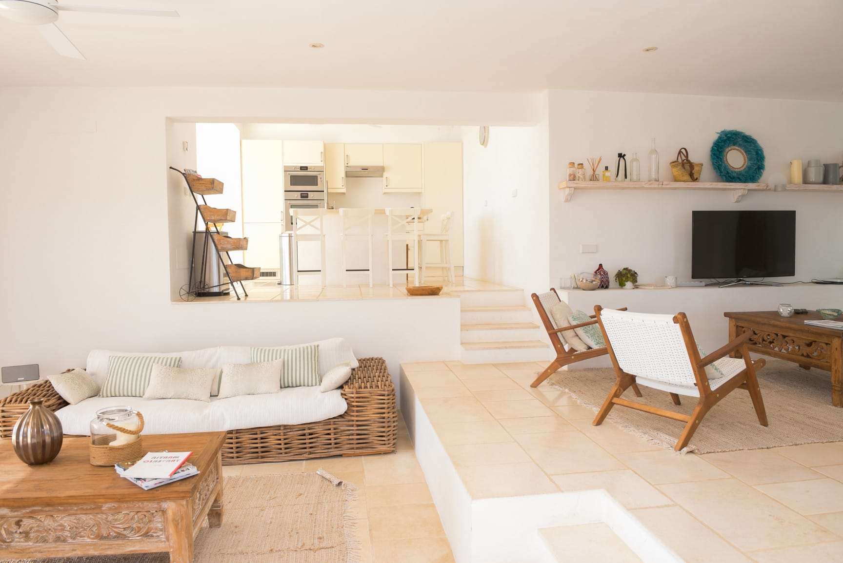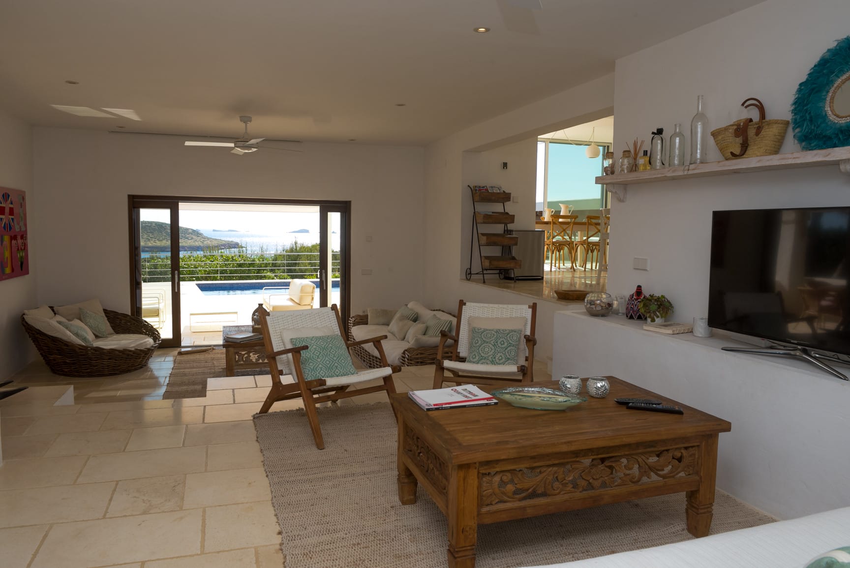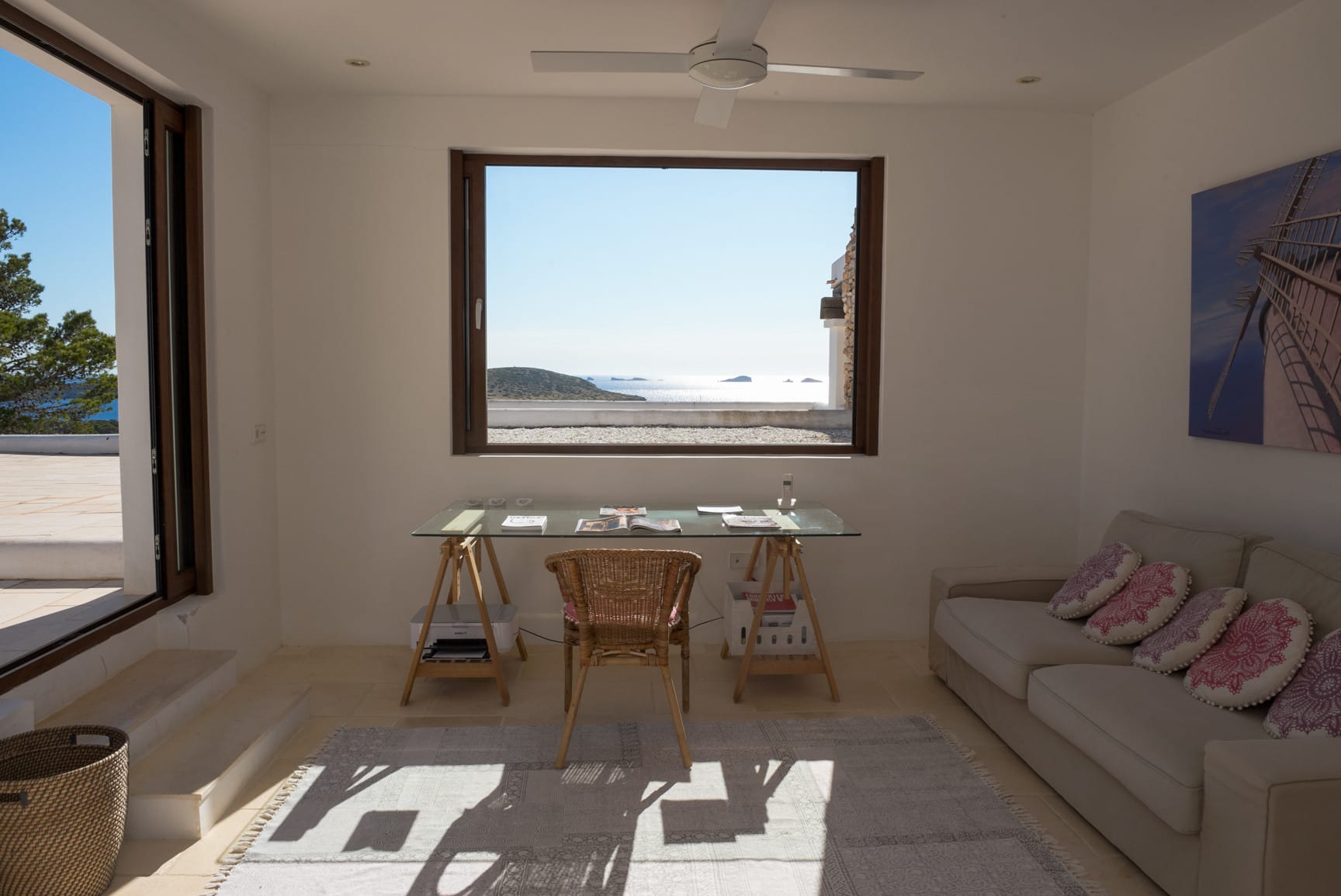 Spacious and bright living room with 3 sofas areas equipped with Sonos equipment, Wi-Fi, large windows that let you see the islets of Cala Conta, as Illa des Bosc.