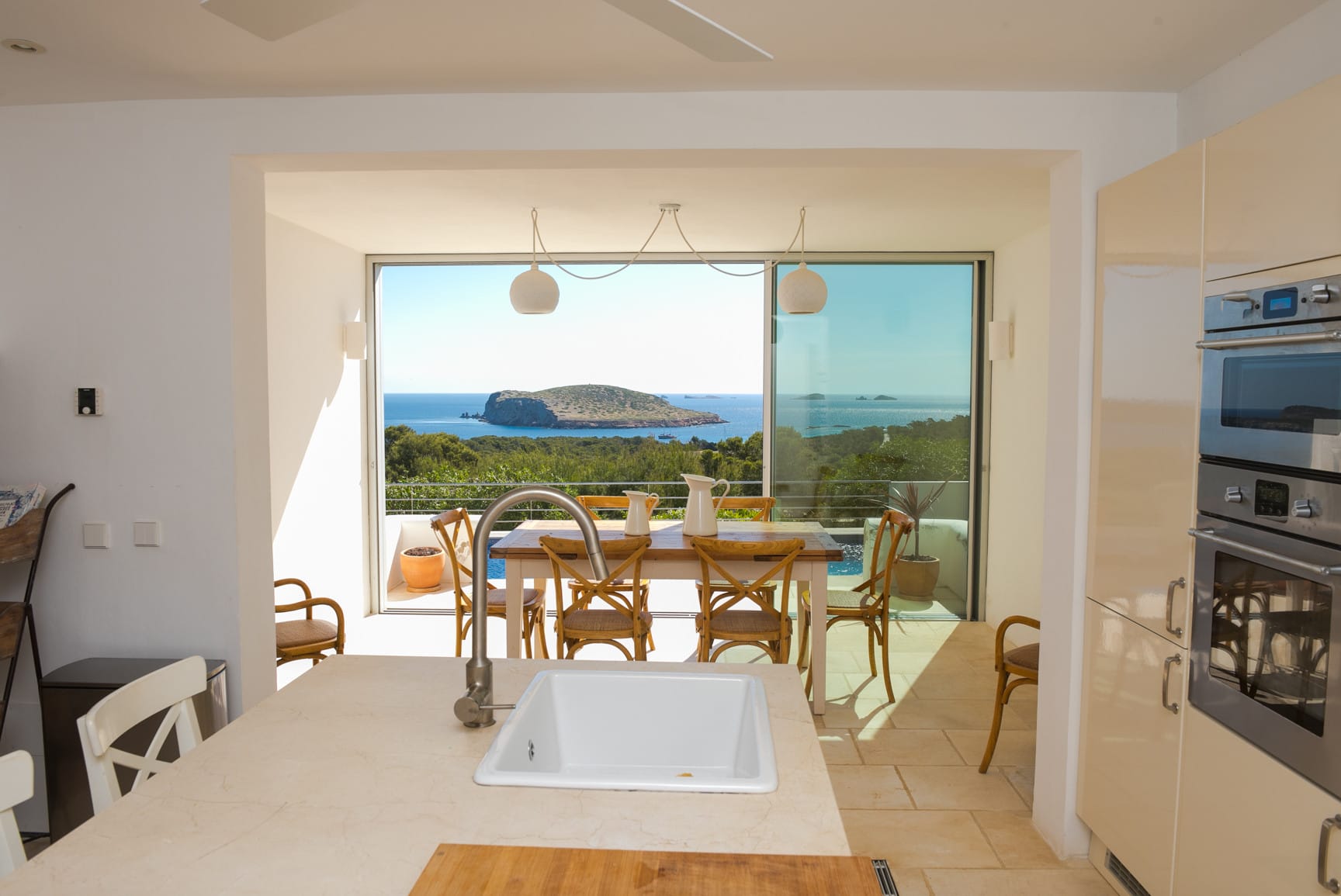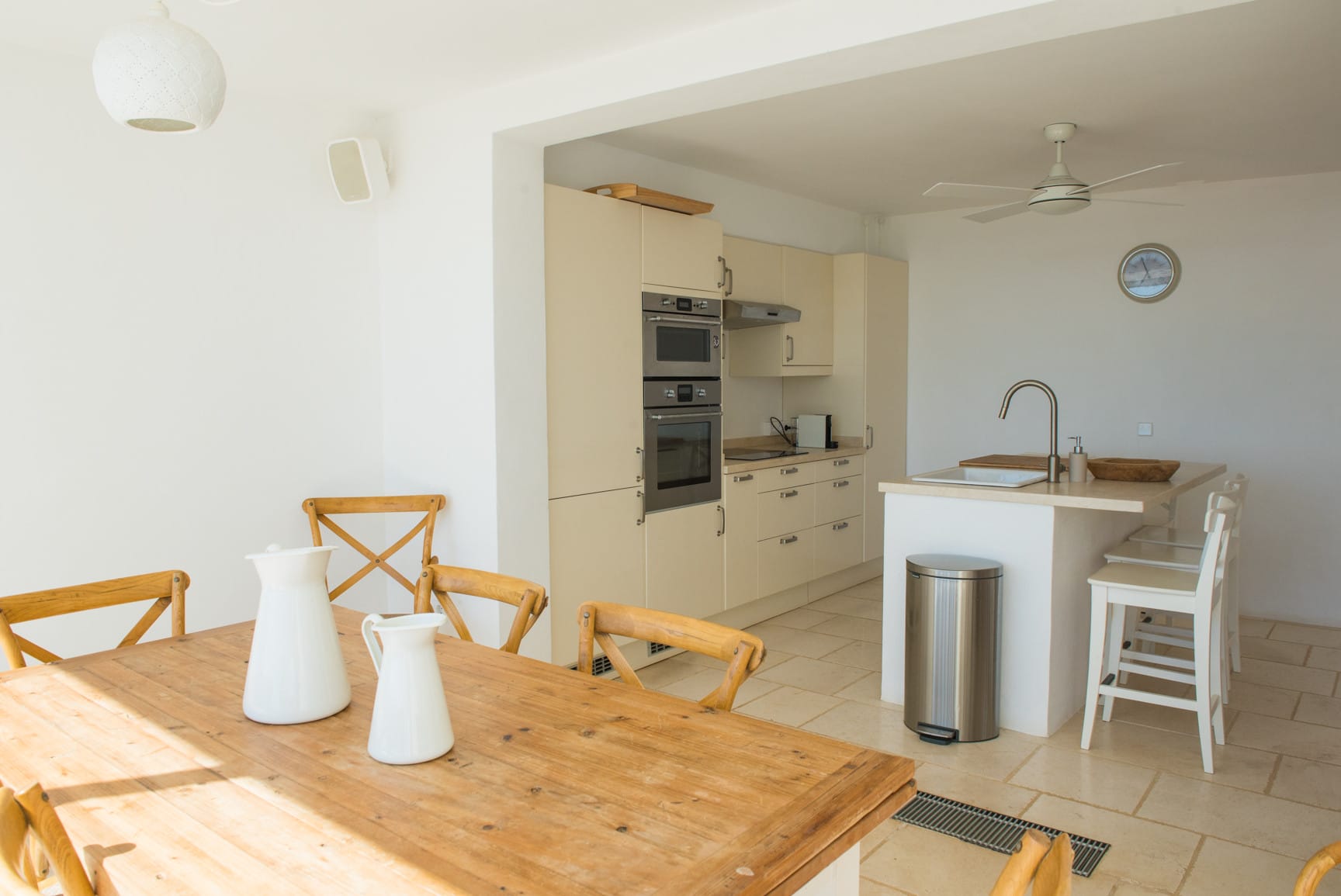 Fully equipped kitchen with center island, dining table for 8 people, large windows overlooking the sea