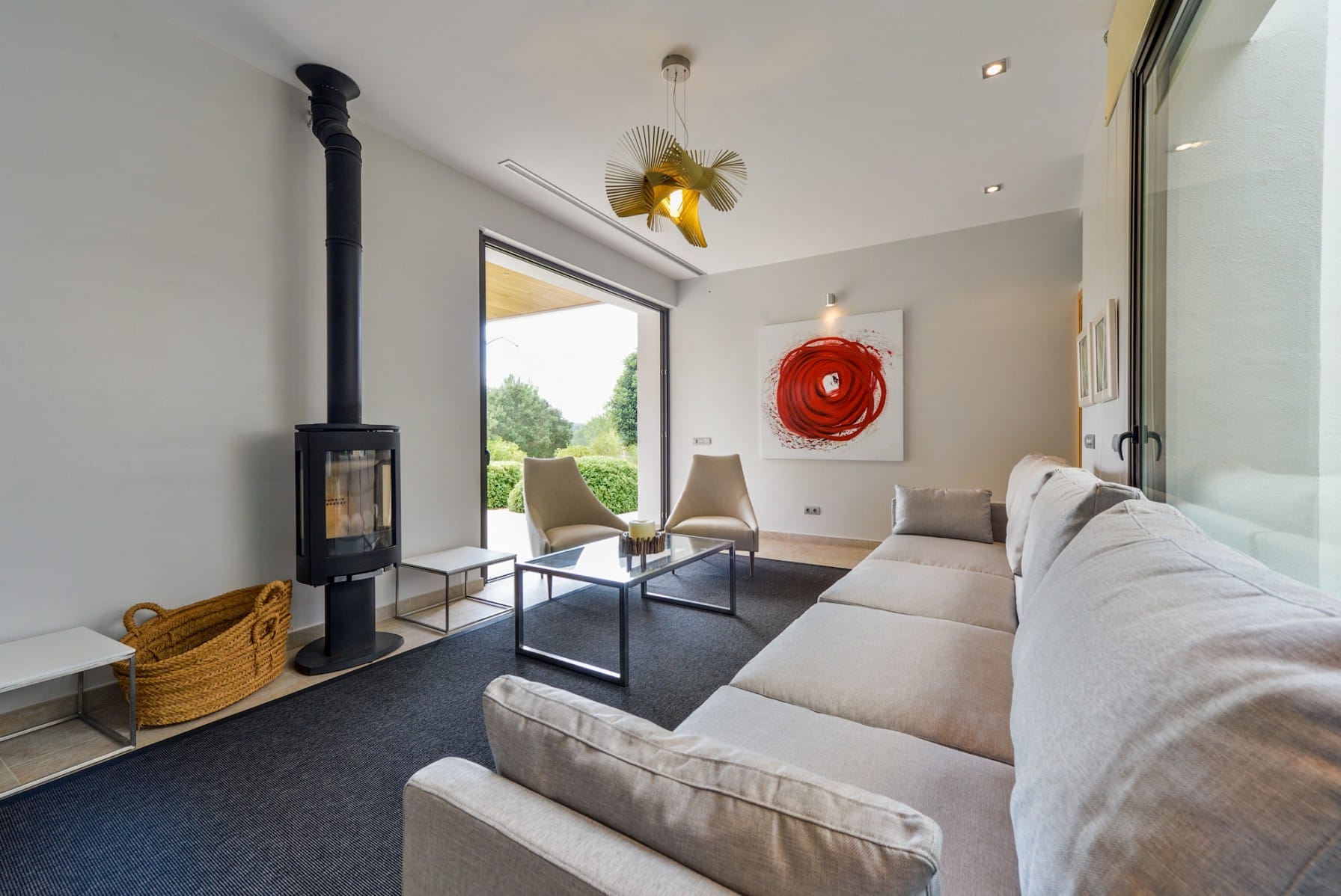 On the ground floor there is an interior patio “Zen” with plants, surrounded by large windows. Beside this there is a guest toilet. Following the left we find the living room, a fully equipped kitchen with pantry, all with access to the covered terrace, several seating areas and pool. There is also another living room with fireplace, perfect for reading.