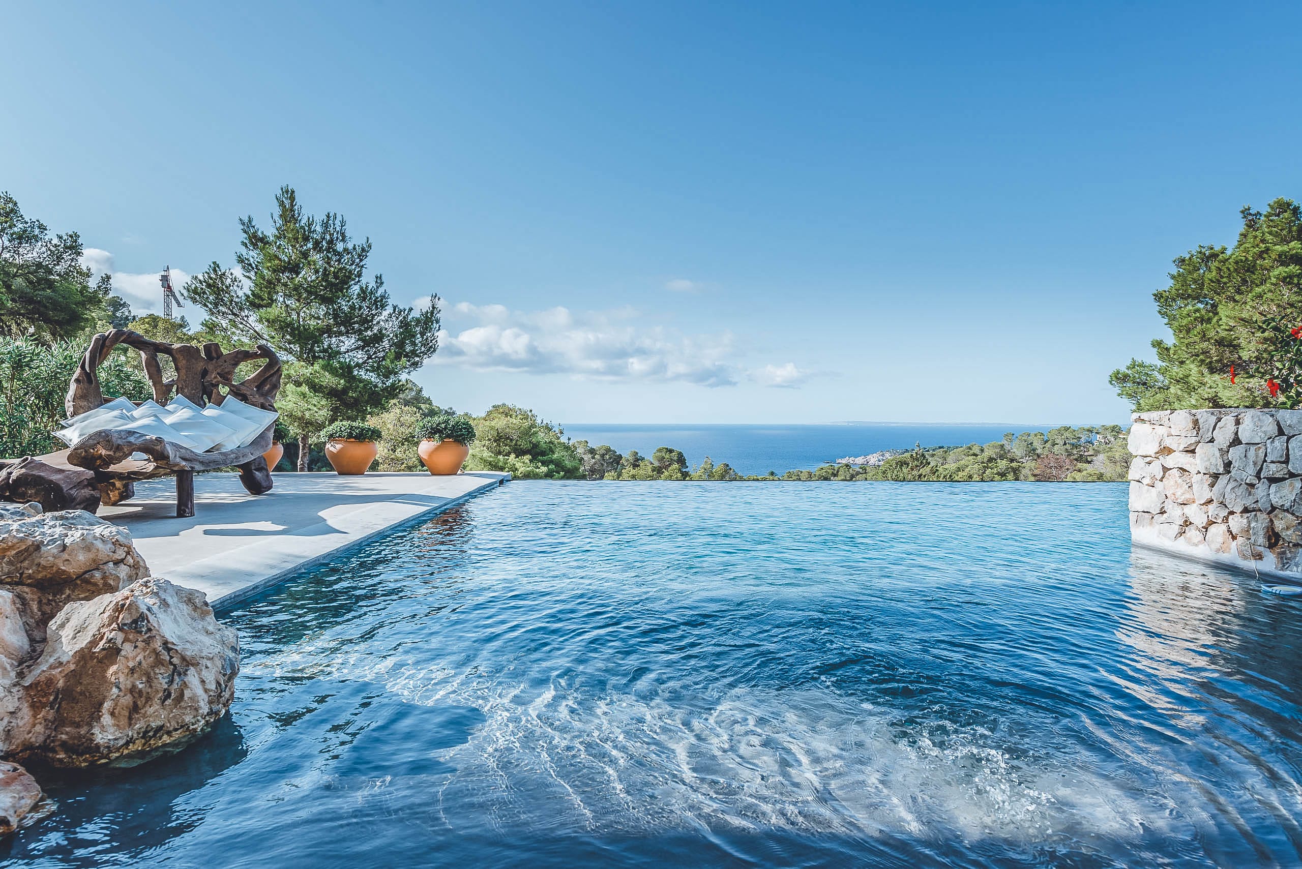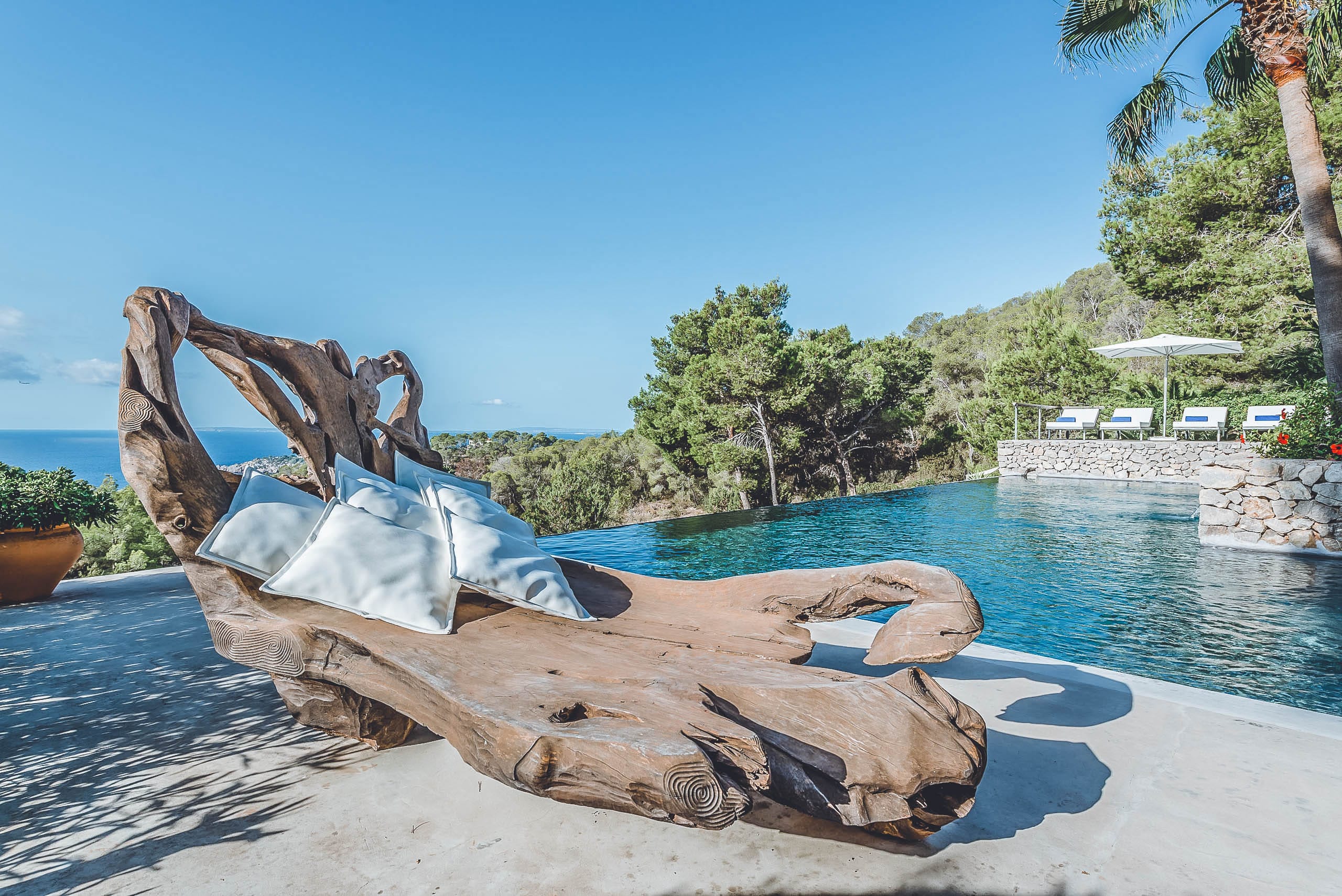 Outside, a fabulous garden of palm trees and a beautifully decked terrace around the inviting infinity swimming pool and an abundance of fully furnished chill out spaces. For starlit dinners, the fully fitted kitchen and luxury outdoor dining area will allow you to enjoy the splendid views across the sparkling turquoise waters.
