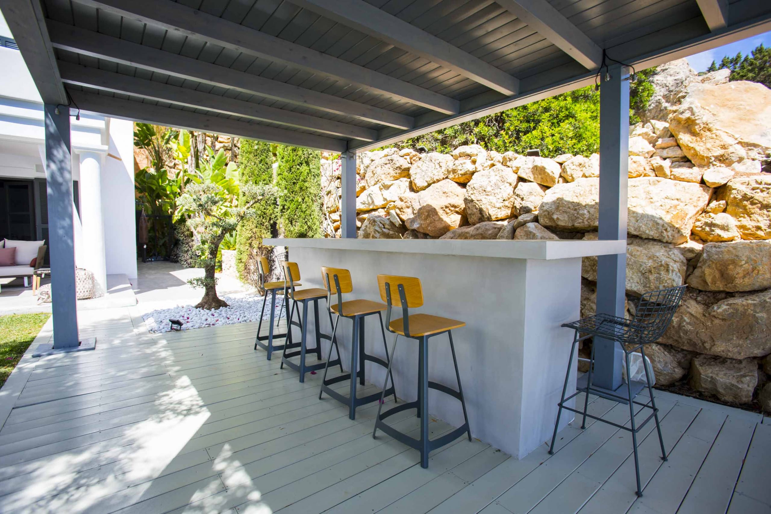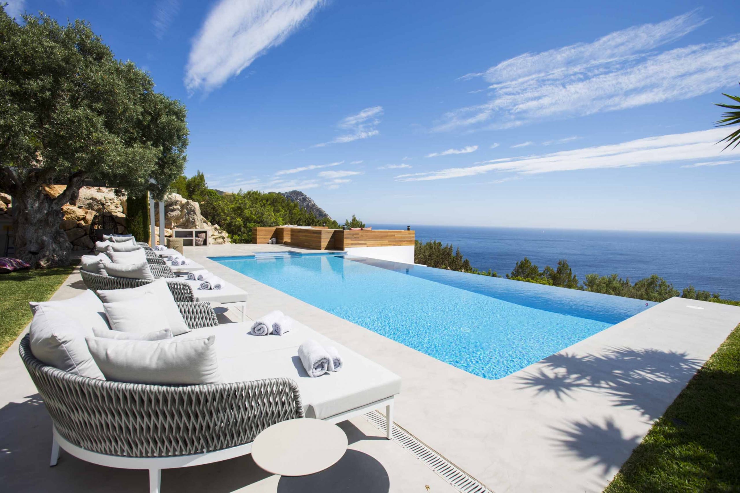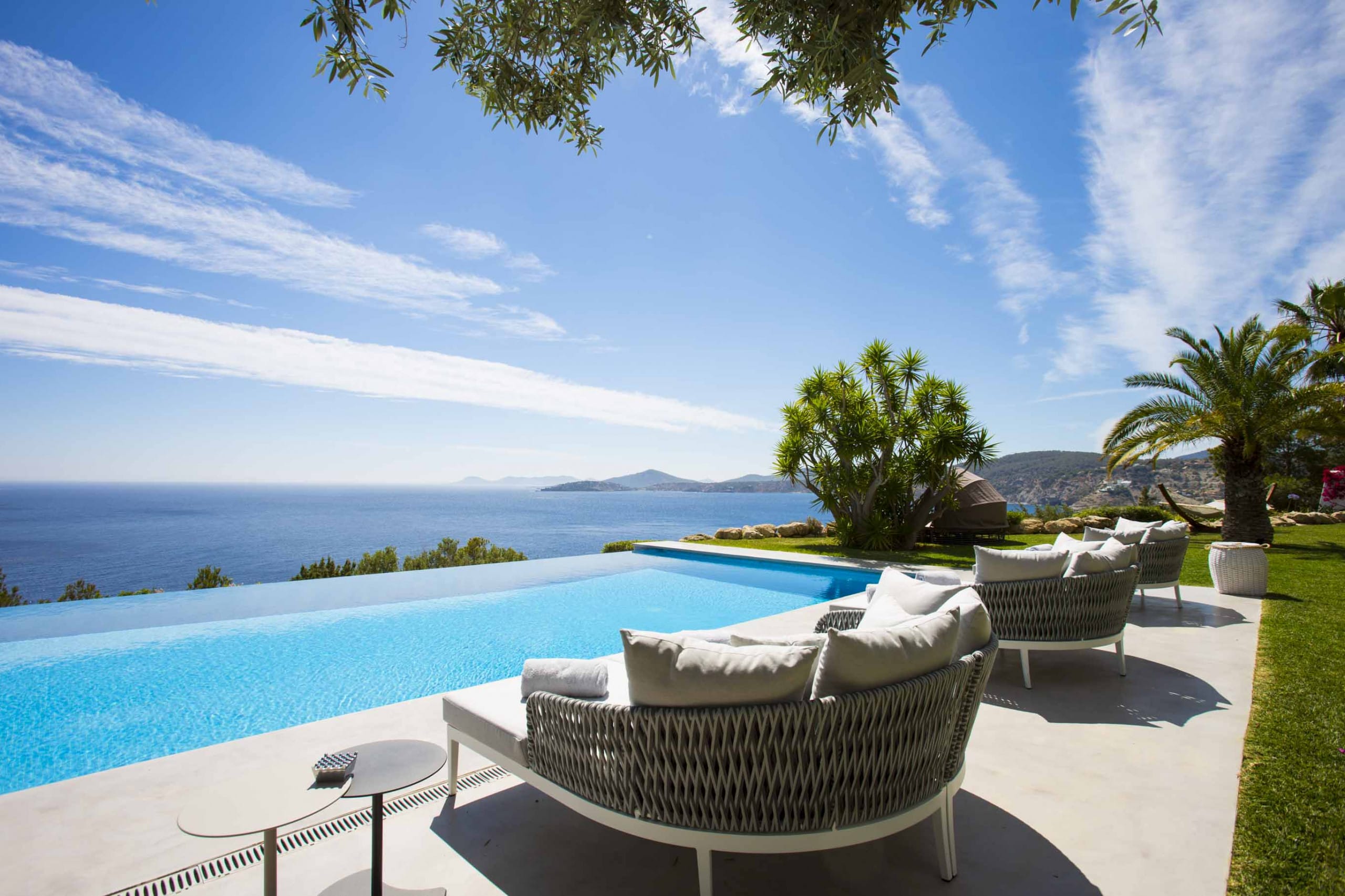 The most exclusive private urbanization in Ibiza composed of 15 amazing and independent villas. This fully renovated stylish villa with sea views of 600 sqm of indoor living space with 2 living rooms and a full equipped kitchen and a capacity for 12 pax that offers a limitless view of blue ocean and sky, melting into each other. Only 1 minute away from Ses Boques Beach in which our clients have priority access. Only 15 min from Ibiza Town and five min from San Josep and Cala Jondal beach.