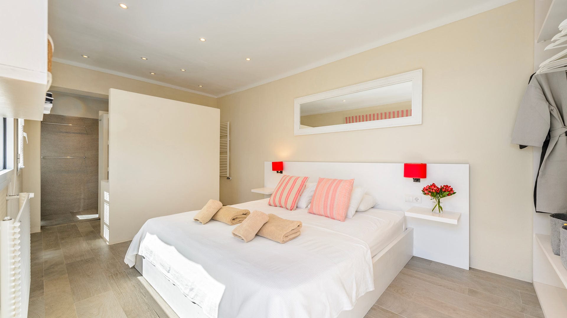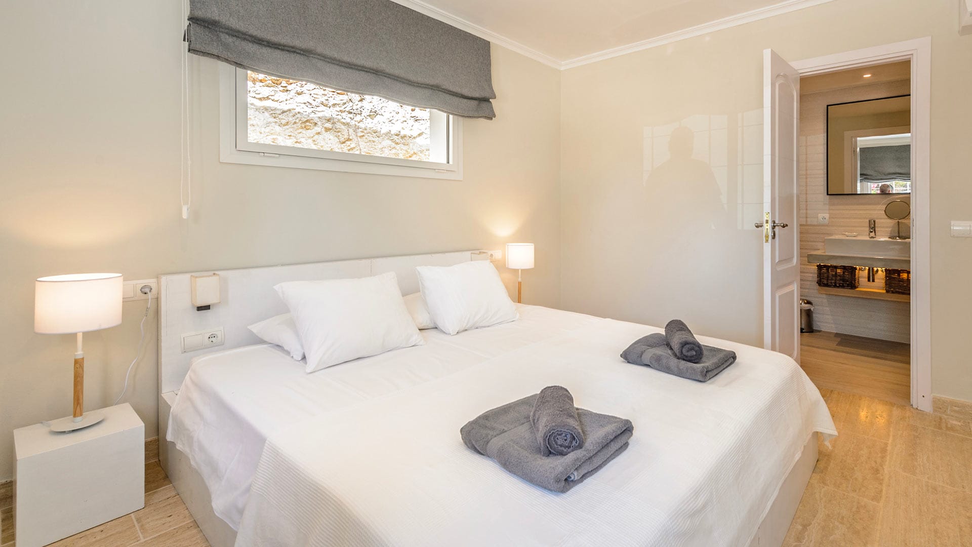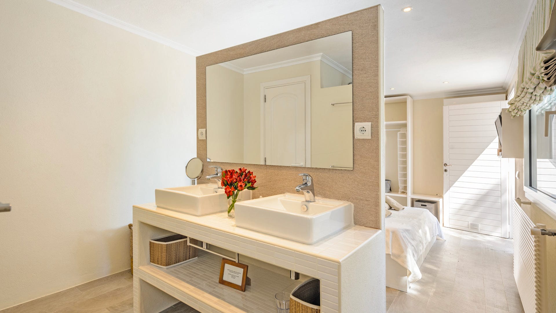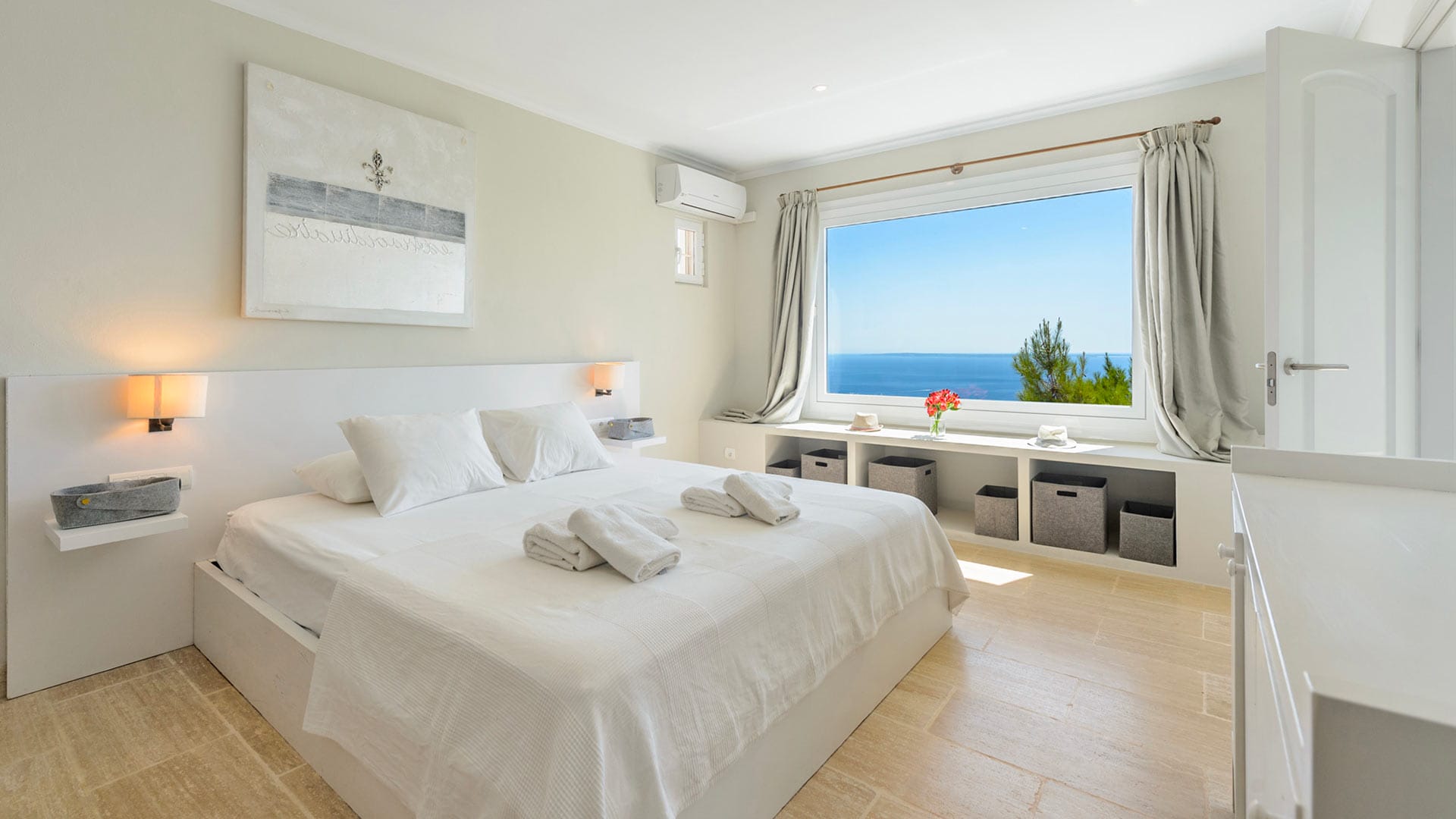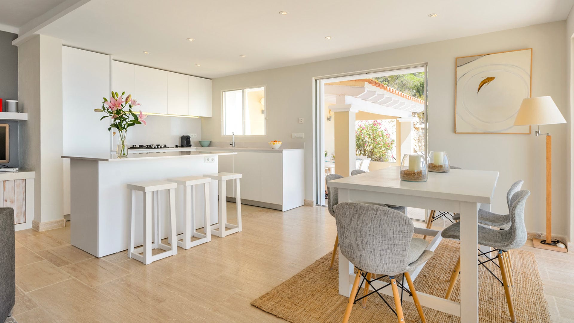 The vast rooms and white surfaces, along with contemporary, boho chic furniture and décor made entirely of natural materials, contribute to an overall sensation of tranquillity and remoteness. A stunningly stylish open-plan kitchen is the ideal setting for entertaining and catering to guests and family. The four double bedrooms are all furnished in the same style, with relaxing colors, textures, and materials.