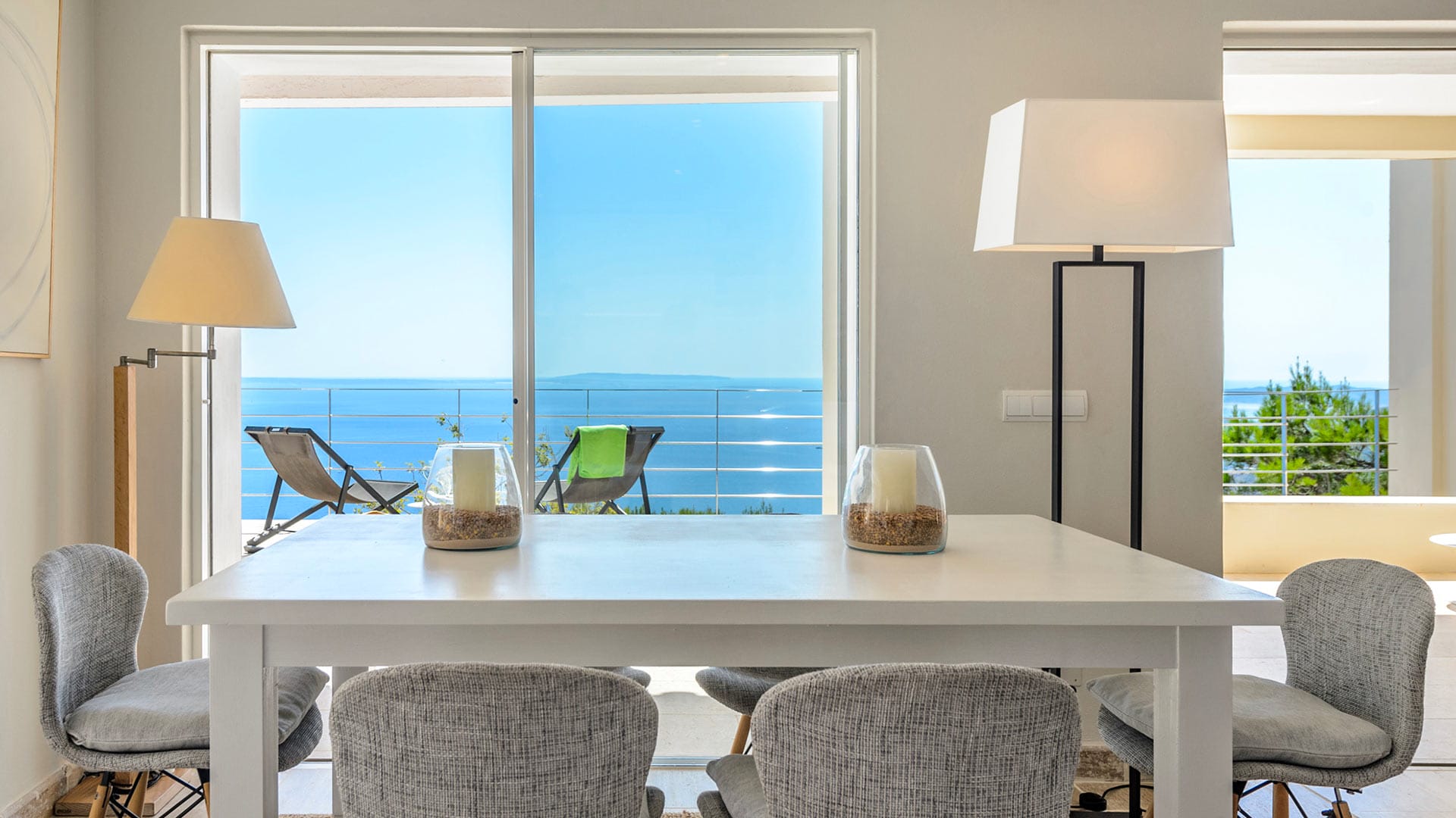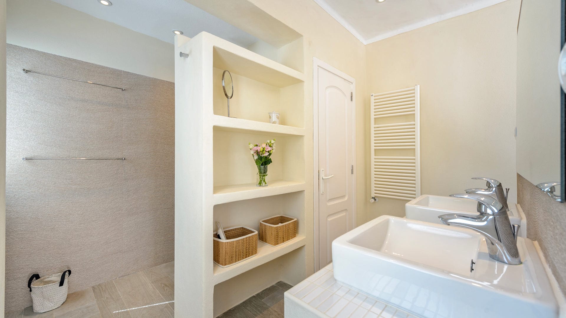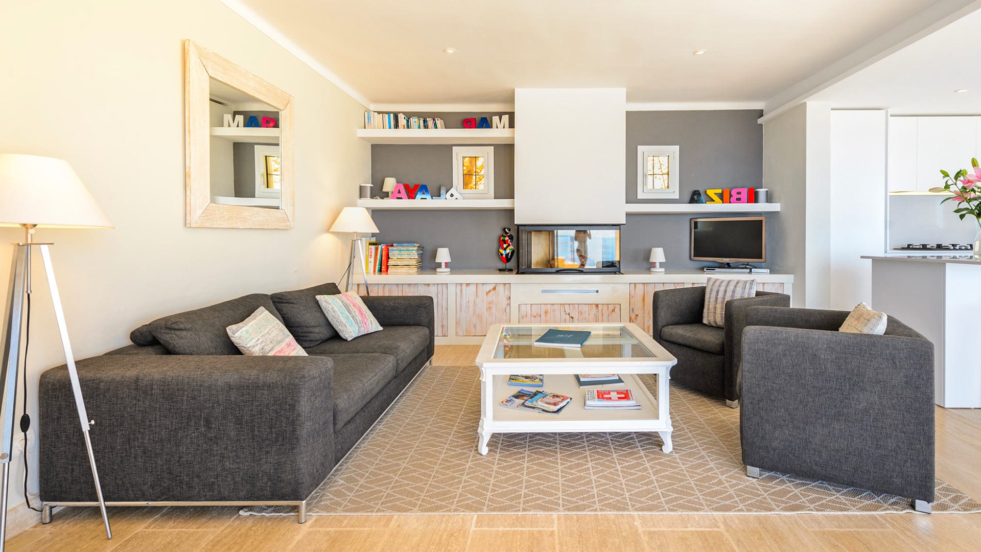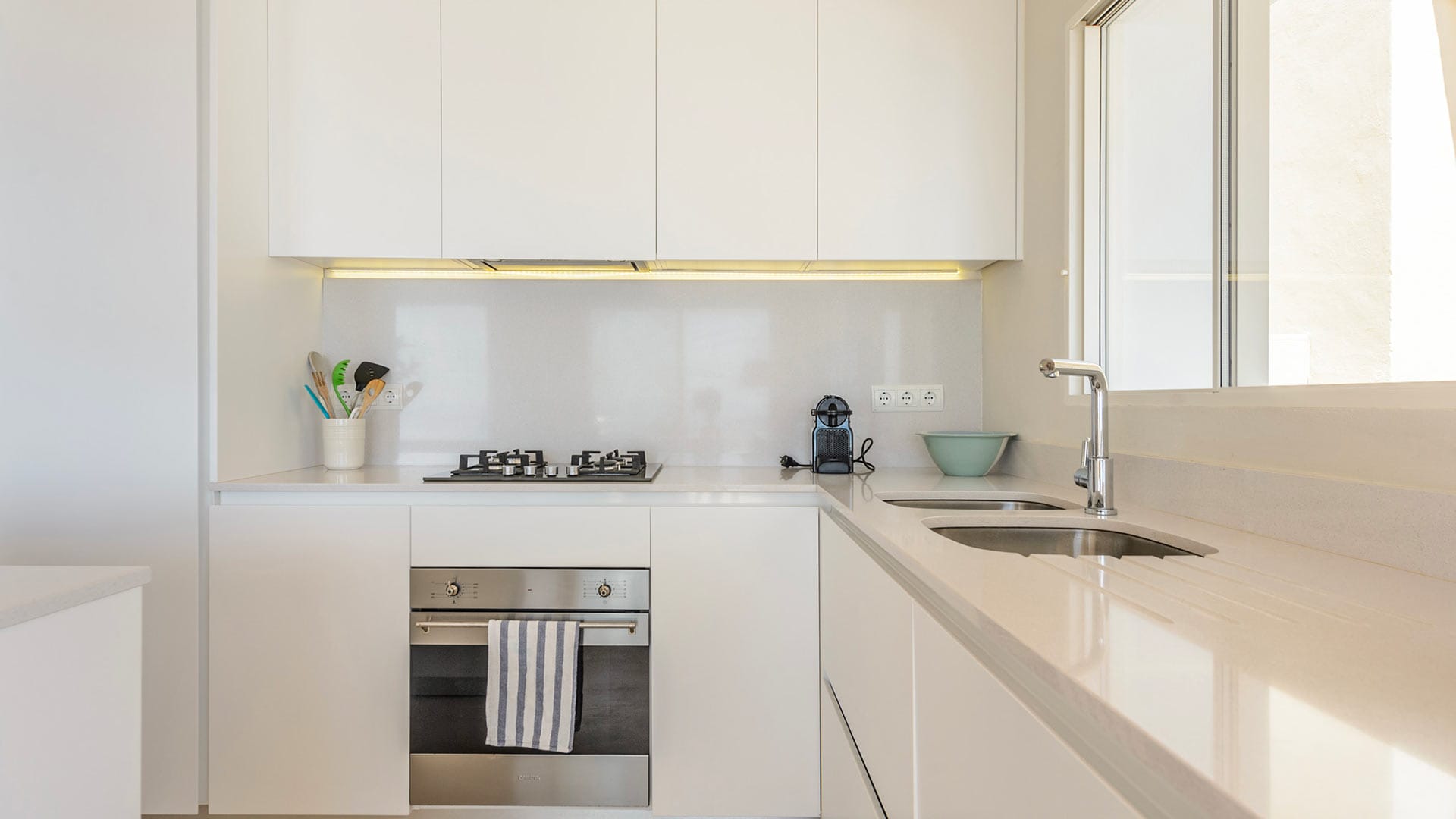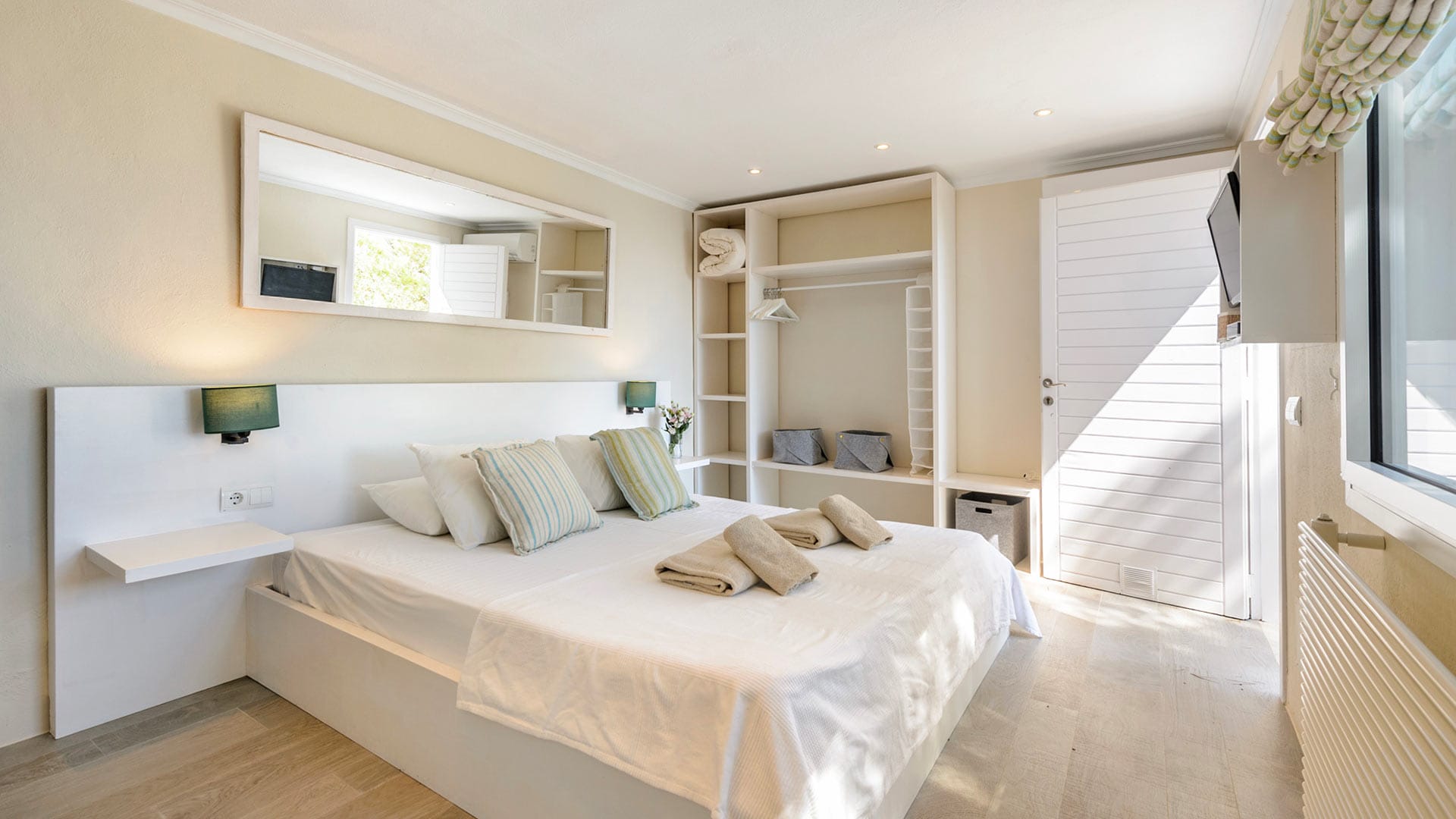 The vast rooms and white surfaces, along with contemporary, boho chic furniture and décor made entirely of natural materials, contribute to an overall sensation of tranquillity and remoteness. A stunningly stylish open-plan kitchen is the ideal setting for entertaining and catering to guests and family. The four double bedrooms are all furnished in the same style, with relaxing colors, textures, and materials.