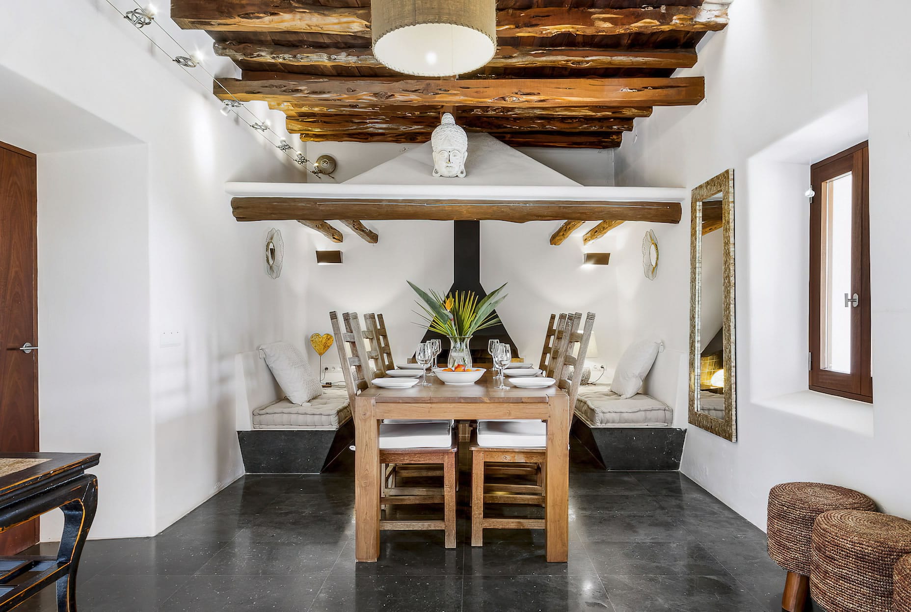 – Dining room with wood-burning fireplace