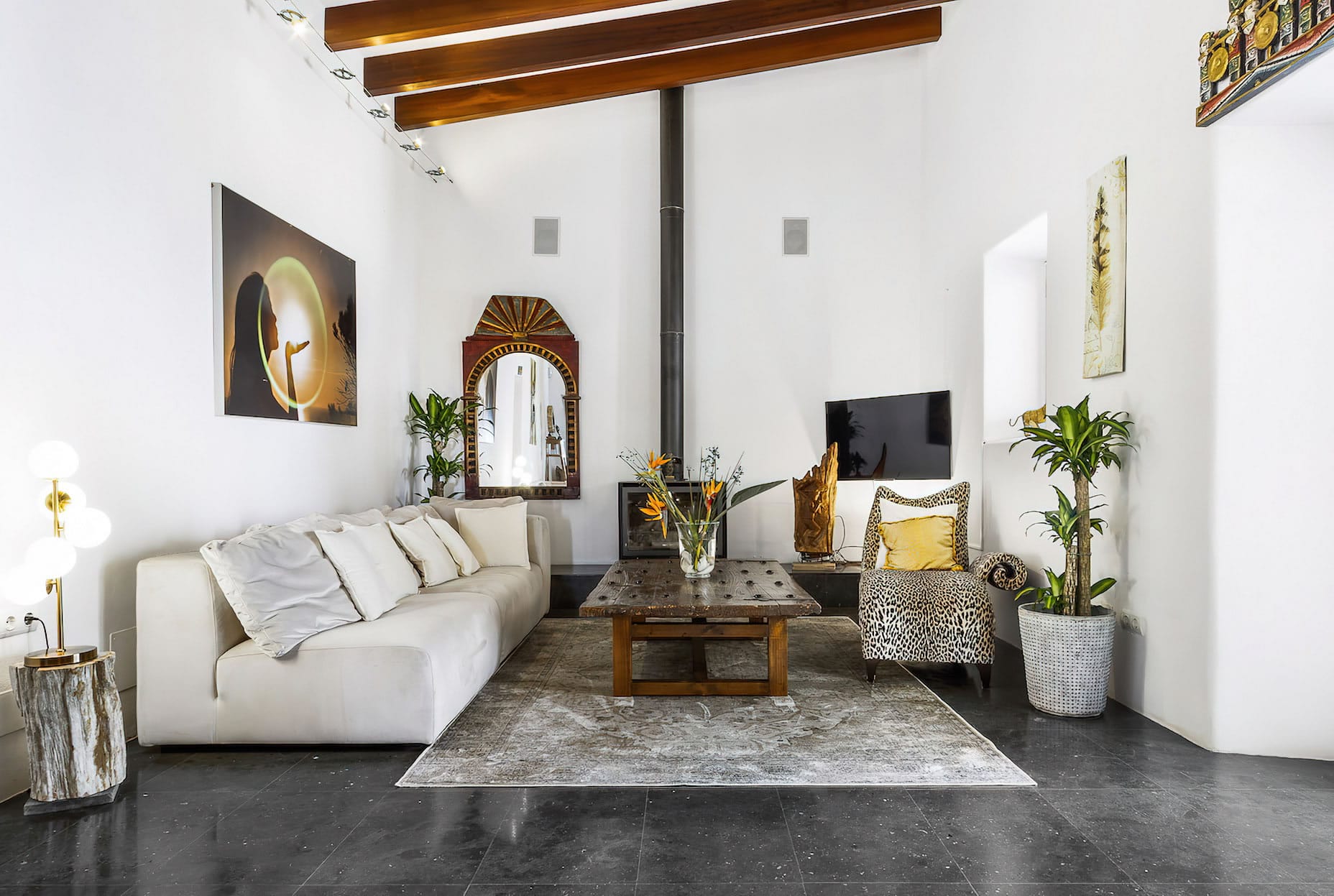 – A living room equipped with a television and a fireplace