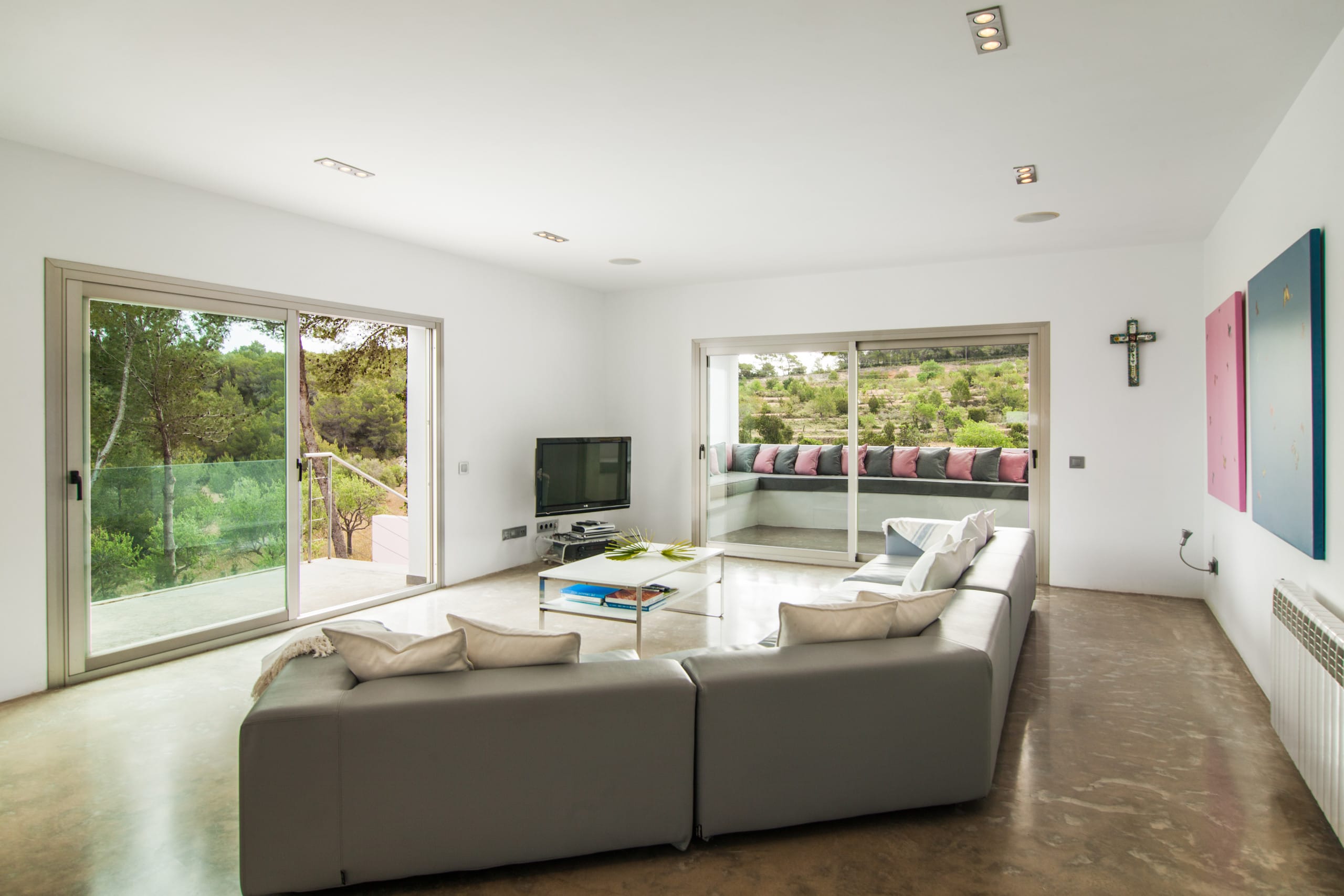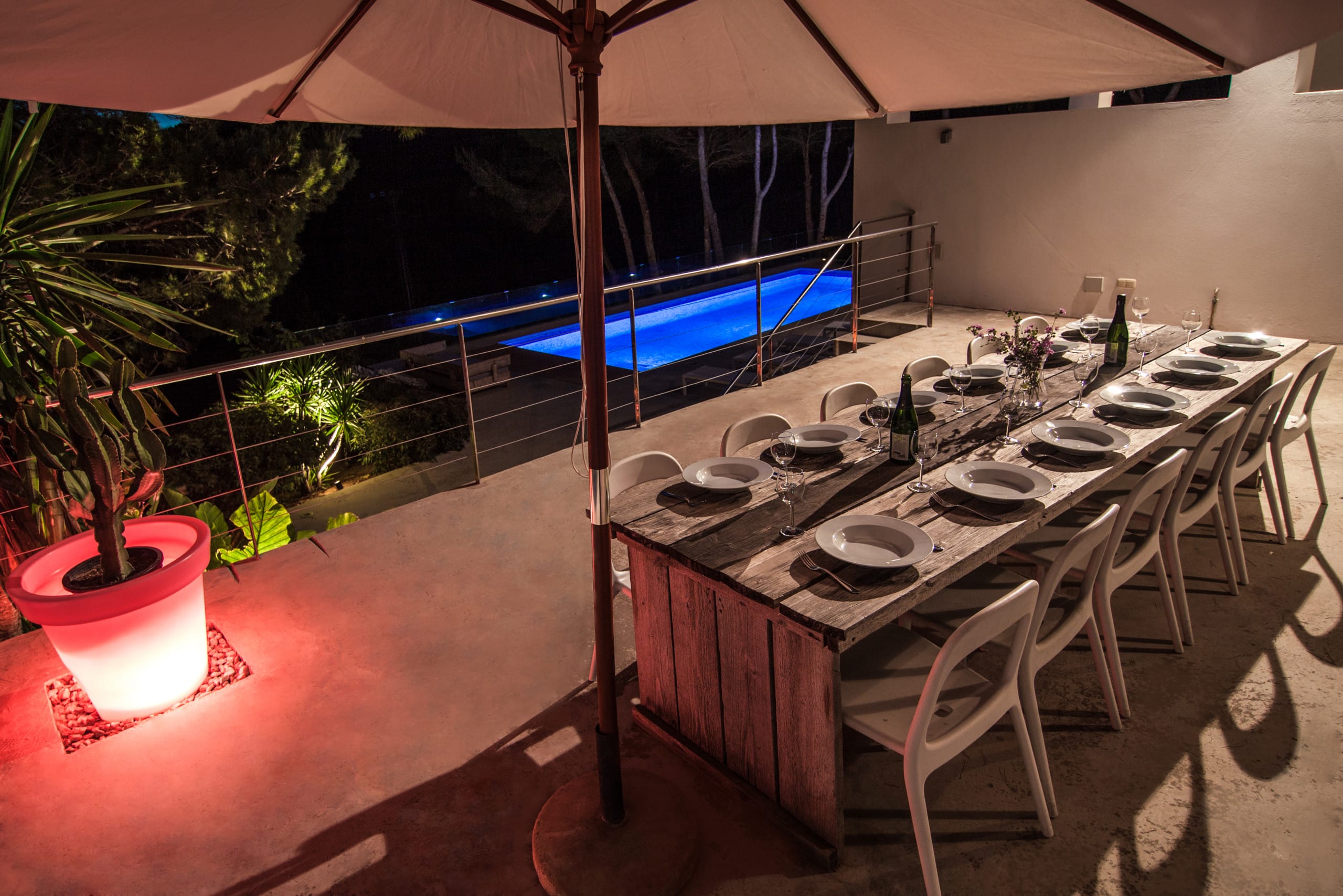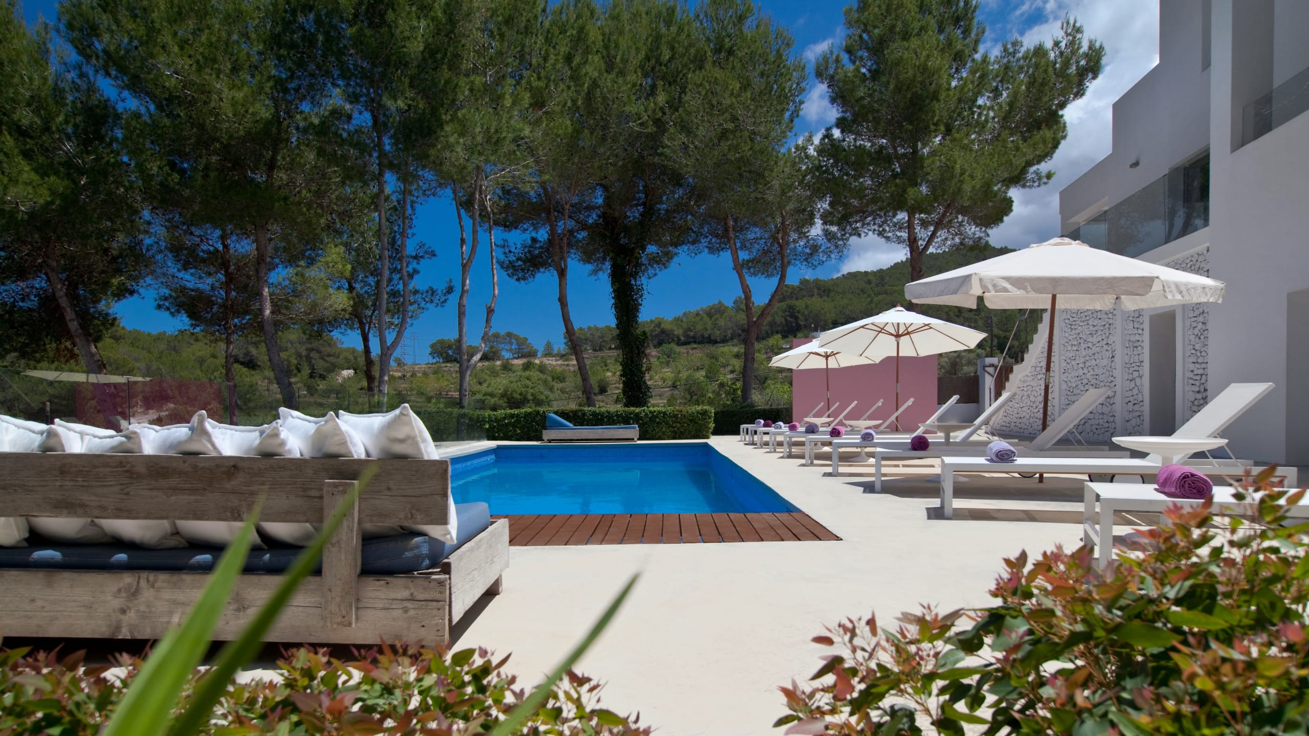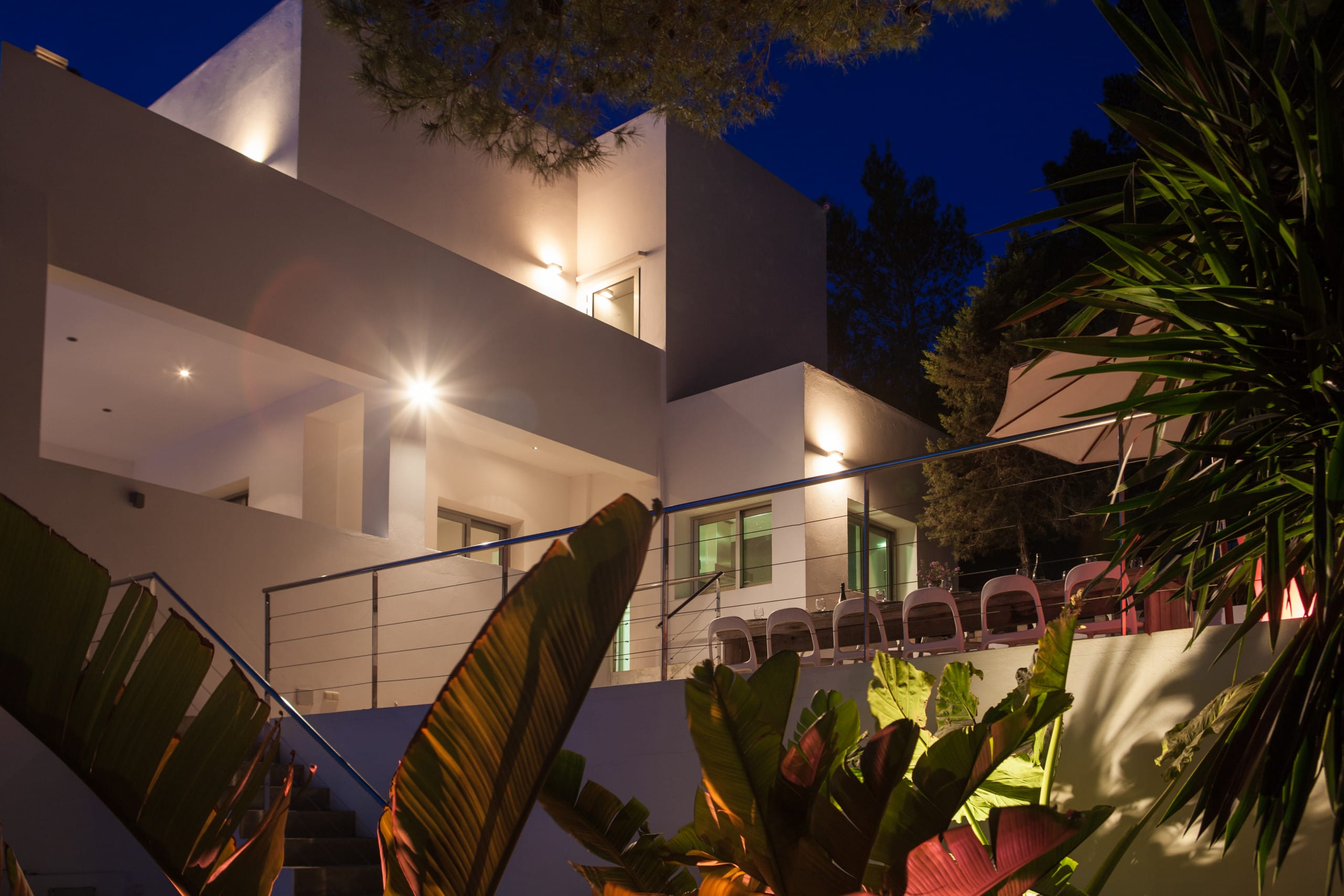 In this villa, there are six bedrooms and each one has its own bathroom. The house is both private and intimate because there are a lot of well-designed rooms and large common areas all over the house and the grounds. Building area 400 m2, land 2,600 m2. The villa is on the west side of Ibiza, near San Agustin. It’s about a five-minute drive to San Jose and 15 minutes to Ibiza town and the airport, so it’s easy to get around.