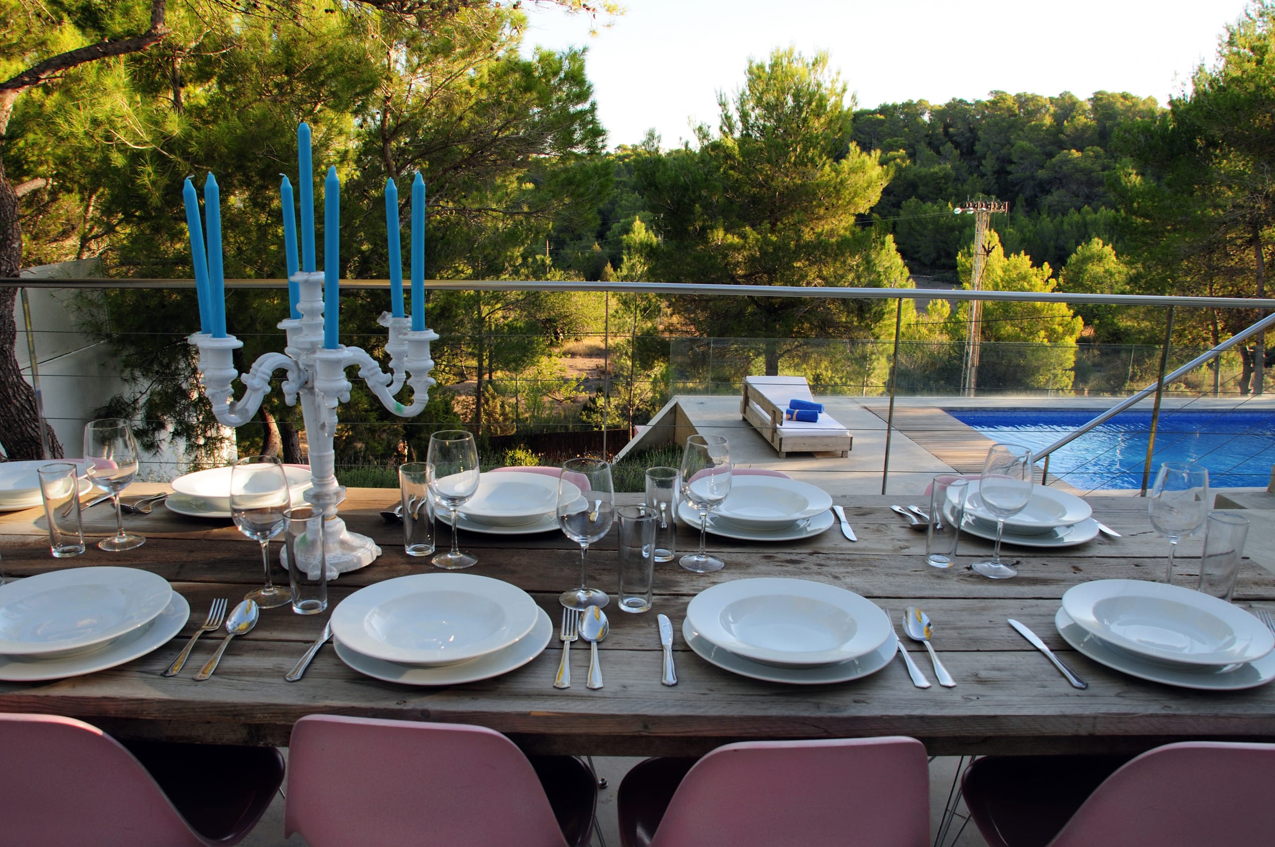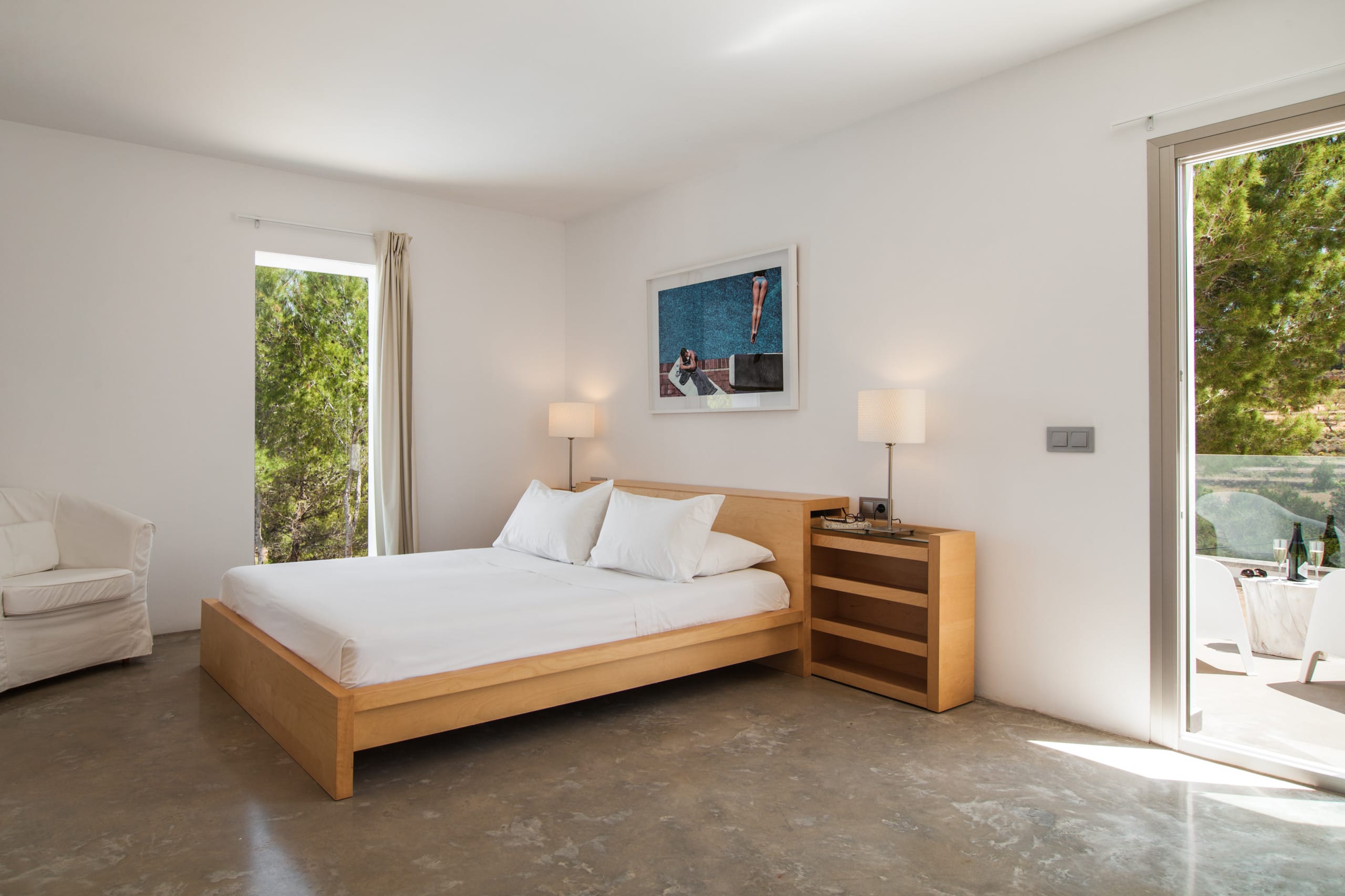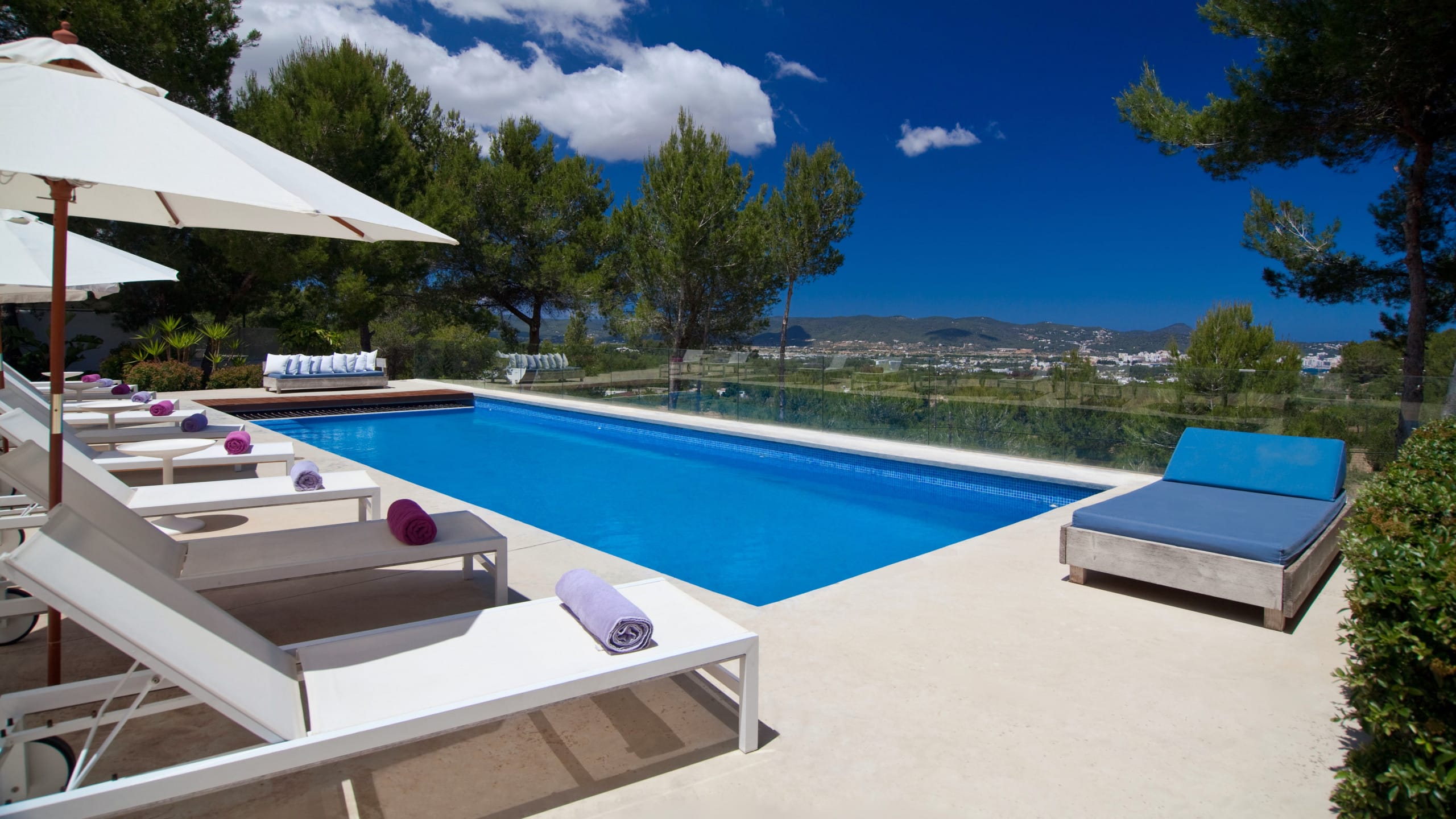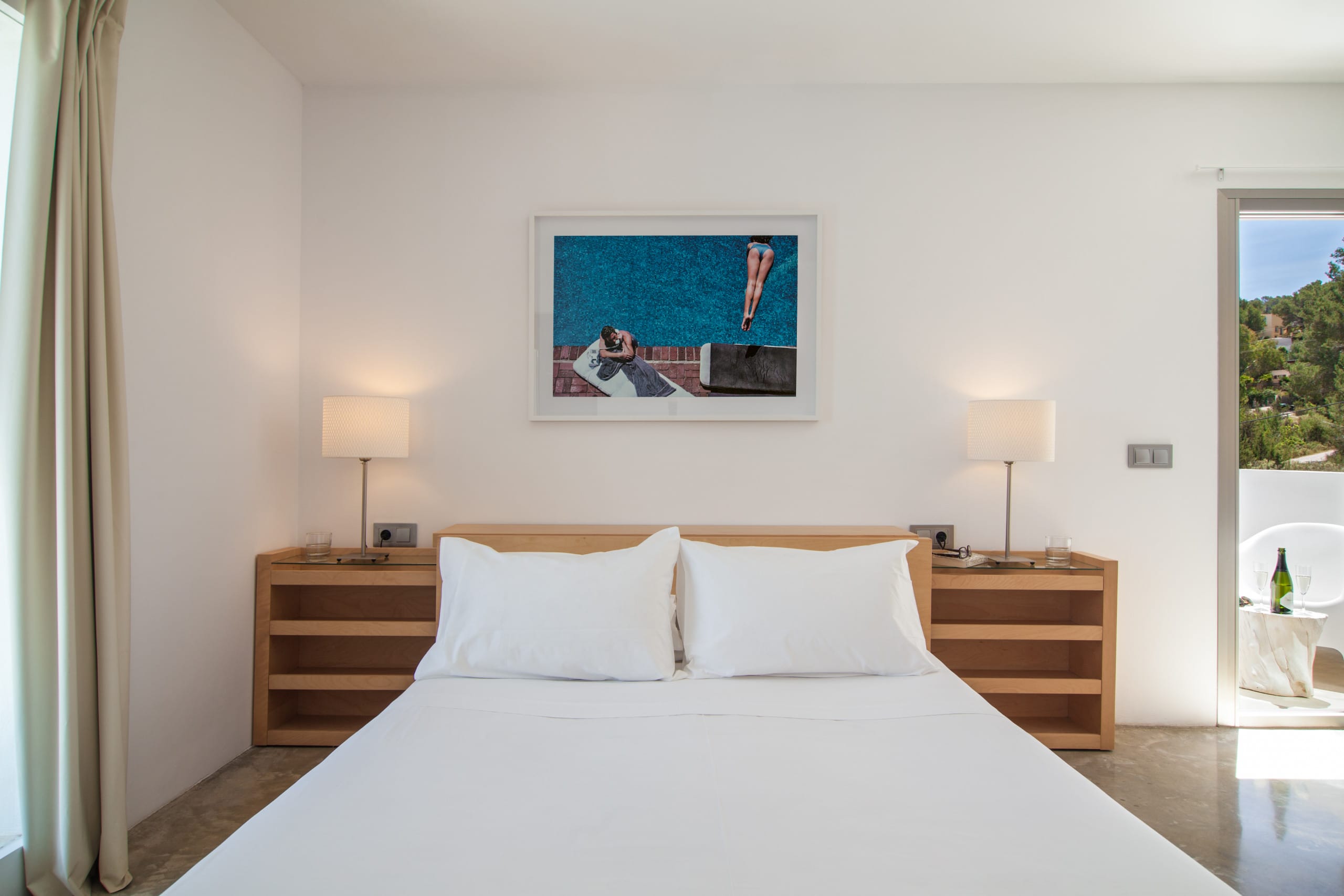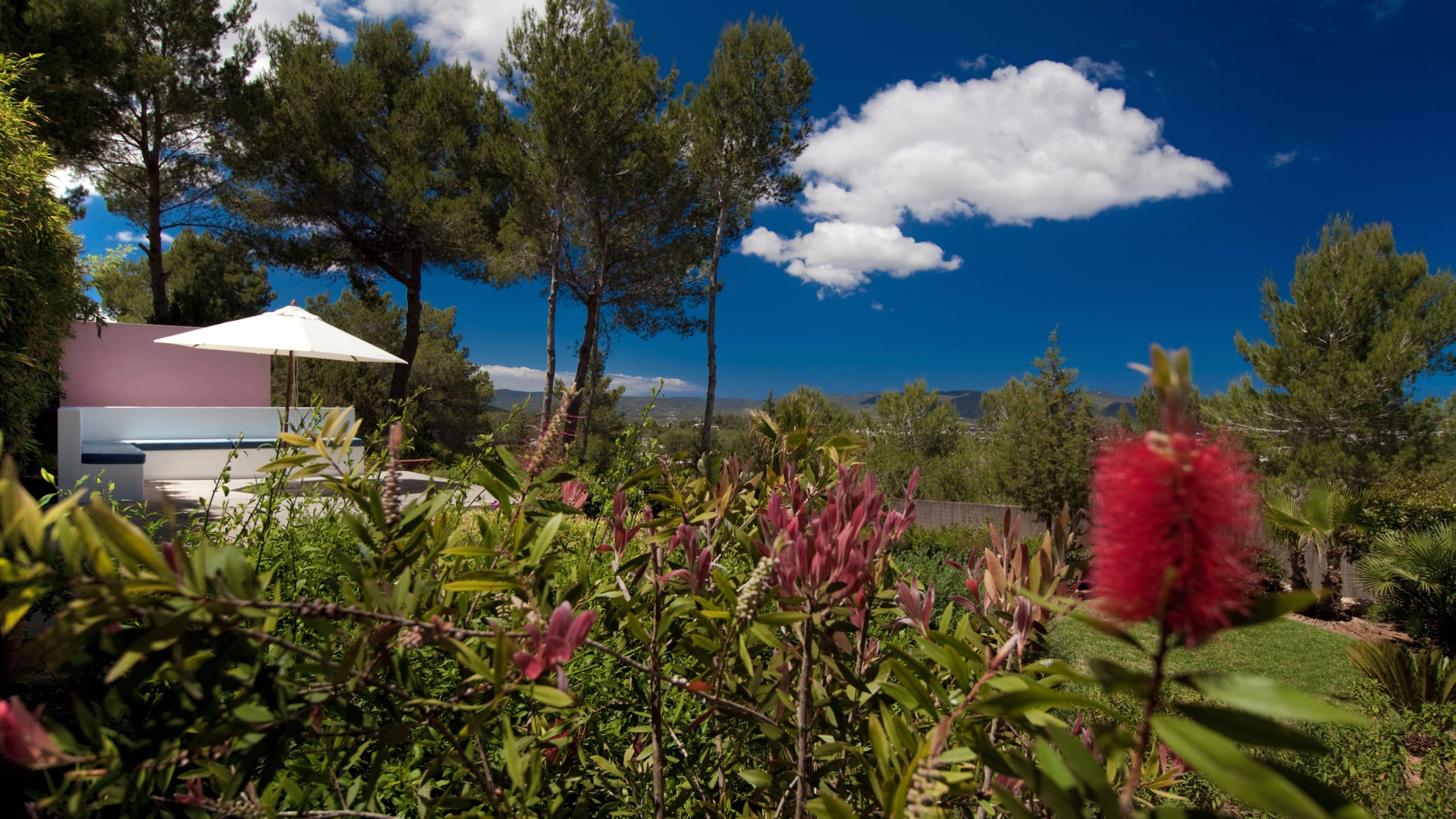 In this villa, there are six bedrooms and each one has its own bathroom. The house is both private and intimate because there are a lot of well-designed rooms and large common areas all over the house and the grounds. Building area 400 m2, land 2,600 m2. The villa is on the west side of Ibiza, near San Agustin. It’s about a five-minute drive to San Jose and 15 minutes to Ibiza town and the airport, so it’s easy to get around.