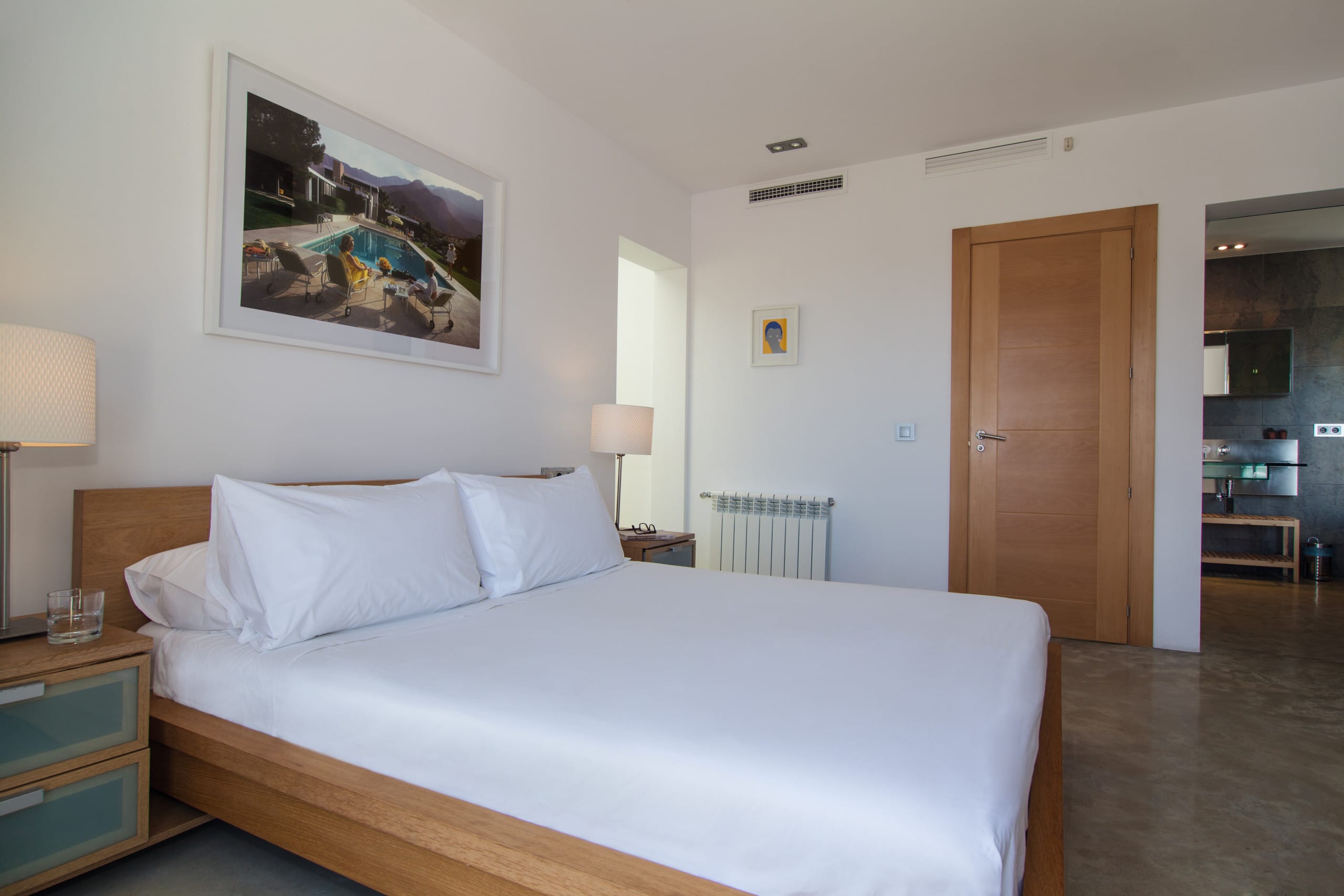 The master bedroom has a king-sized bed and an ensuite slate bathroom with a concrete tub and a two-person rain shower. The bathroom opens to a private wrap-around terrace with stunning views of the surrounding hills and the harbour. It also comes with a 42-inch plasma TV (Sky TV) and a DVD player, too.