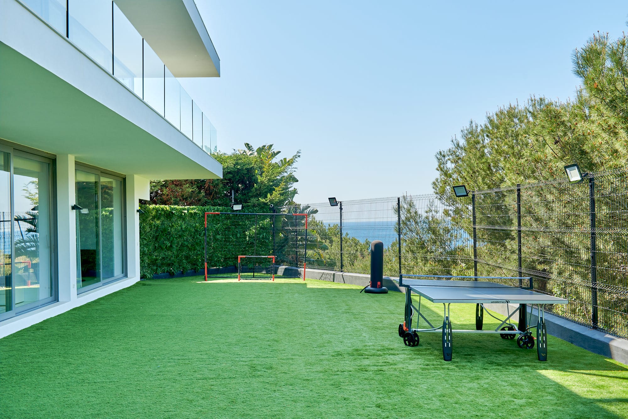 The lower level features a fitness center, billiards room, table tennis, and three suites, while the top terrace features sofas and a dining table, making it ideal for sunset cocktails or dining with spectacular views of the gardens, pine forest, and sea.