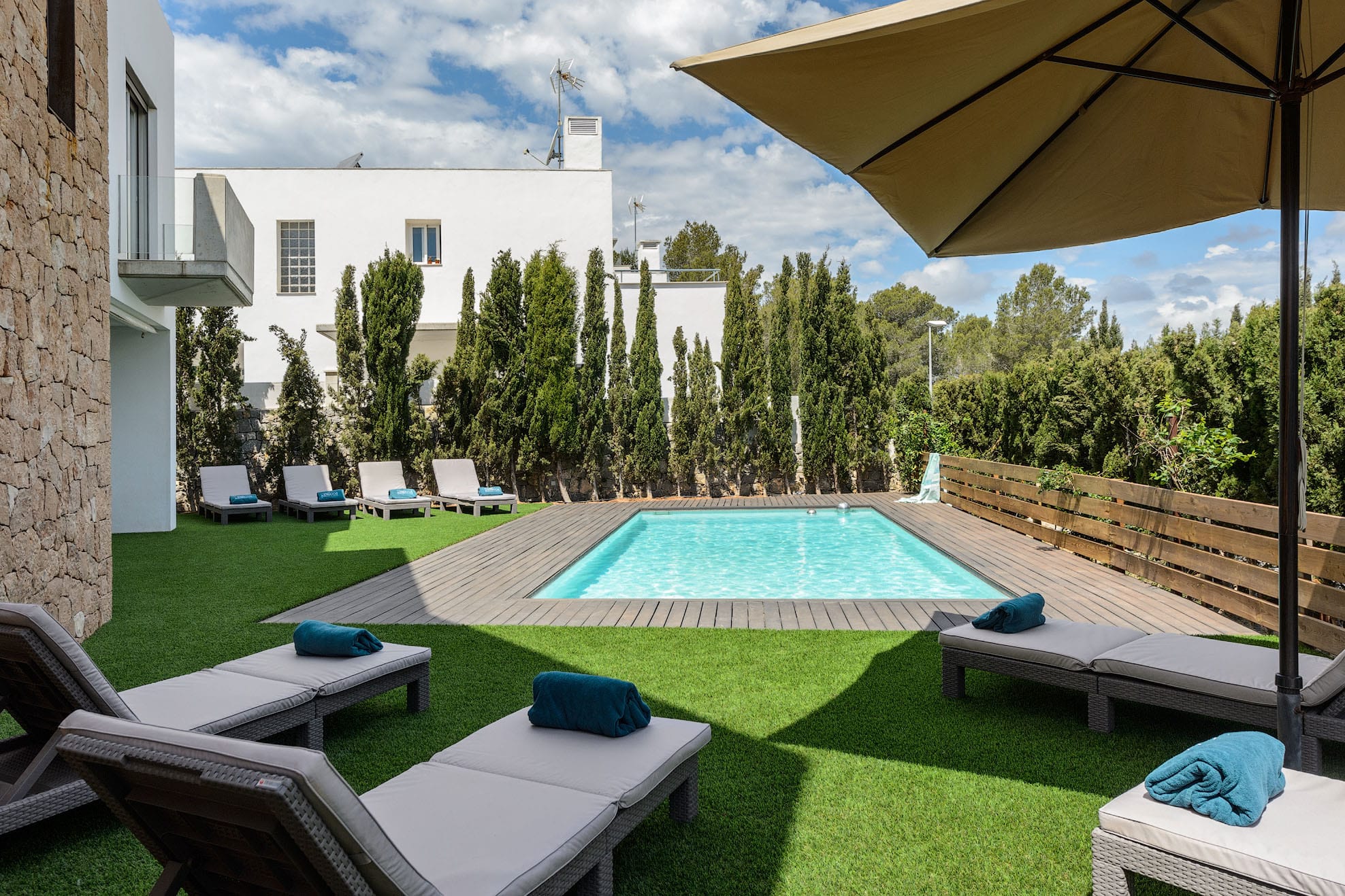 -Garage: From the house, you can go to a gym and park your car with an automatic door. With a pool and a wooden deck on the main terrace: As many hammocks as there are people on them. Large table for 8 people.