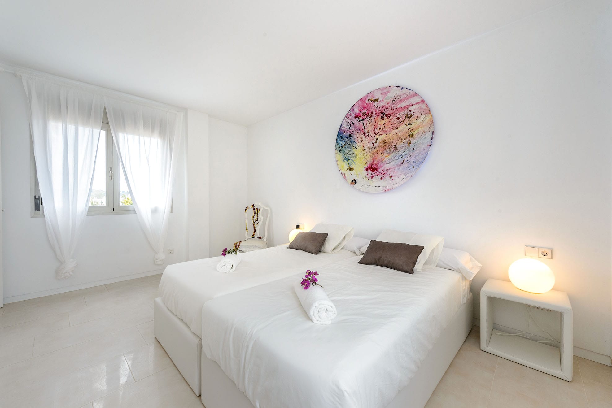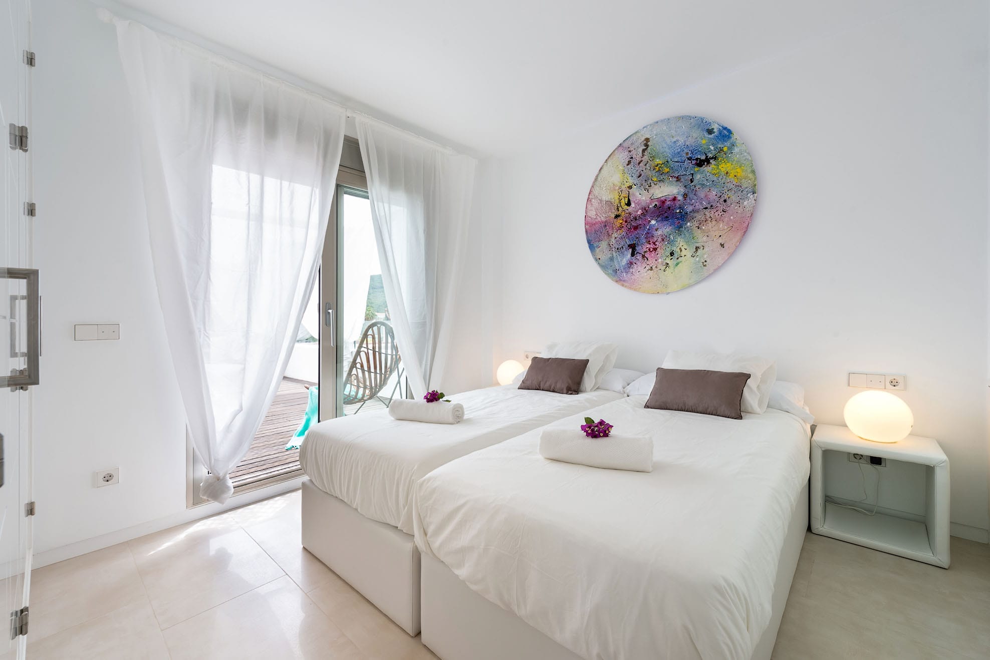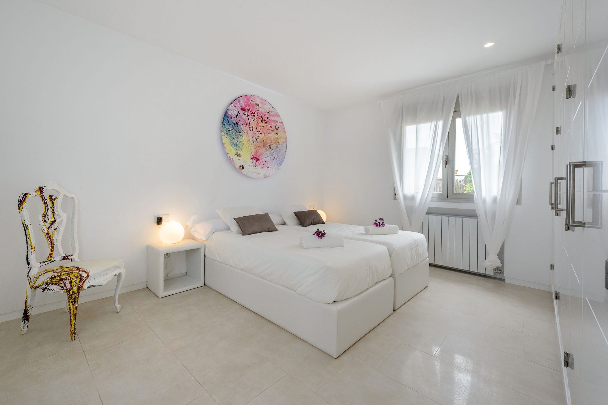 Two single beds that can be turned into a double bed, wardrobes, and a door that leads to the terrace where you can chill out. -Bathroom with double sink and bathtub. A double bed can be made out of two single beds. Wardrobe. A 2x2m bed, en-suite bathroom and TV in the bedroom.