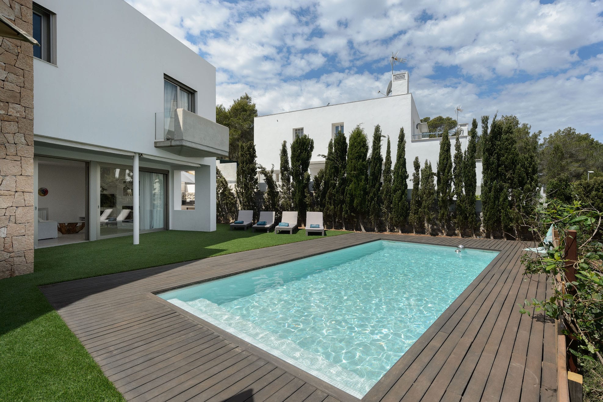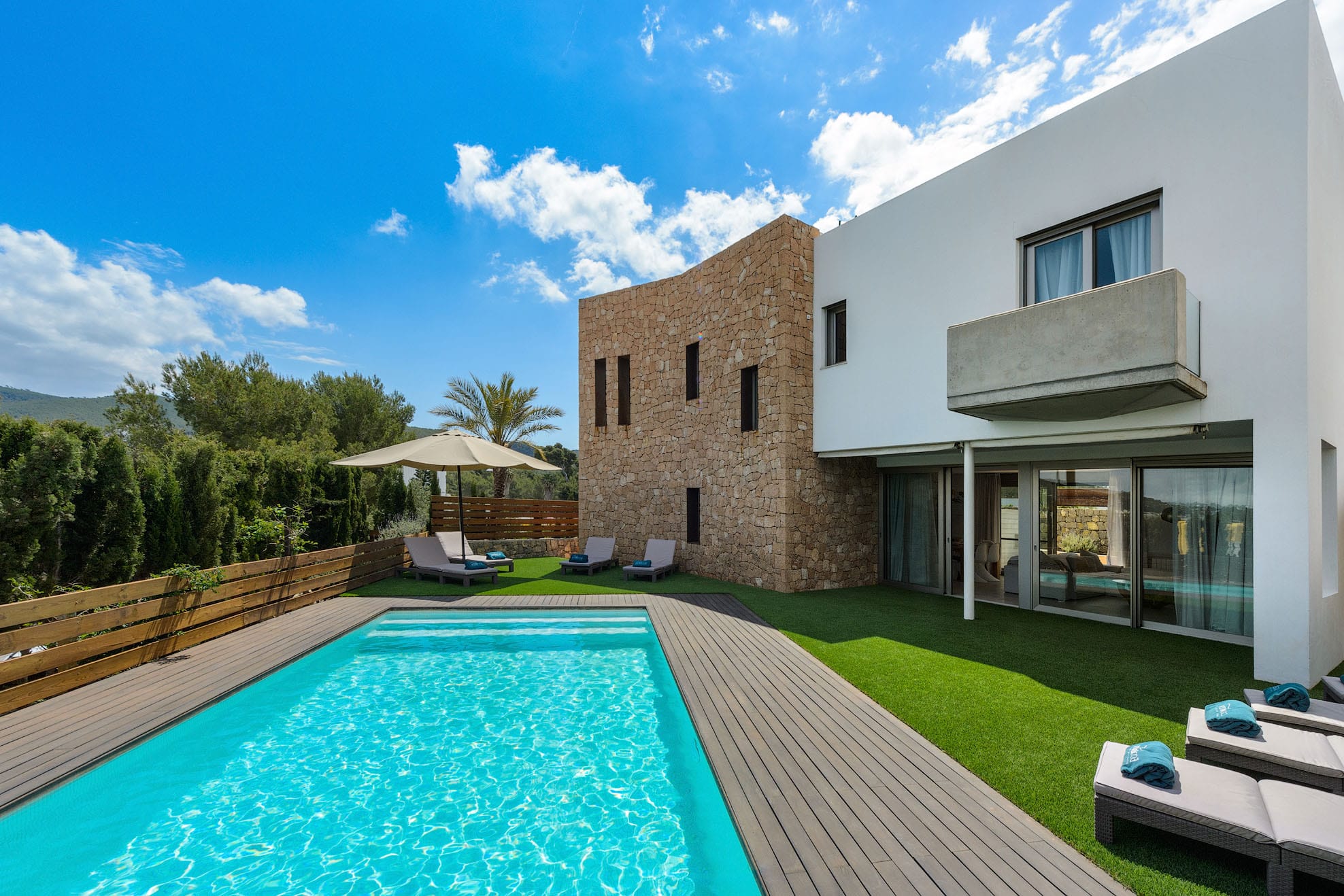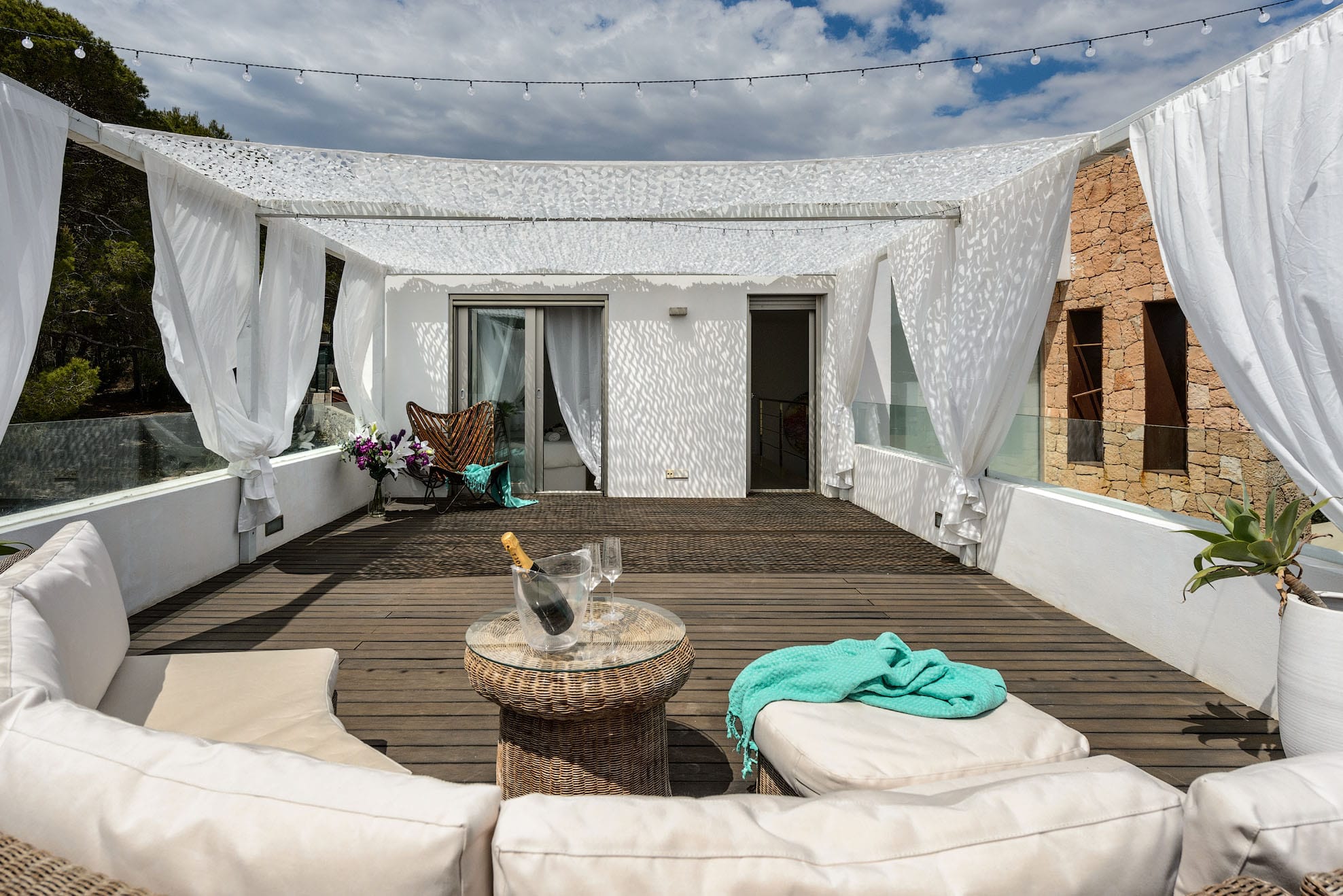 Villa of new construction with 320m2 of space on a plot of 800m2. It has a minimalist interior design and is 3 km from Ibiza and 8 km from the beautiful beaches of Las Salinas and Es Cavallet. It is also close to the most popular discos. Families with kids will love this. A beautiful pine forest is behind the house.