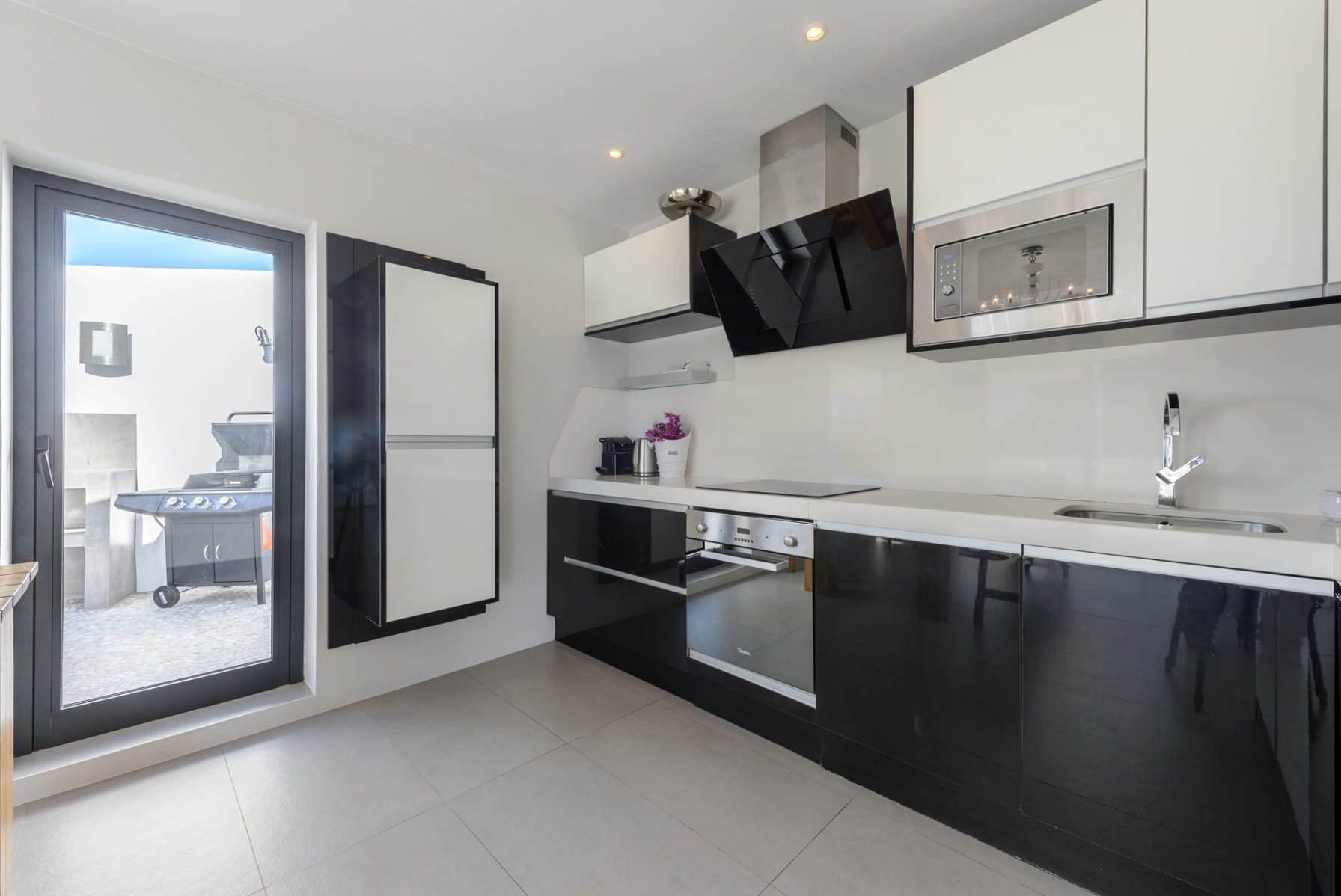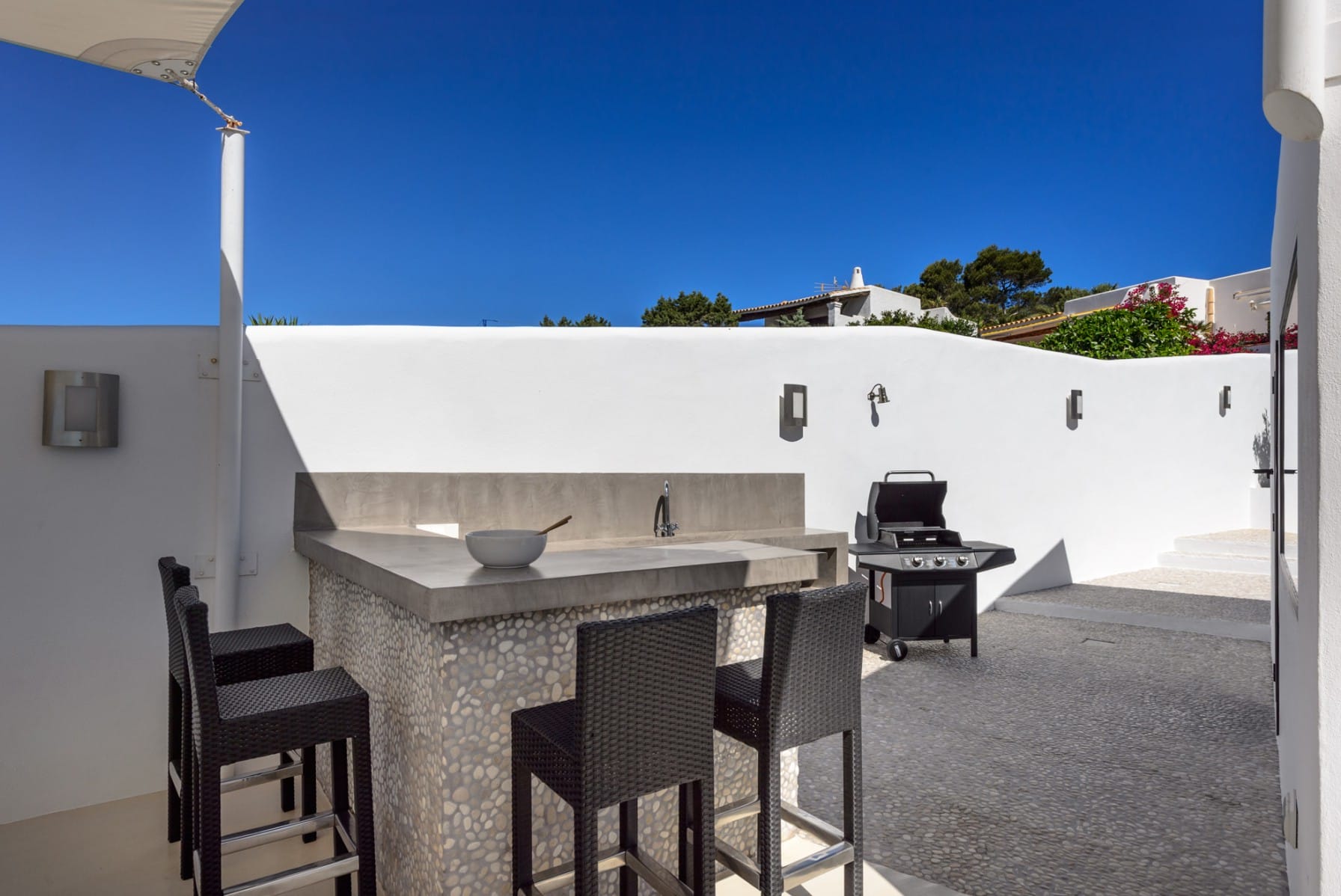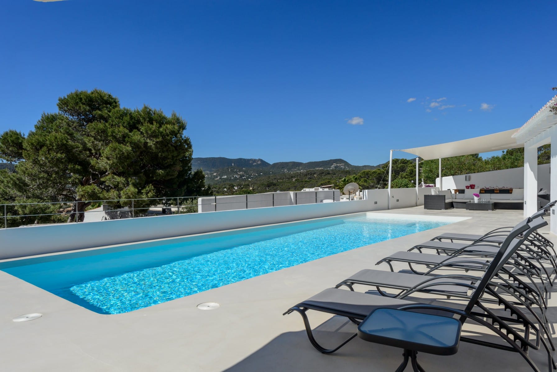Outside: 12×4 private pool Large patio with a chill out area. Summer kitchen with a 12-person table and a BBQ. Outdoor eating area that is covered. Sunbeds for a total of 12 persons. Outside shower.