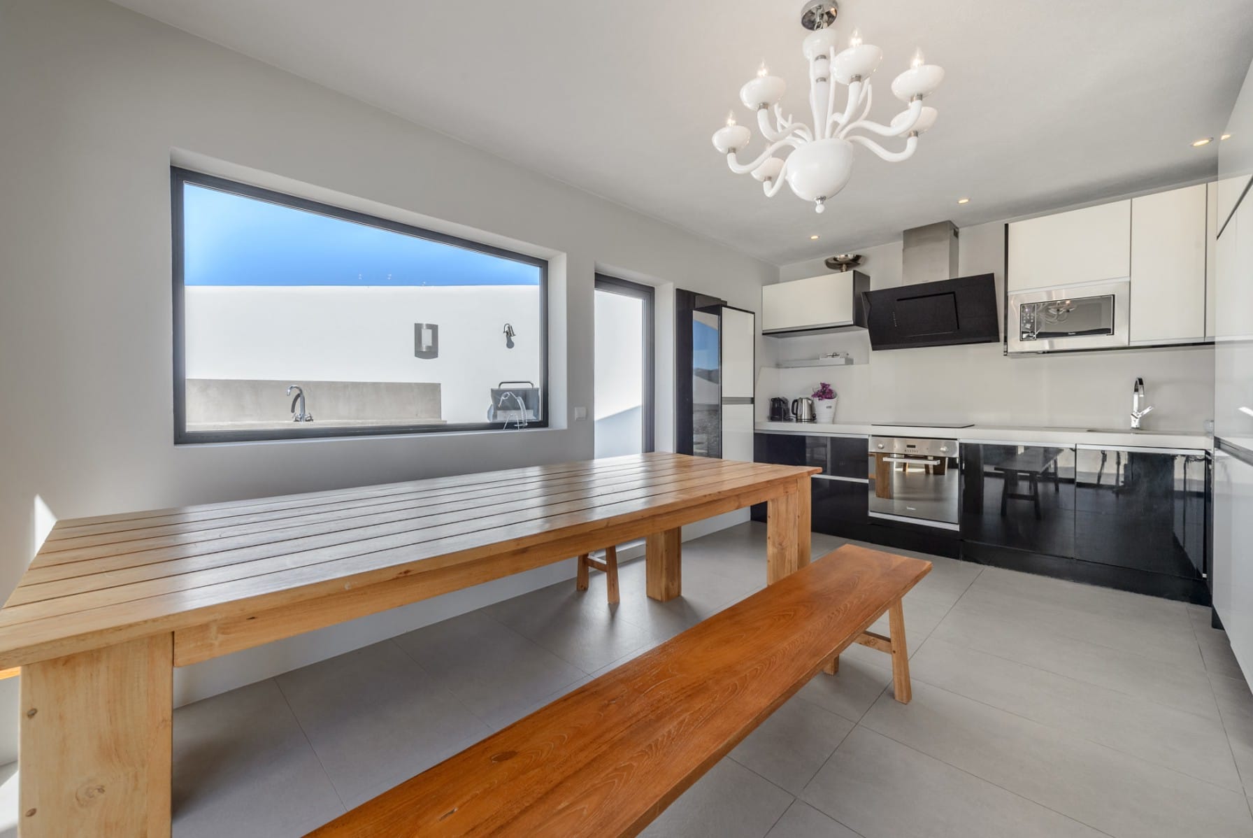 The spacious living area features a television, radio with an iPod docking station, and access to the main patio. Kitchen is well-equipped with a variety of equipment and has a large dining table and access to the outdoor terrace.