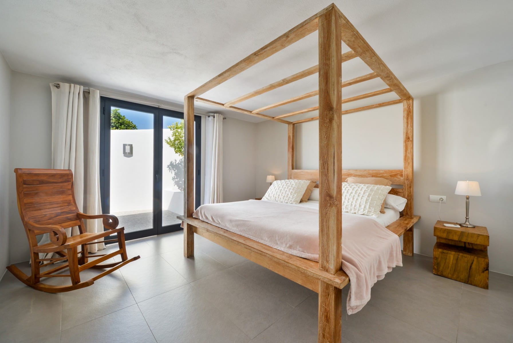 2 double bedrooms, each with a 180×2 bed and an en suite bathroom with a shower. Both feature outside patios.