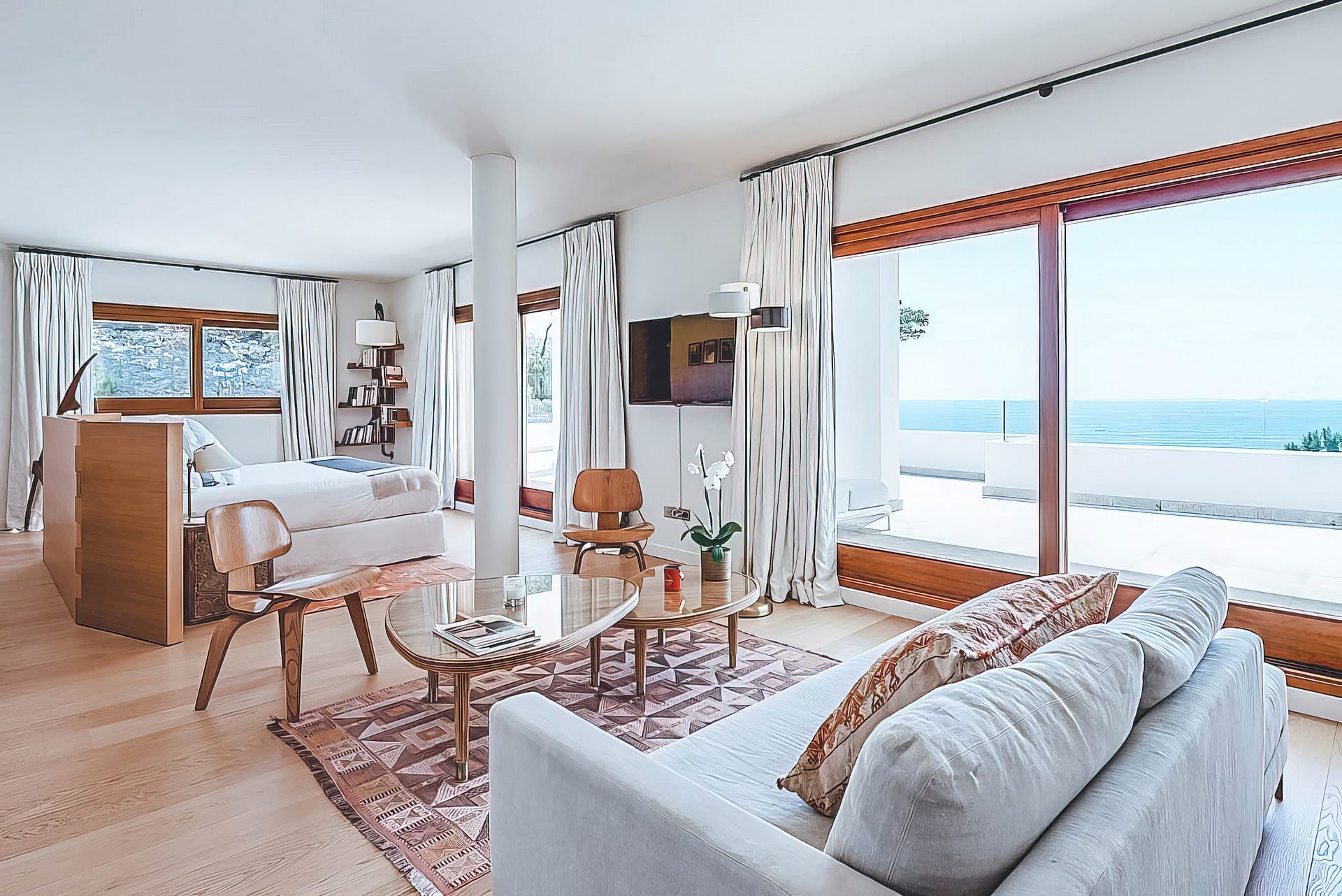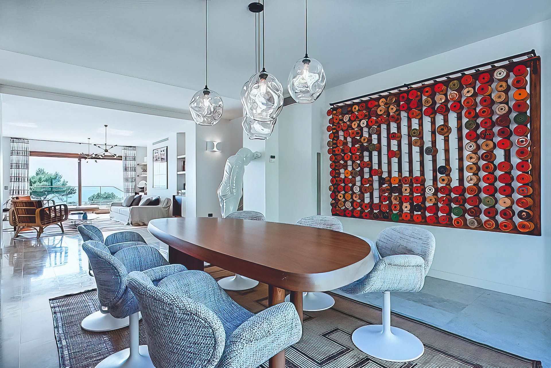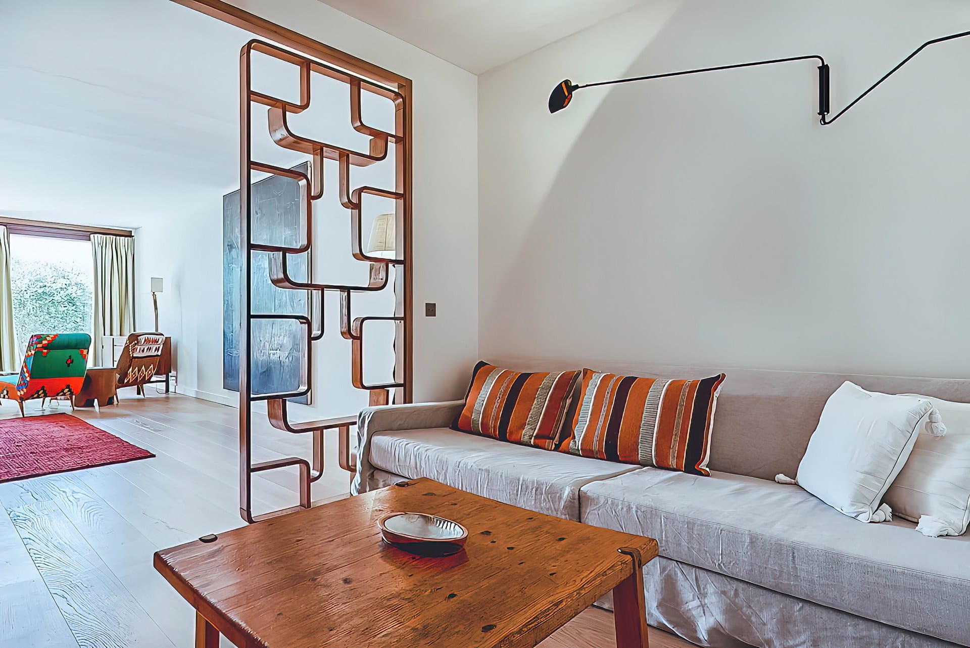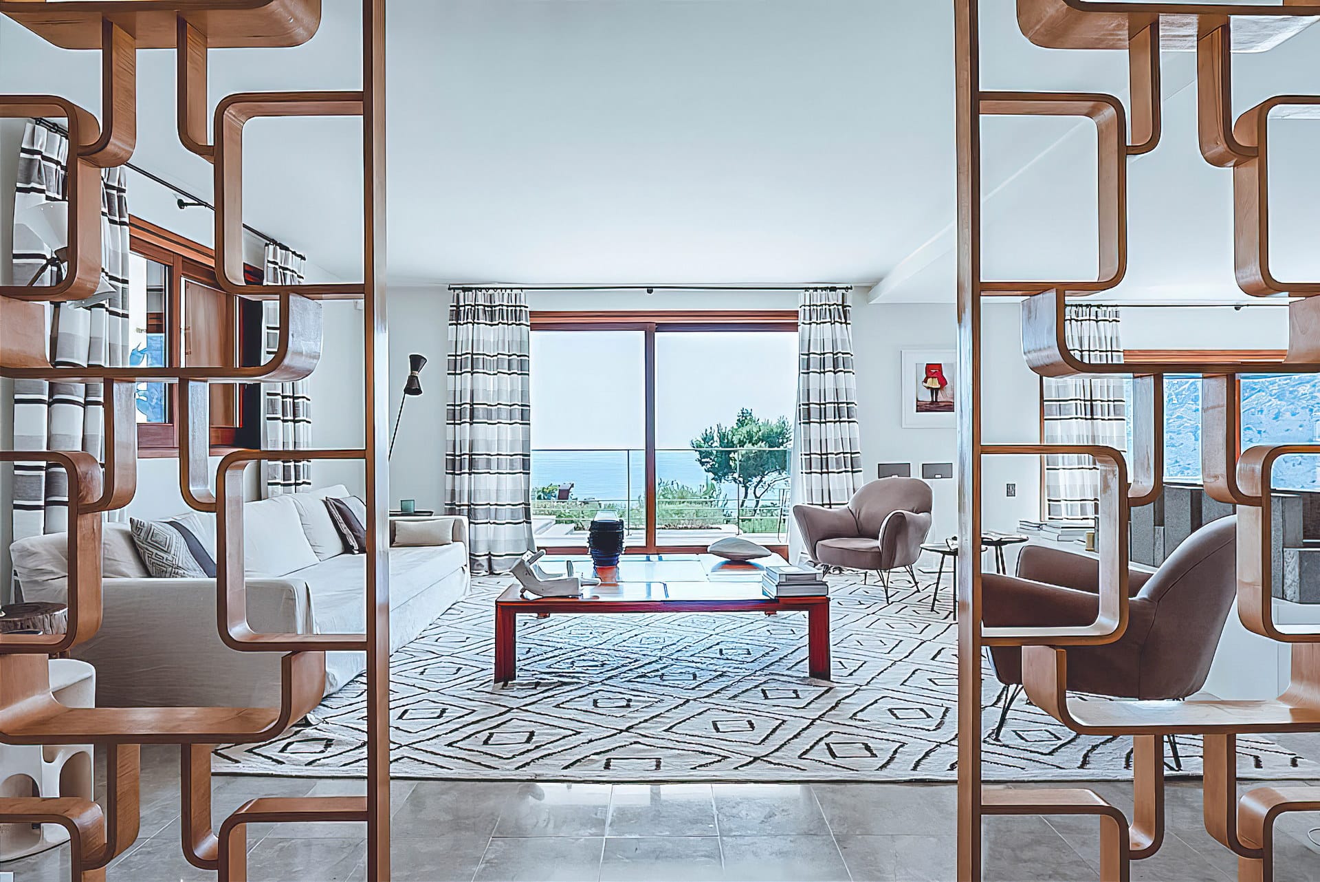 The living areas of Villa Guigi are exquisitely appointed, with floor-to-ceiling windows allowing natural light to stream in. The big, open-plan living area is split over two levels and furnished with welcoming sofas, exquisite furnishings, and tasteful artwork that contribute to the sense of style and refinement that permeates this lovely property.