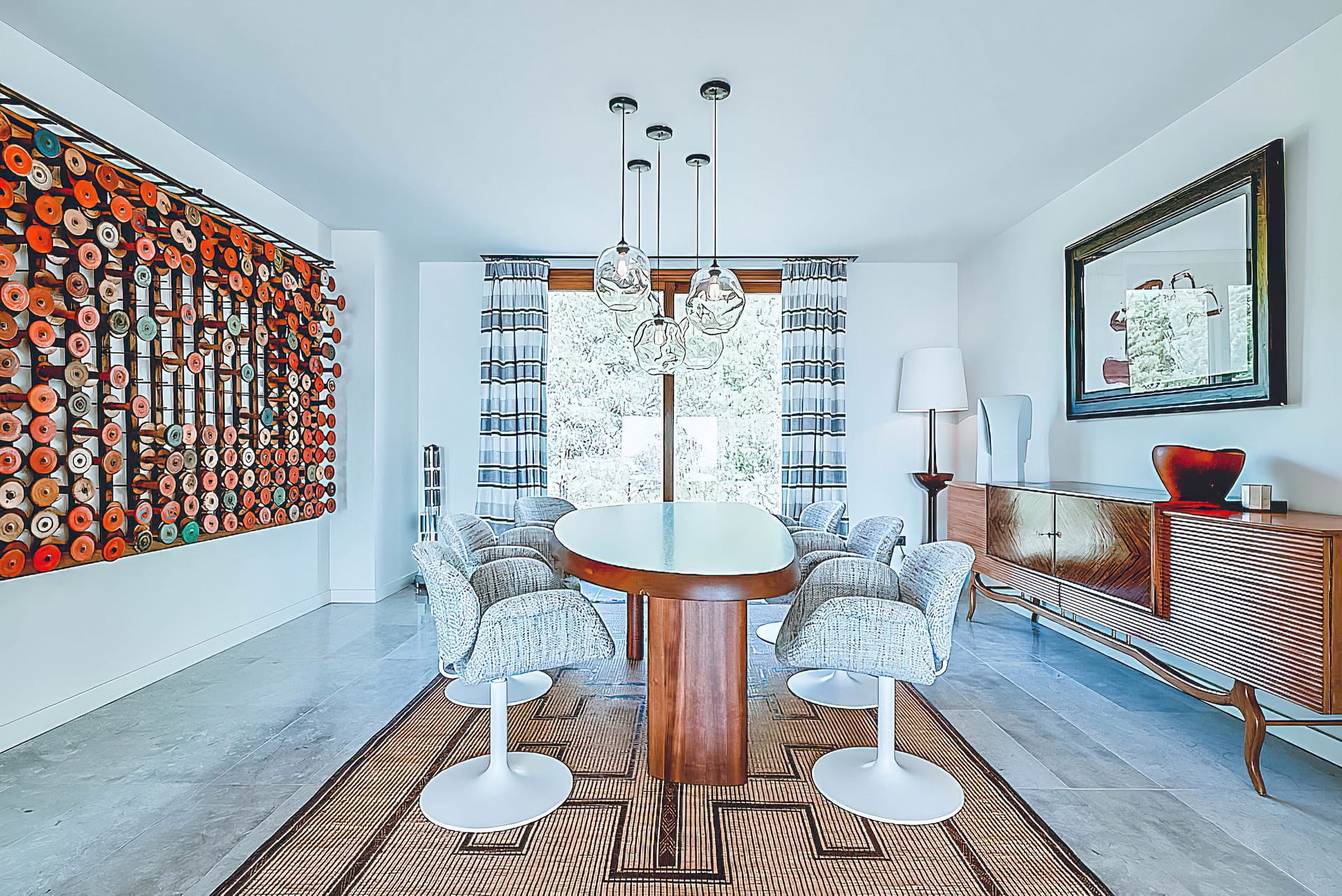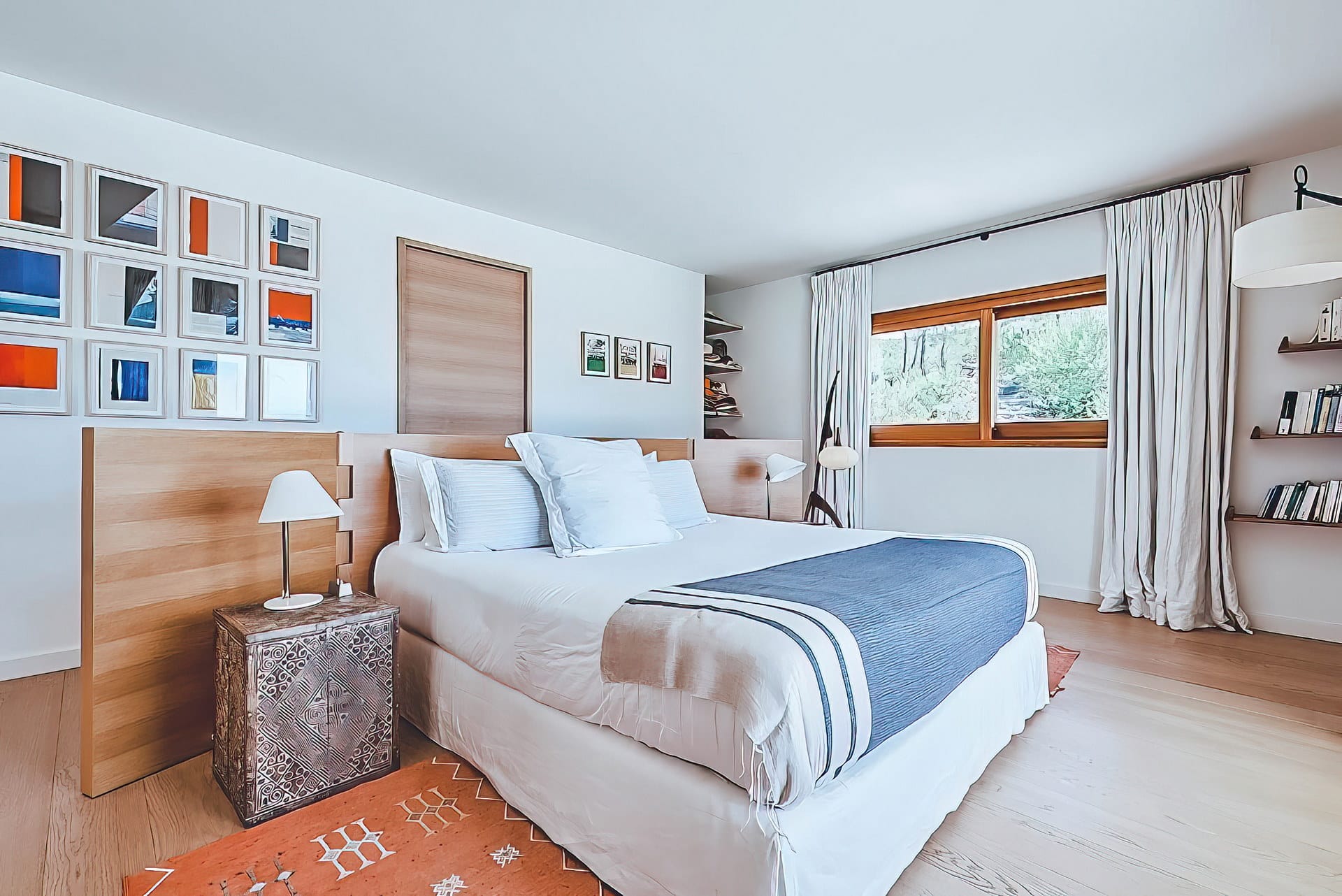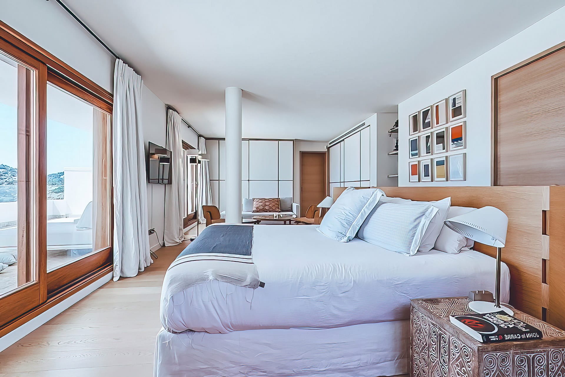The living areas of Villa Guigi are exquisitely appointed, with floor-to-ceiling windows allowing natural light to stream in. The big, open-plan living area is split over two levels and furnished with welcoming sofas, exquisite furnishings, and tasteful artwork that contribute to the sense of style and refinement that permeates this lovely property.