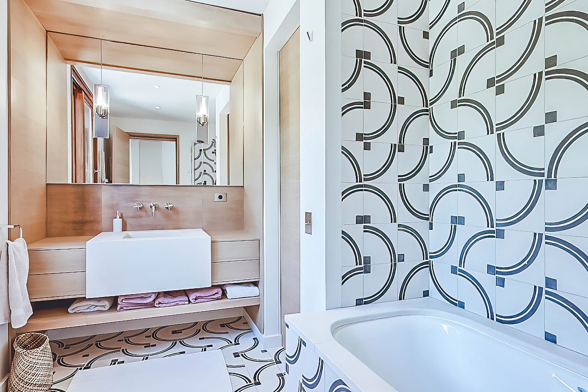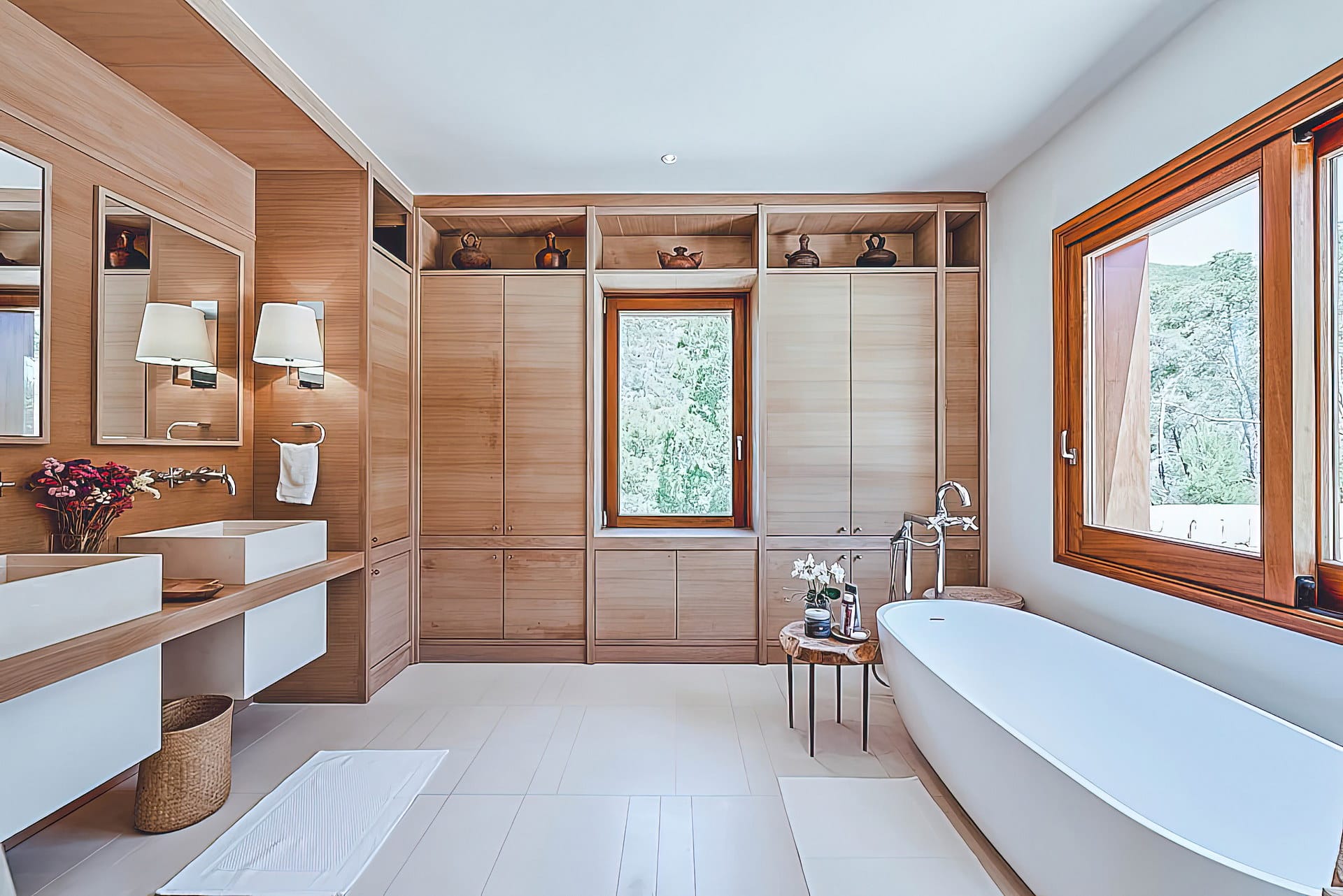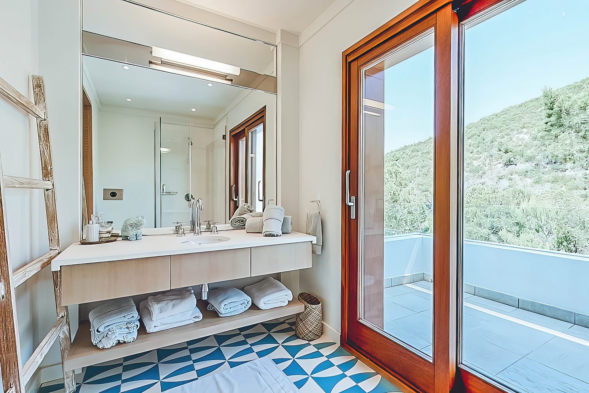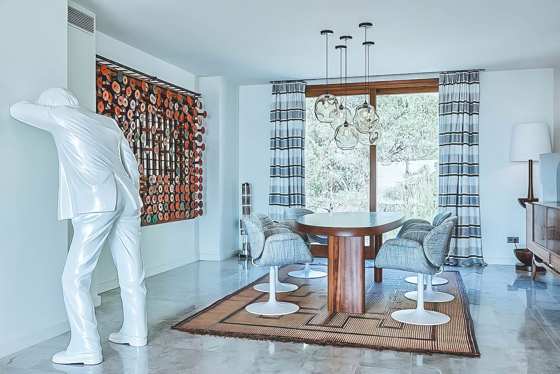 The living areas of Villa Guigi are exquisitely appointed, with floor-to-ceiling windows allowing natural light to stream in. The big, open-plan living area is split over two levels and furnished with welcoming sofas, exquisite furnishings, and tasteful artwork that contribute to the sense of style and refinement that permeates this lovely property.