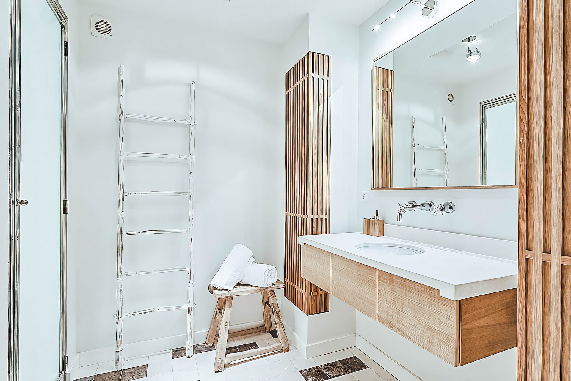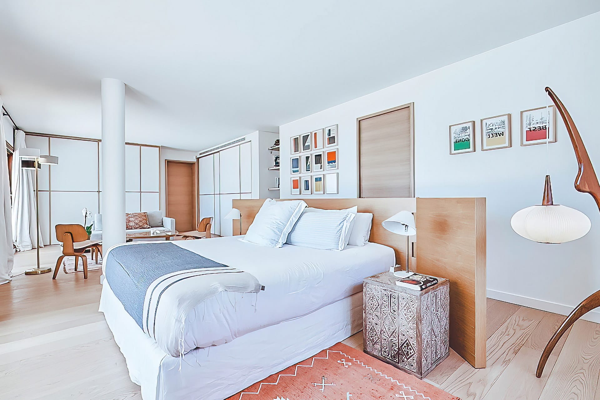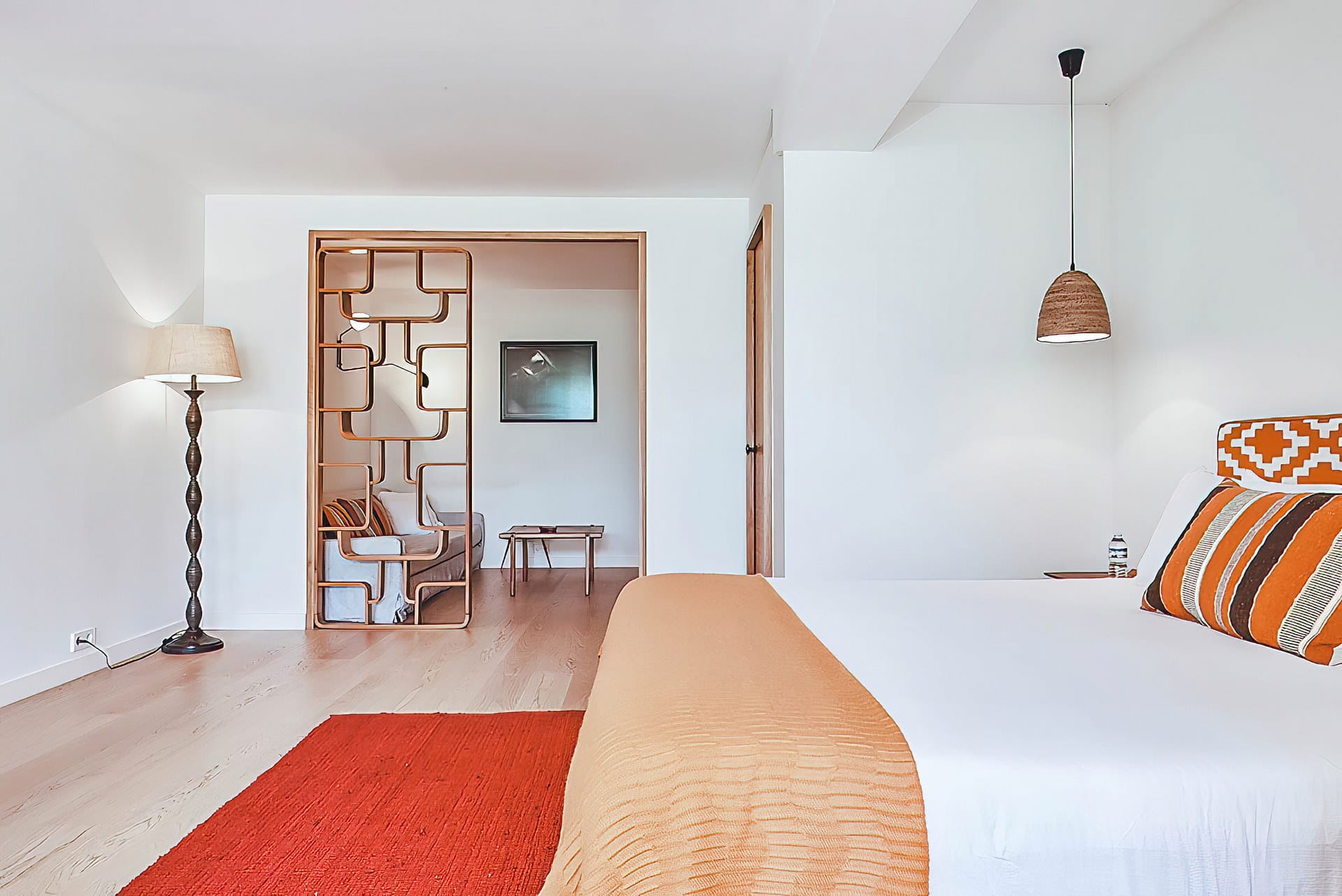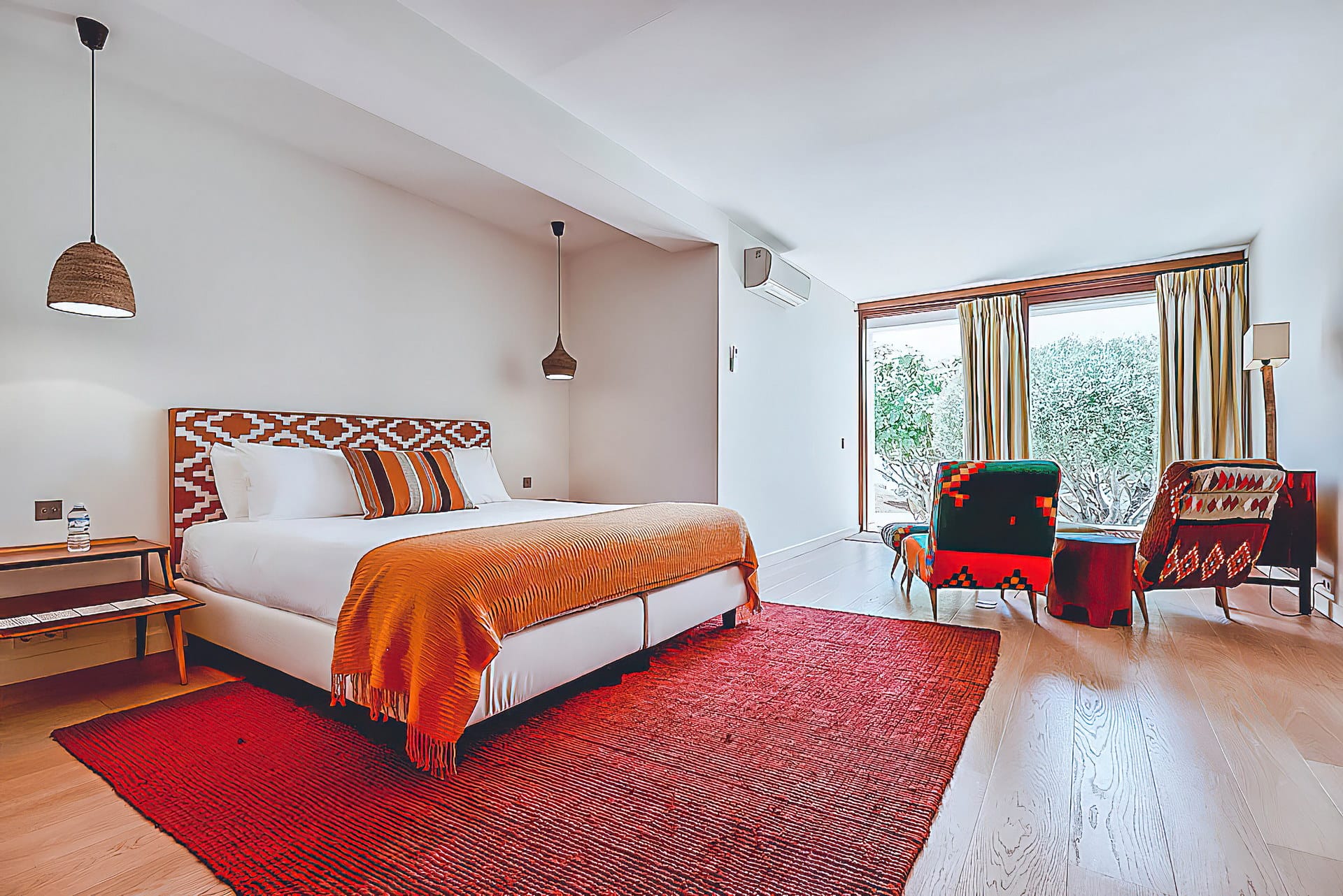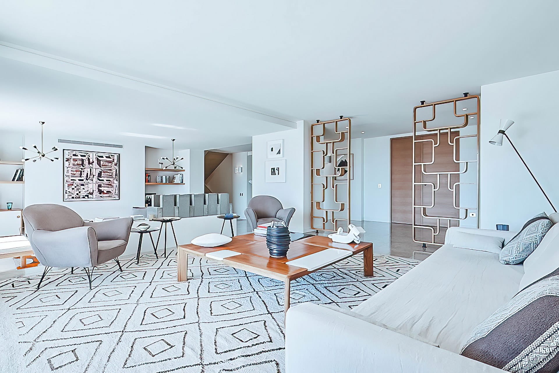 The retro furniture from the 1950s and 1970s coexists in great harmony with the contemporary architecture. The kitchen is fully equipped and incorporated into the open-plan living space. All of the rooms have en suite bathrooms, and two of them have private terraces.