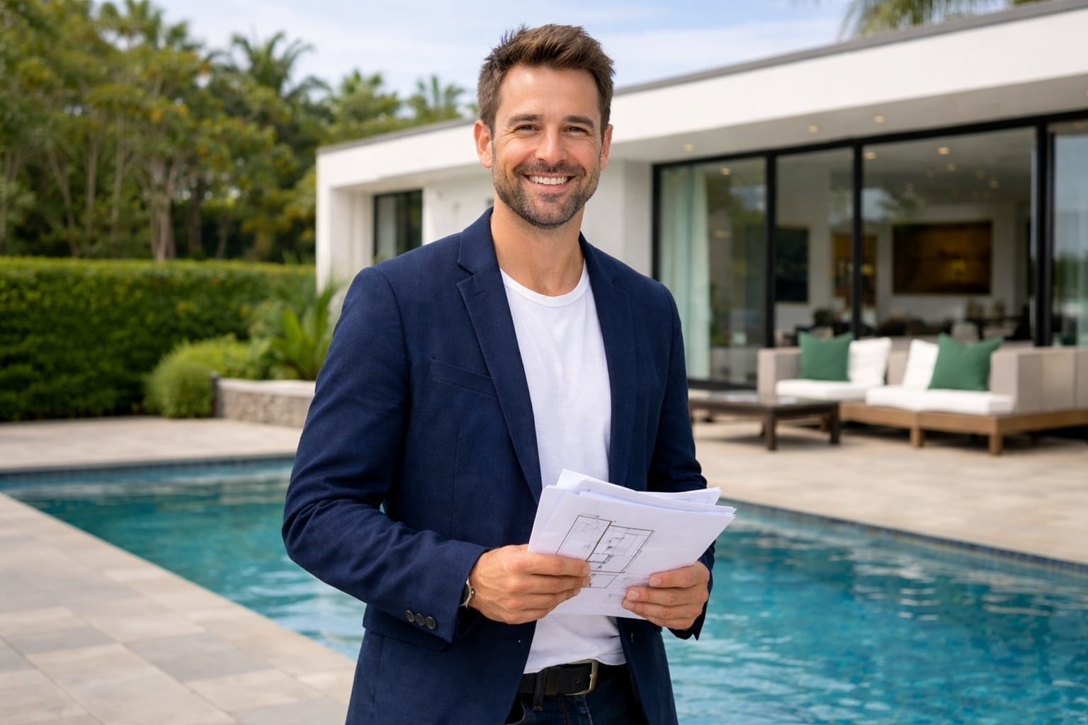 The home has four bedrooms with private bathrooms and one additional bathroom.