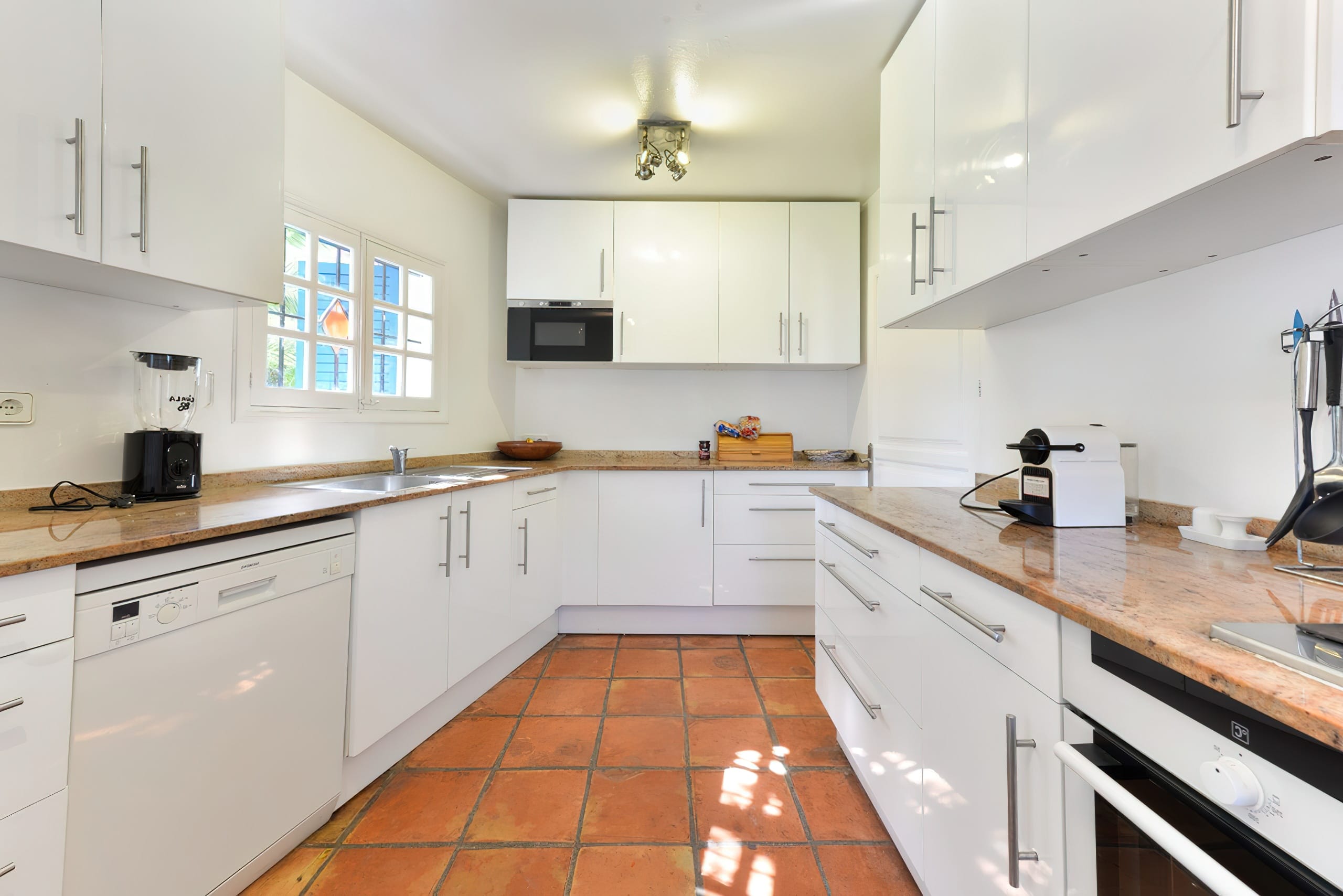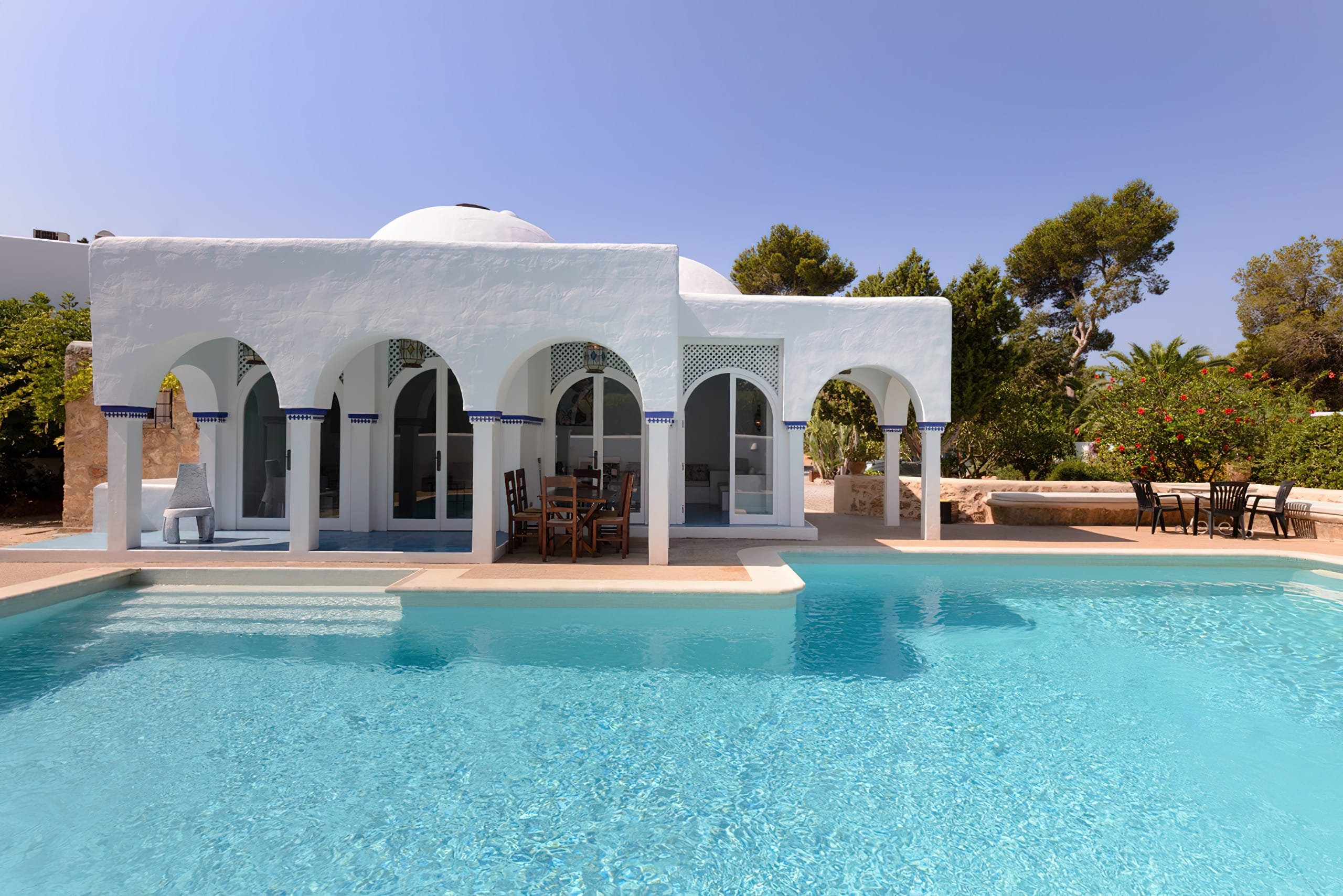 The expansive outside space features many terraces on two levels, a large swimming pool with diving board, BBQ, and fish pond, as well as several chill-out spots where visitors may completely unwind. A highlight is the one-of-a-kind and stunning Moroccan-style domed ceiling pool house complete with music system and restroom amenities – ideal for private parties.