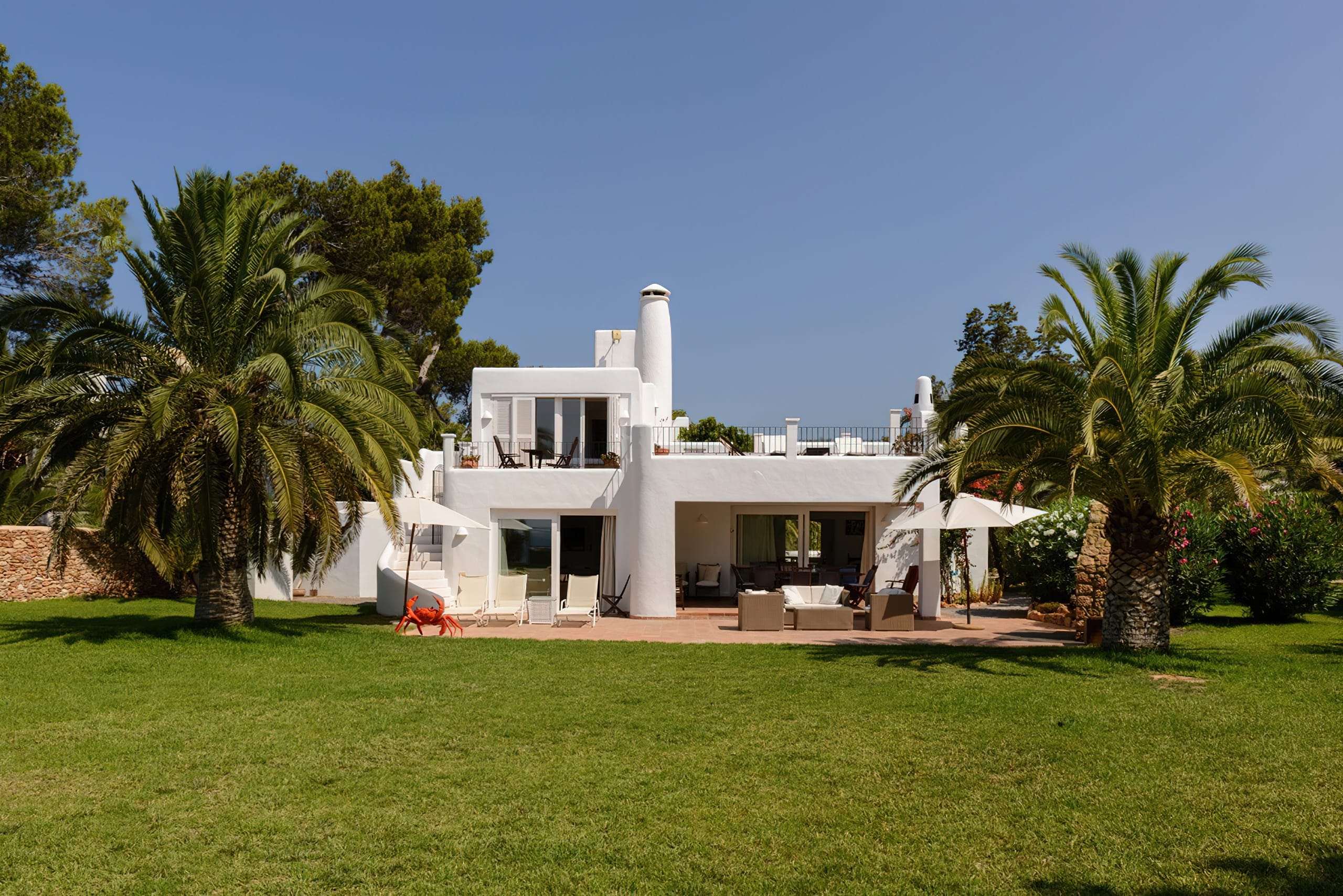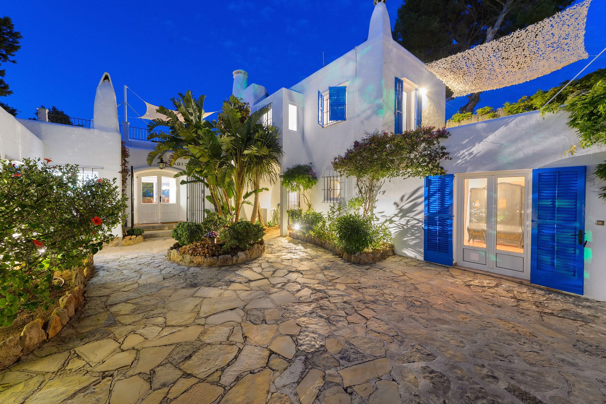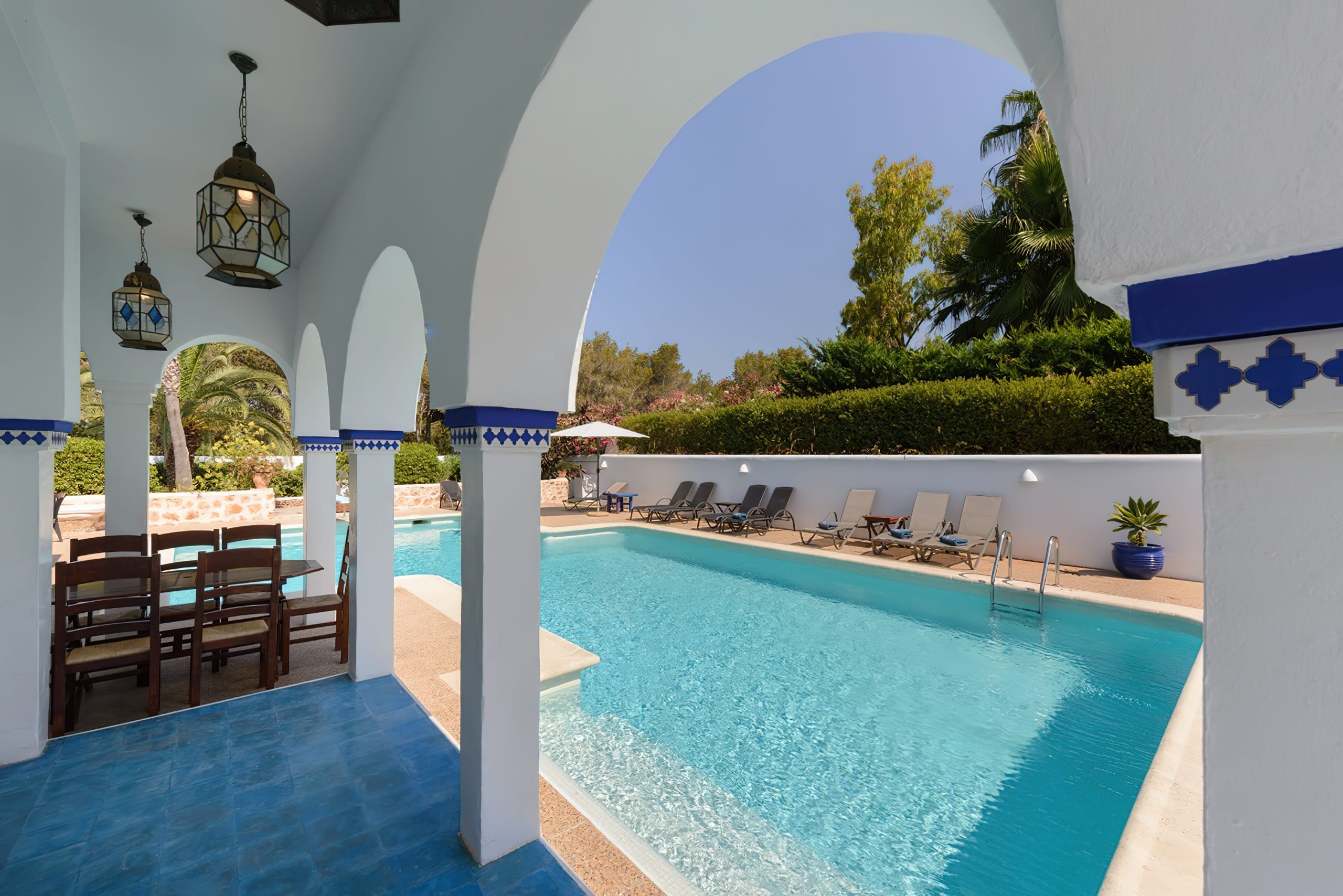 The traditional Ibizencan architecture is complemented by Moroccan characteristics, creating a wonderfully attractive house. All bedrooms and living spaces are equipped with central air conditioning. There are three televisions and complimentary wireless internet access. This magnificent property sleeps up to 16 people.