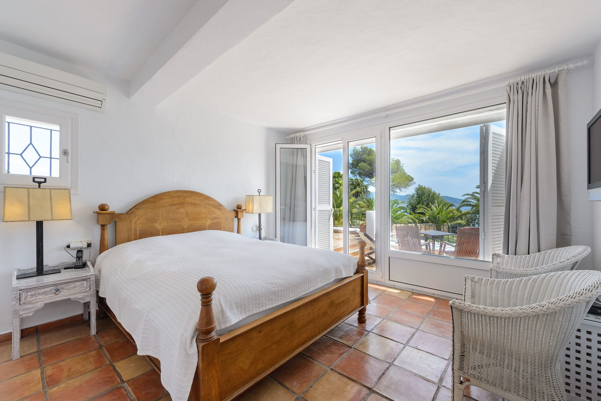 Bedroom 1: On the first floor, the master bedroom features a king-size bed, a television, and an en suite bathroom with a double sink and a walk-in shower. This bedroom opens out onto a spacious patio with an impressive garden and views of the sea.