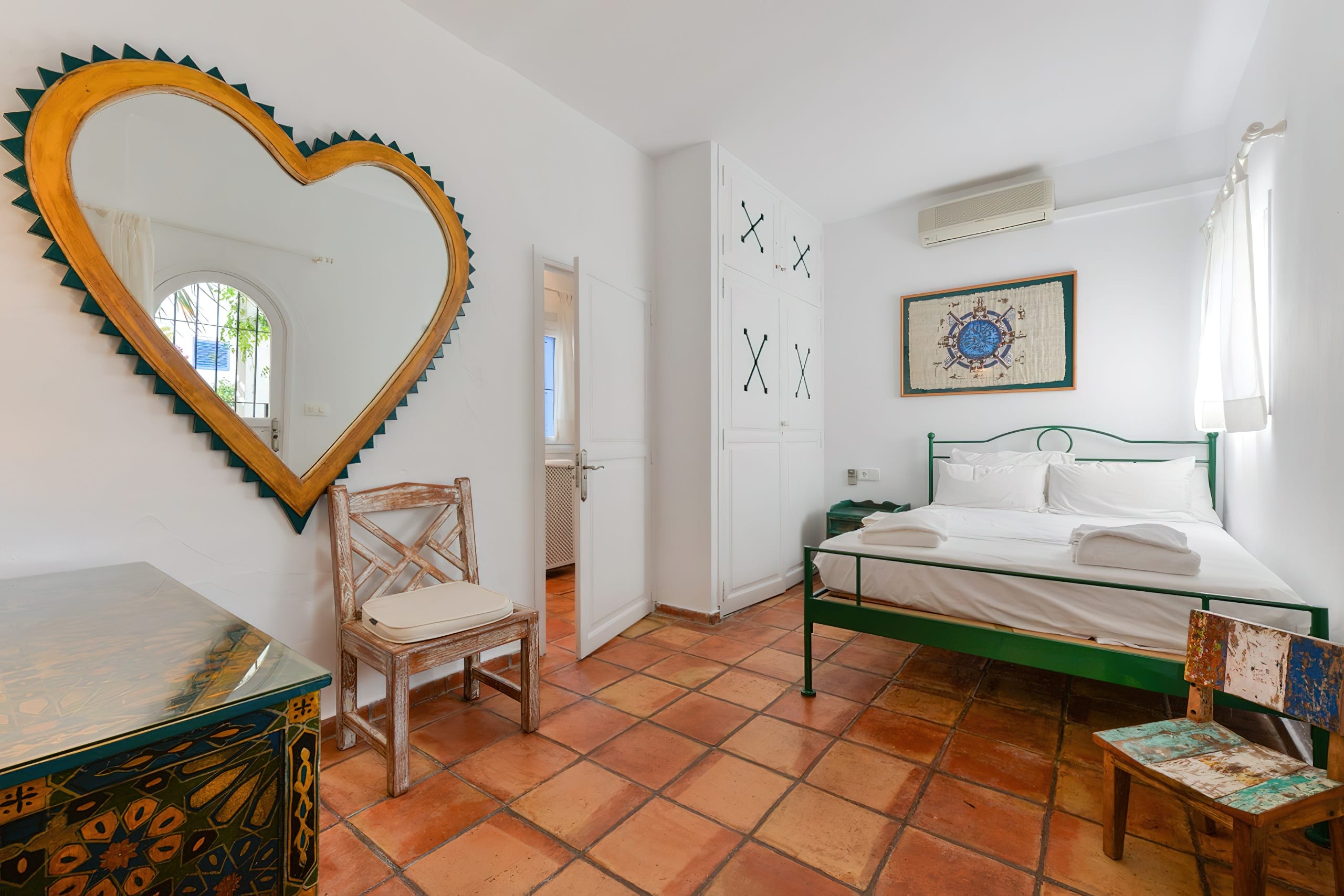 Ground floor bedroom with a double bed, a private bathroom, and a walk-in shower. Direct access to the courtyard at the main entrance.