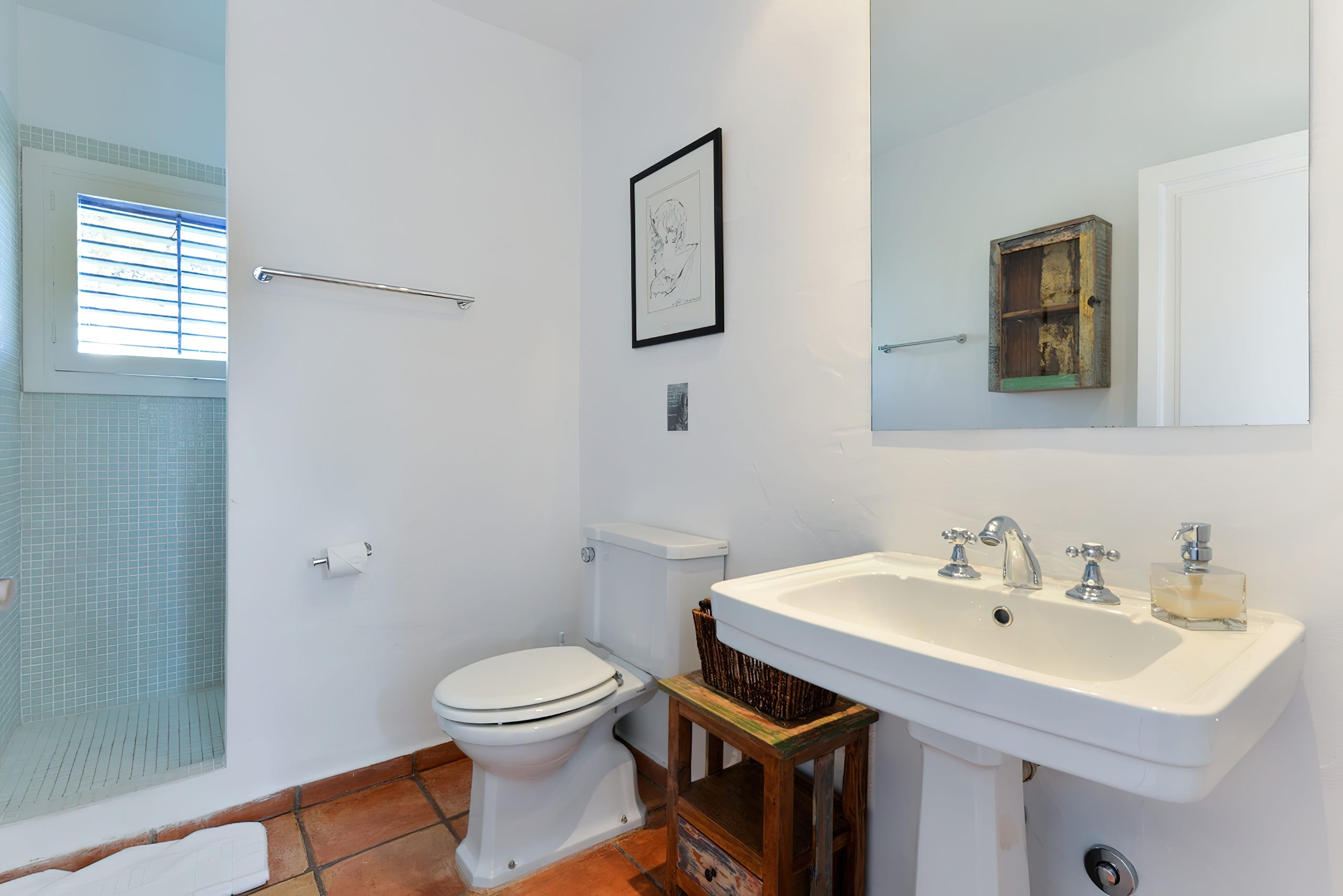 Bedroom 2 is located on the first floor and features two single beds as well as a private bathroom with a single sink and a walk-in shower. Additionally, this room features a private terrace.